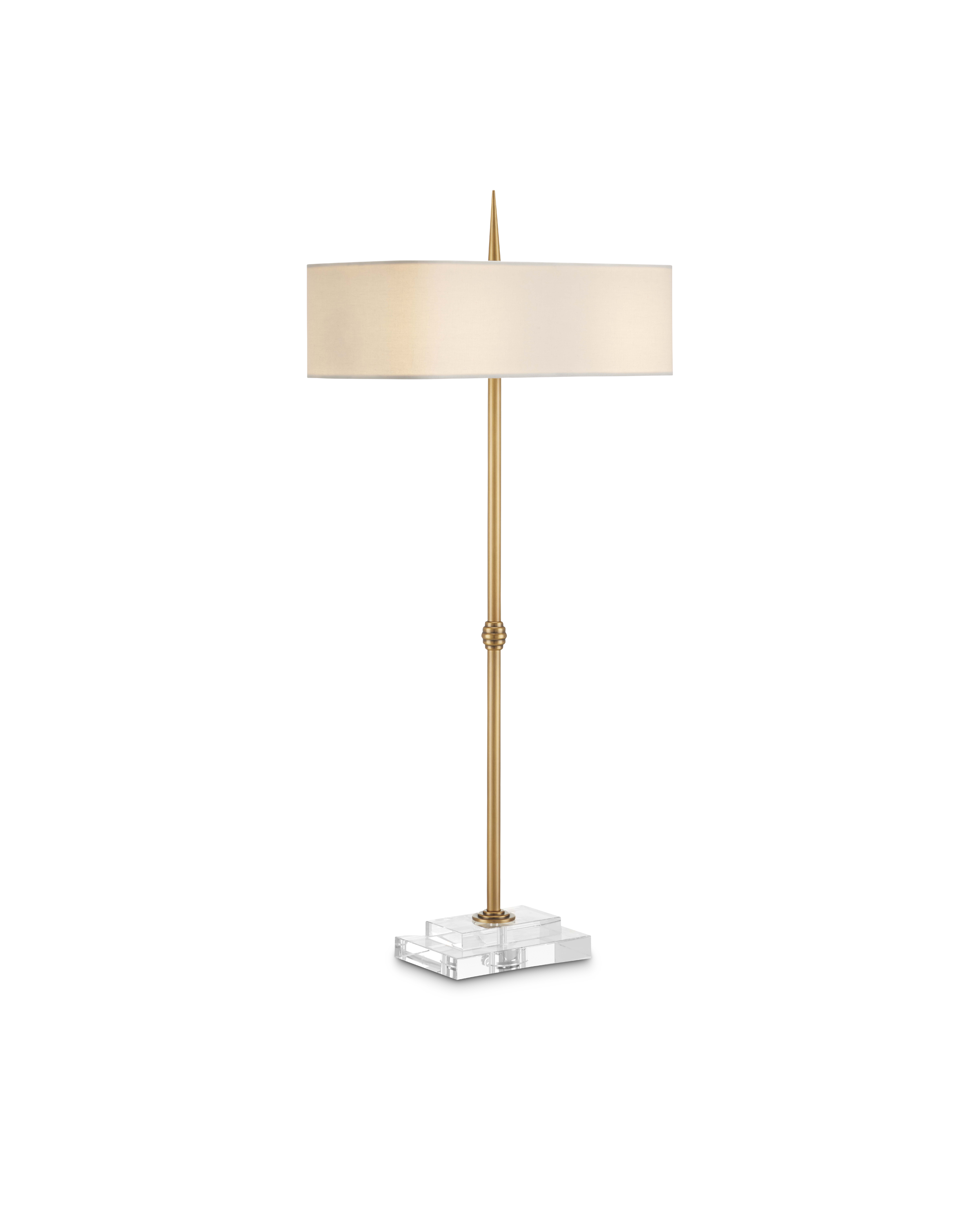 To celebrate the design prowess with which Tom Caldwell approaches all of his ideas, the Caldwell Table Lamp is officially one of his most classic. The architectonic stem that composes the slim profile has a bee-hive ornament at its middle point and culminates at the optic crystal base in three concentric rings that grow as they meet the stacked material. The pointed finial is a clever touch, as it looks as if the stem pierced the shade uninterrupted. Finishing the metal with an antique brass finish brings the gold table lamp warmth, as does the bone linen shade with its suave narrow profile.