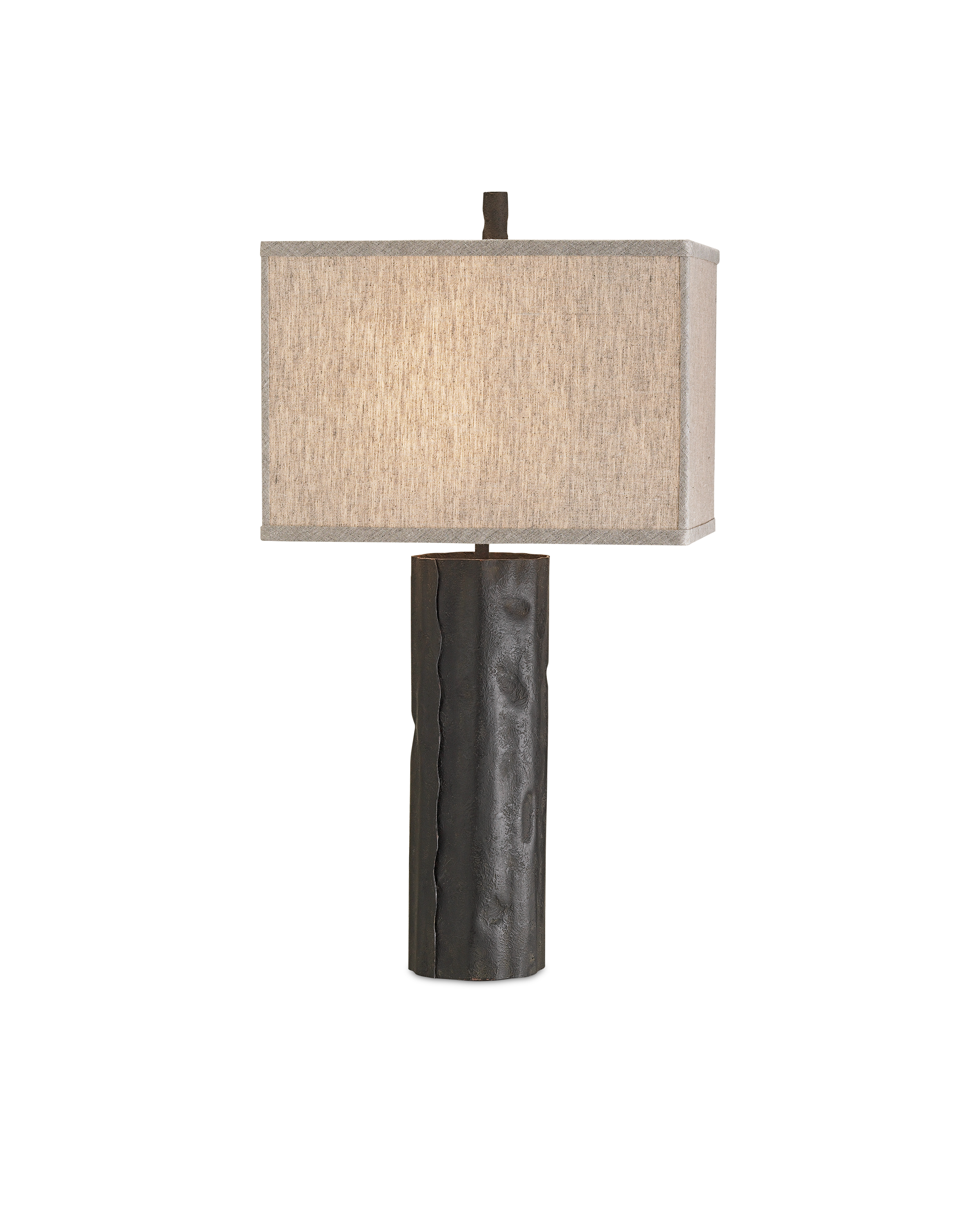 The Caravan Table Lamp has a cylindrical wrought iron body that could fool you into thinking It's made of rough-hewn wood but It's not: it's made of wrought iron. The rectangular natural linen shade that tops the dark brown lamp adds texture to its rustic vibe.