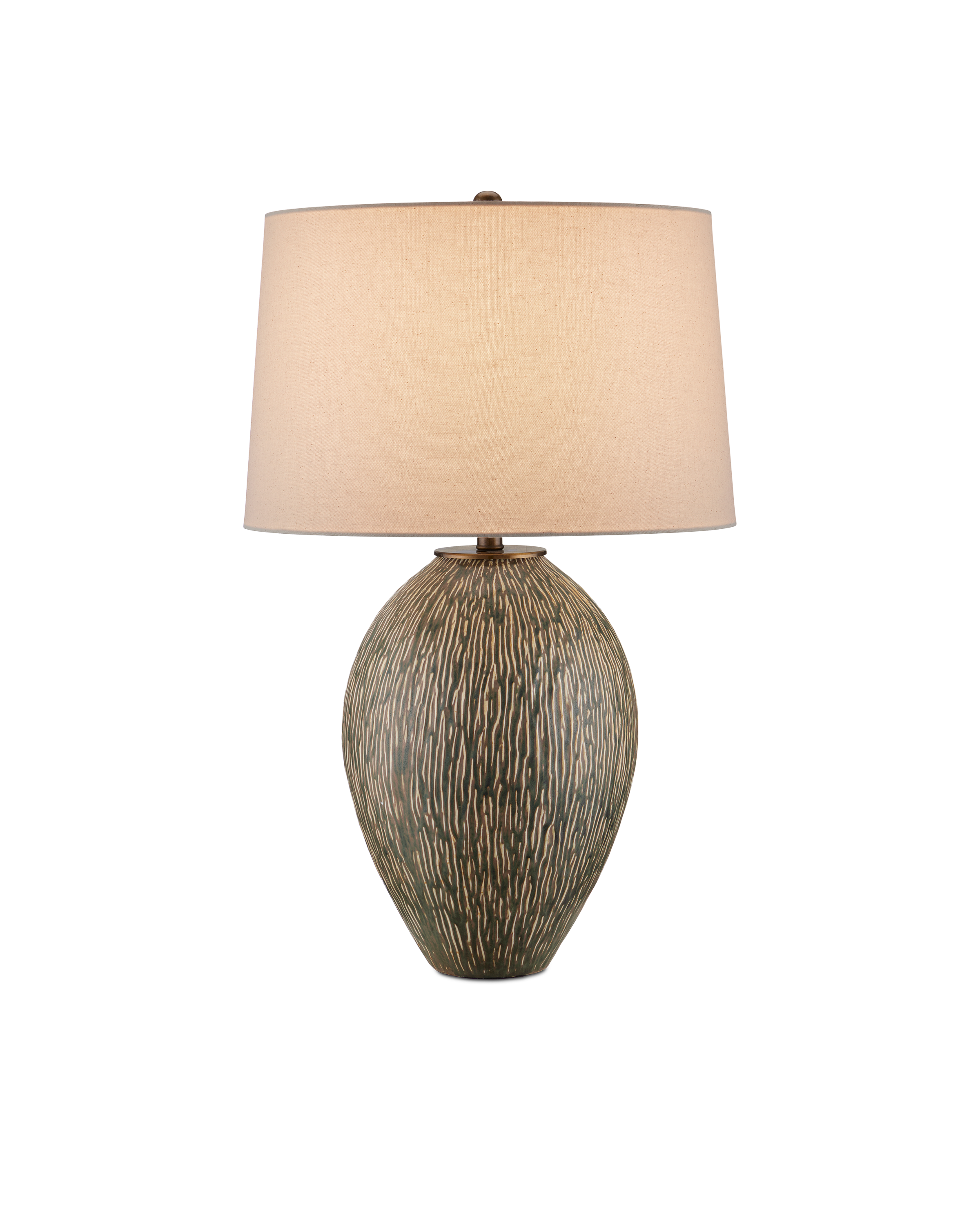 The Hildreth Table Lamp is awash in a textural pattern in an olive green and beige color combination. Made of porcelain, the dark green lamp gains a sense of movement from the flowing lines that ornament its surface. The fact it culminates without a base, and has an antique brass finish on the hardware and finial brings this composition great warmth.