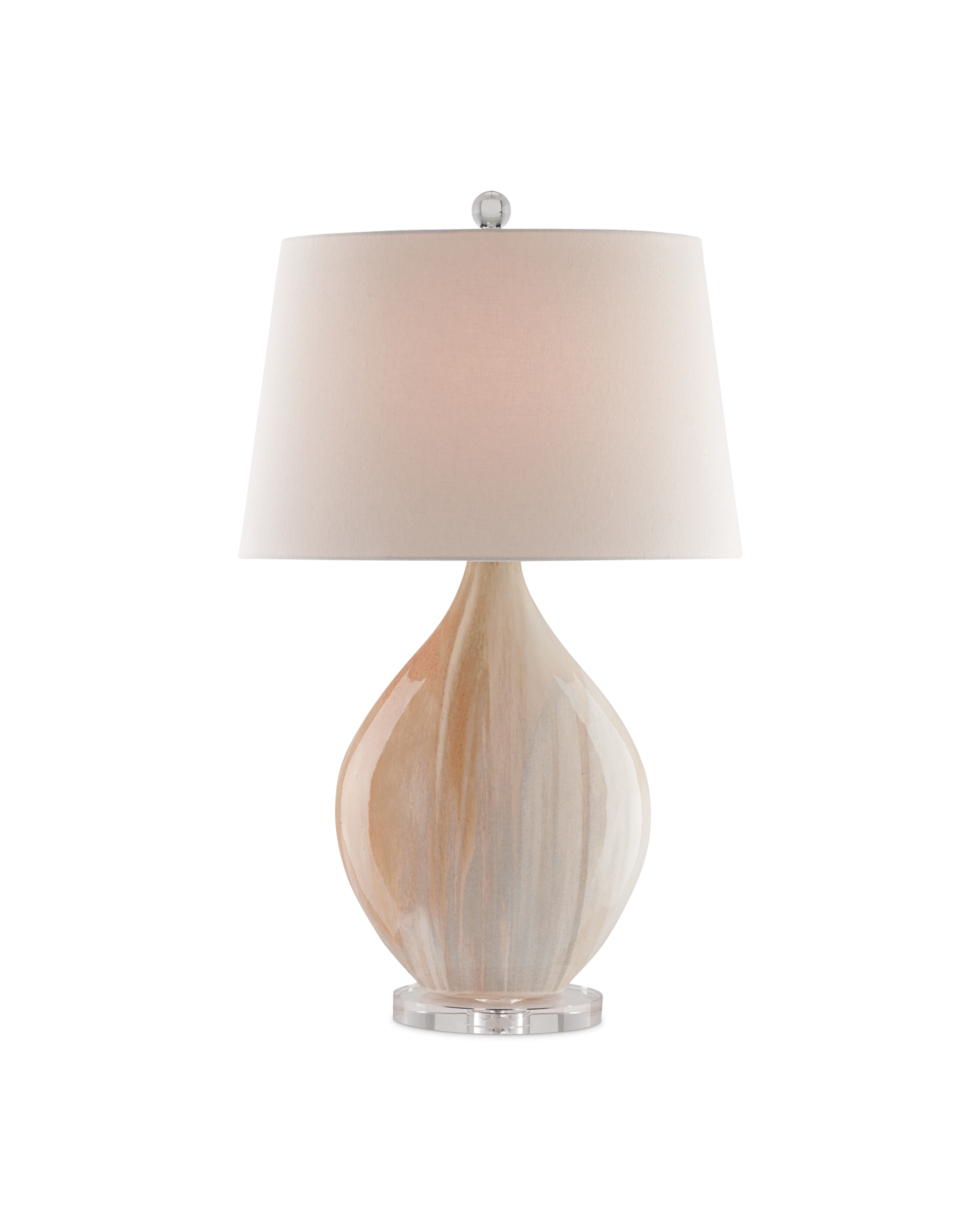 Shell-pink and pearly alabaster hues absorb the light and softly reflect it back from the round body of the Opal Table Lamp. The clear acrylic base and finial enhance the ethereal feel of this pink table lamp with its creamy hand-applied amber finish. The Opal is fitted with an off-white linen shade.