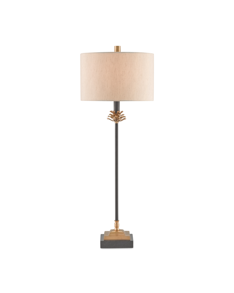 The Pinegrove Table Lamp has a black wrought iron column that extends between a spreading pinecone accent in an antique brass finish and a stacked base in brass and black granite. The beige poplin shade on the dark gray lamp is fastened by a finial in an antique brass finish.