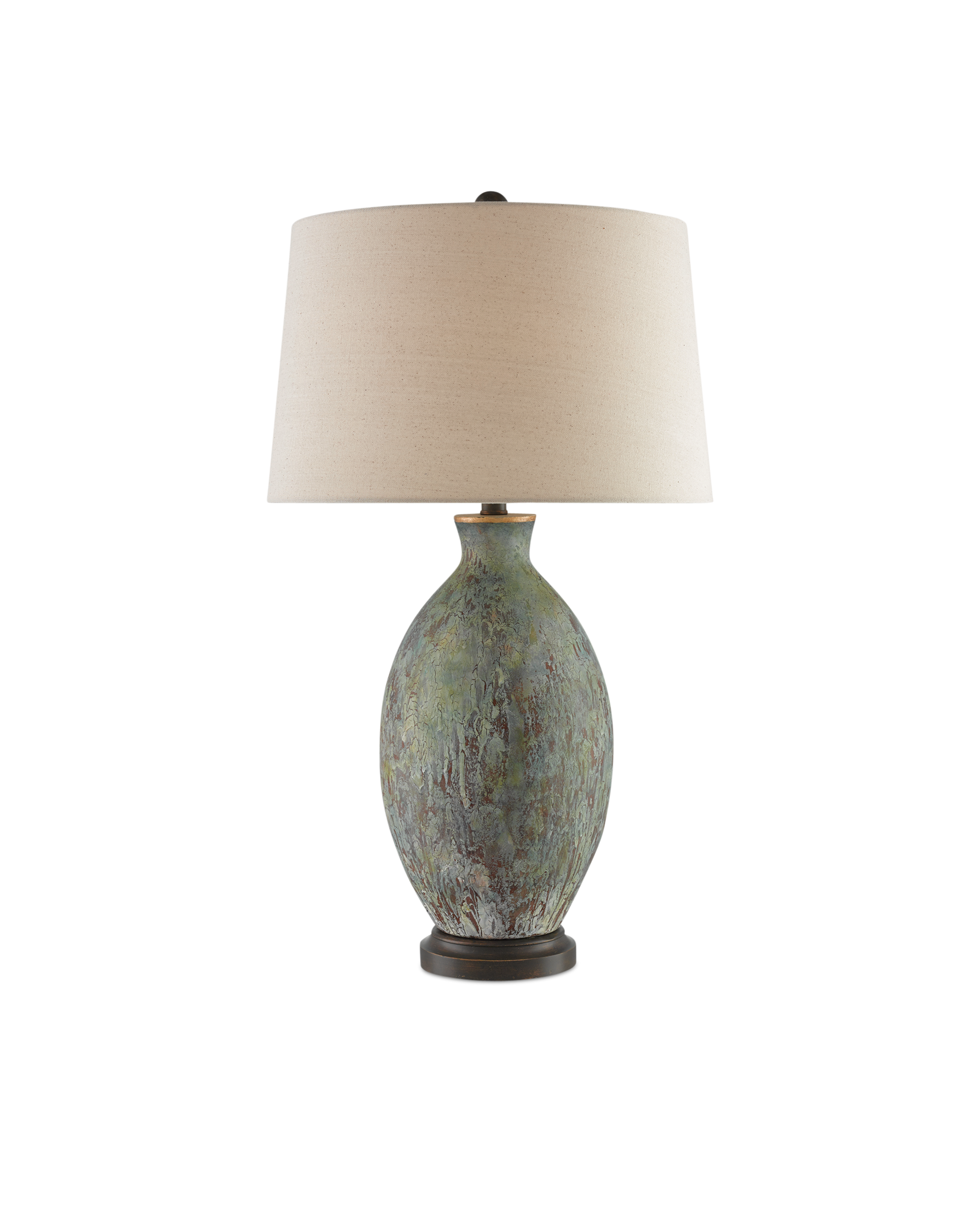The heavily distressed Remi Table Lamp is made of terracotta that was dripped with green and dark red glazes. The bronze gold finish on the hardware enhances the patina by giving the green lamp the feel of aged copper. The Remi is topped with a flax linen shade.