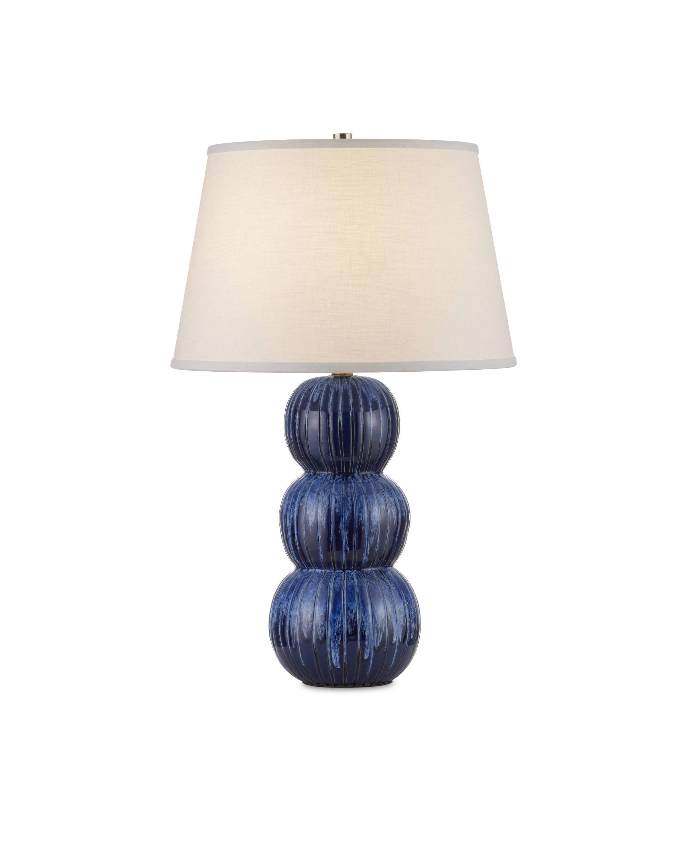 The Salacia Table Lamp has a stacked-globe body that drips with a mix of dark and bright blue glazes flowing down each striated orb in varying degrees of brightness. The painstaking attention to detail that is required to create such a varied but balanced glazing is achieved by a talented group of women artisans who live at the border of Burma and Thailand. The trim on the shade brings this navy blue lamp an uptick in sophistication.