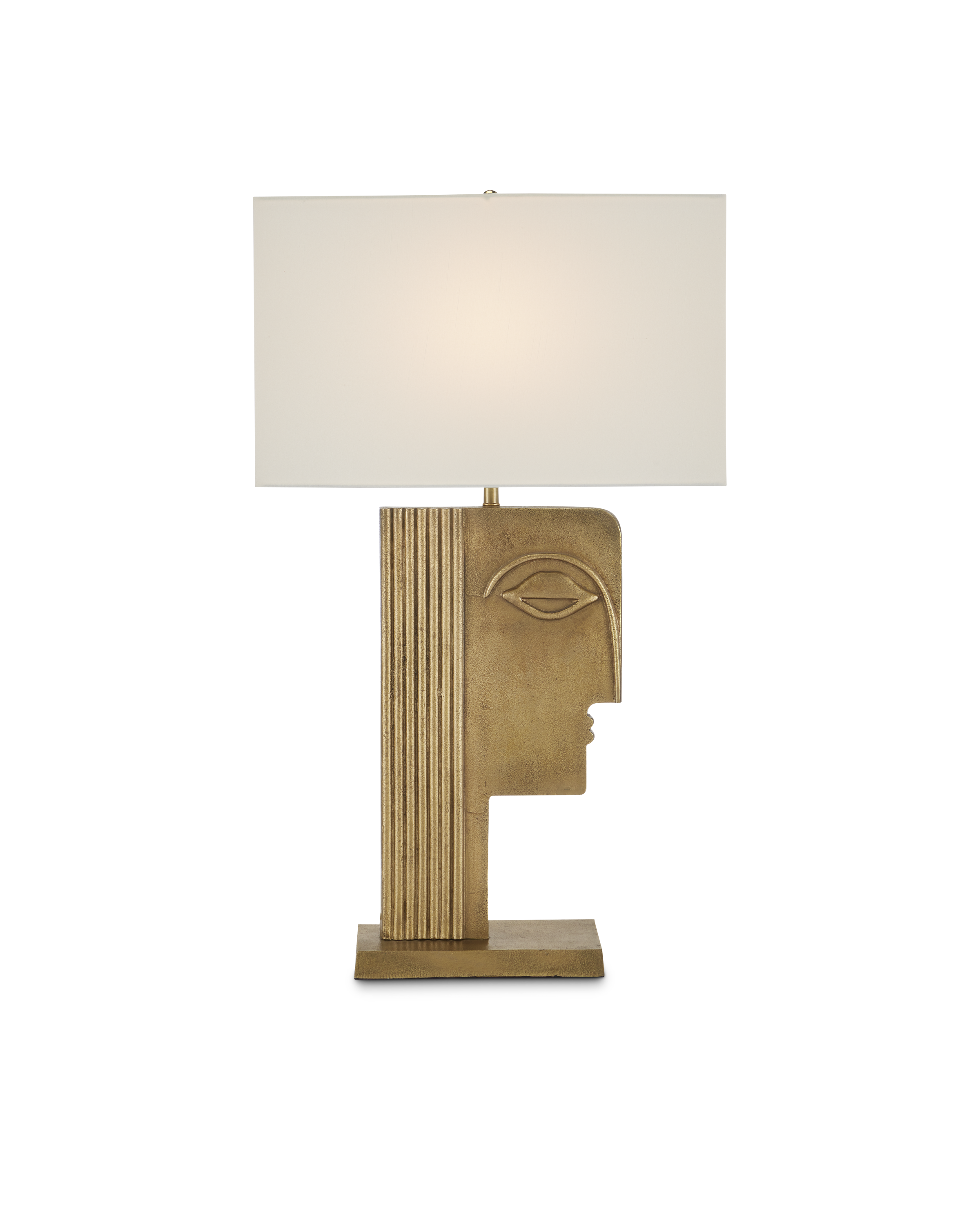 Designed by Ian Thornton, who was inspired by Art Deco motifs from the 1920s and 1930s when he conceived the Thebes Table Lamp, the cast aluminum composition has a warm antique brass finish. The artful face with its expression that calls to mind both Egyptian and Parisian deco influences, looks into a room with its canny stare from both sides of the gold table lamp so it can be placed in the center of a space. The rectangular white shantung shade is perfectly in scale with the elongated metal body.