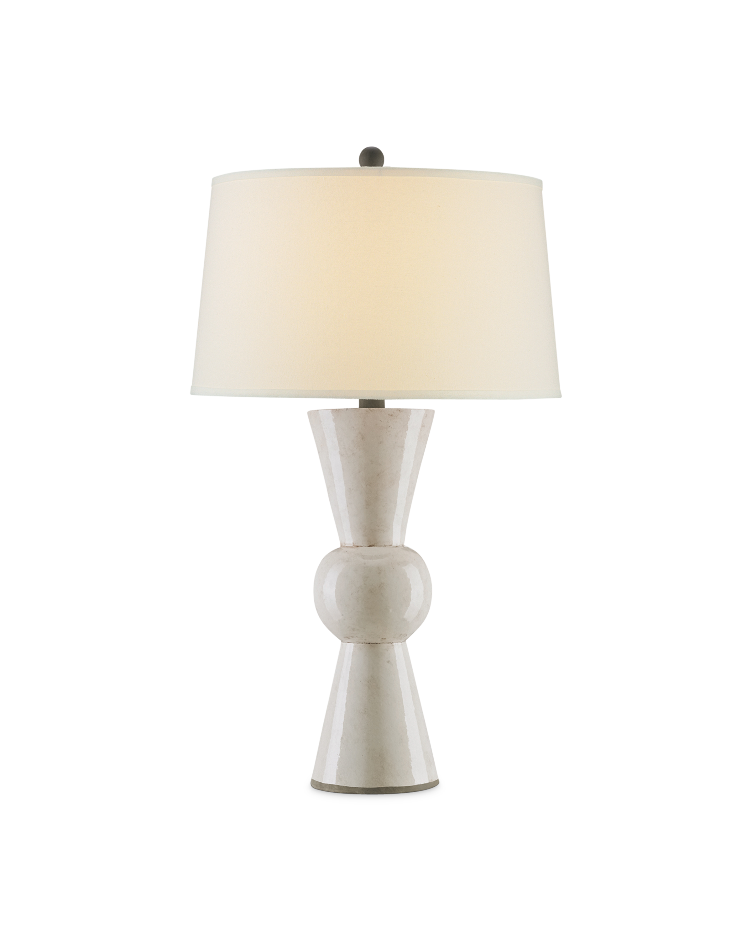 The Upbeat White Table Lamp is mod in style. The shapely terracotta body has a center ball with cones extending up toward an off-white linen shade and downward to its culmination. The shade is fastened with a wrought iron finial.