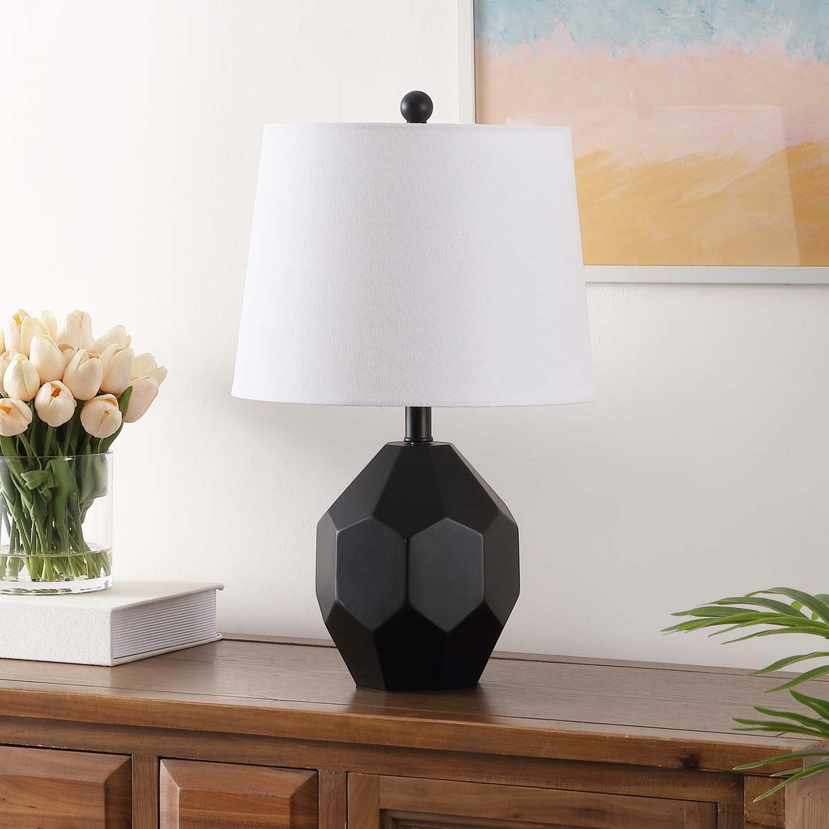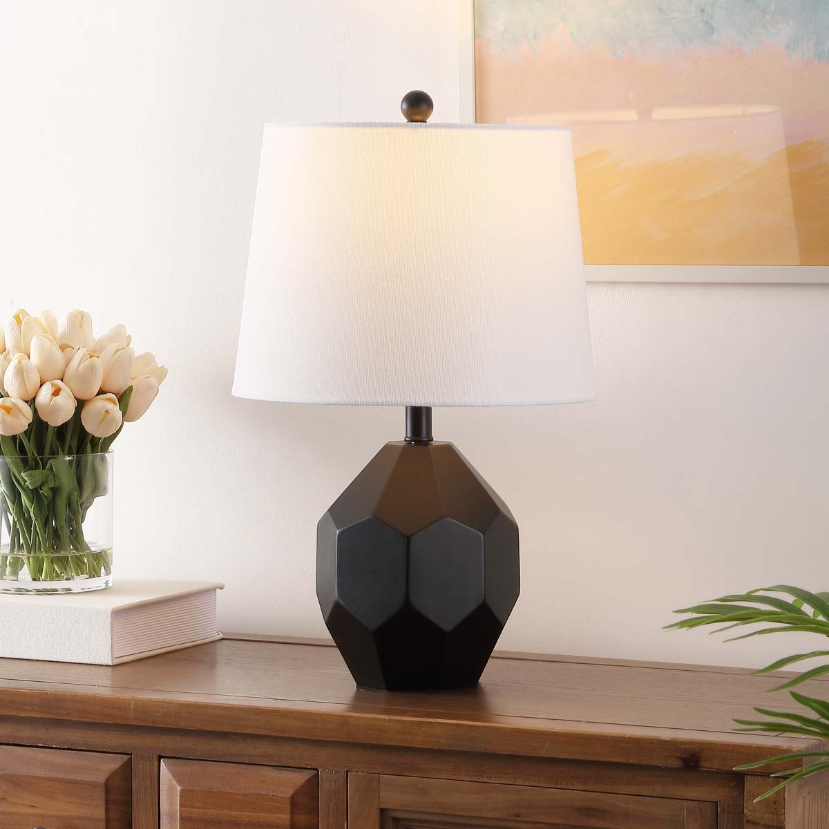 Bring style to any tabletop with the sleek geometric appeal of our Danilo table lamp. Skillfully crafted from resin, our table lamp features a beautifully faceted body to attain a geometric and eye-catching presence. It features a high-contrast finish with a black body and a sleek white shade to make a bold visual impact. Our sleek and stylish table lamp diffuses a soft glow to offer the perfect touch of light and elegance to a bedroom or lounge.