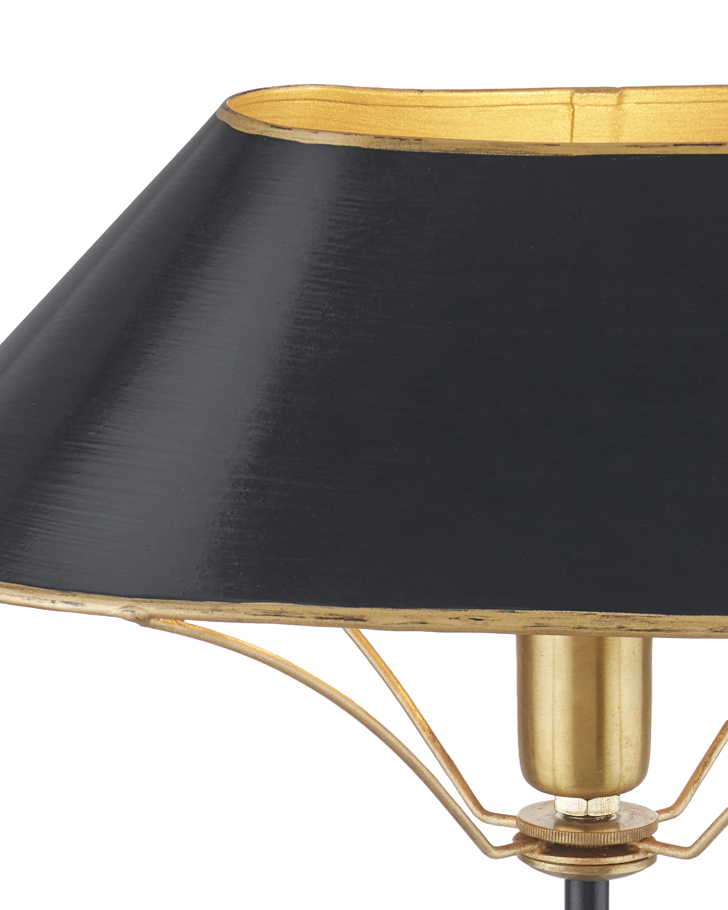 The Daphne Black Table Lamp looks as if it is made of one material in two distinctive finishes, but the base is made of wood while the other elements are made of iron and brass. The shape of the oval shade with its painted gold trim is a sophisticated design detail, as is the gold finish on the interior of the shade that will warm the light bouncing off it.