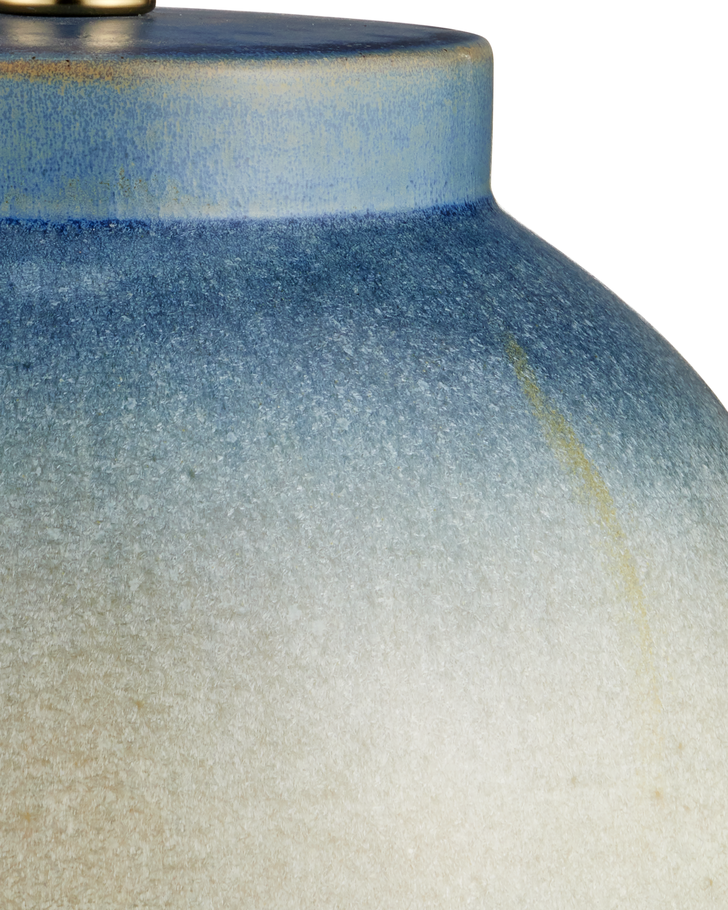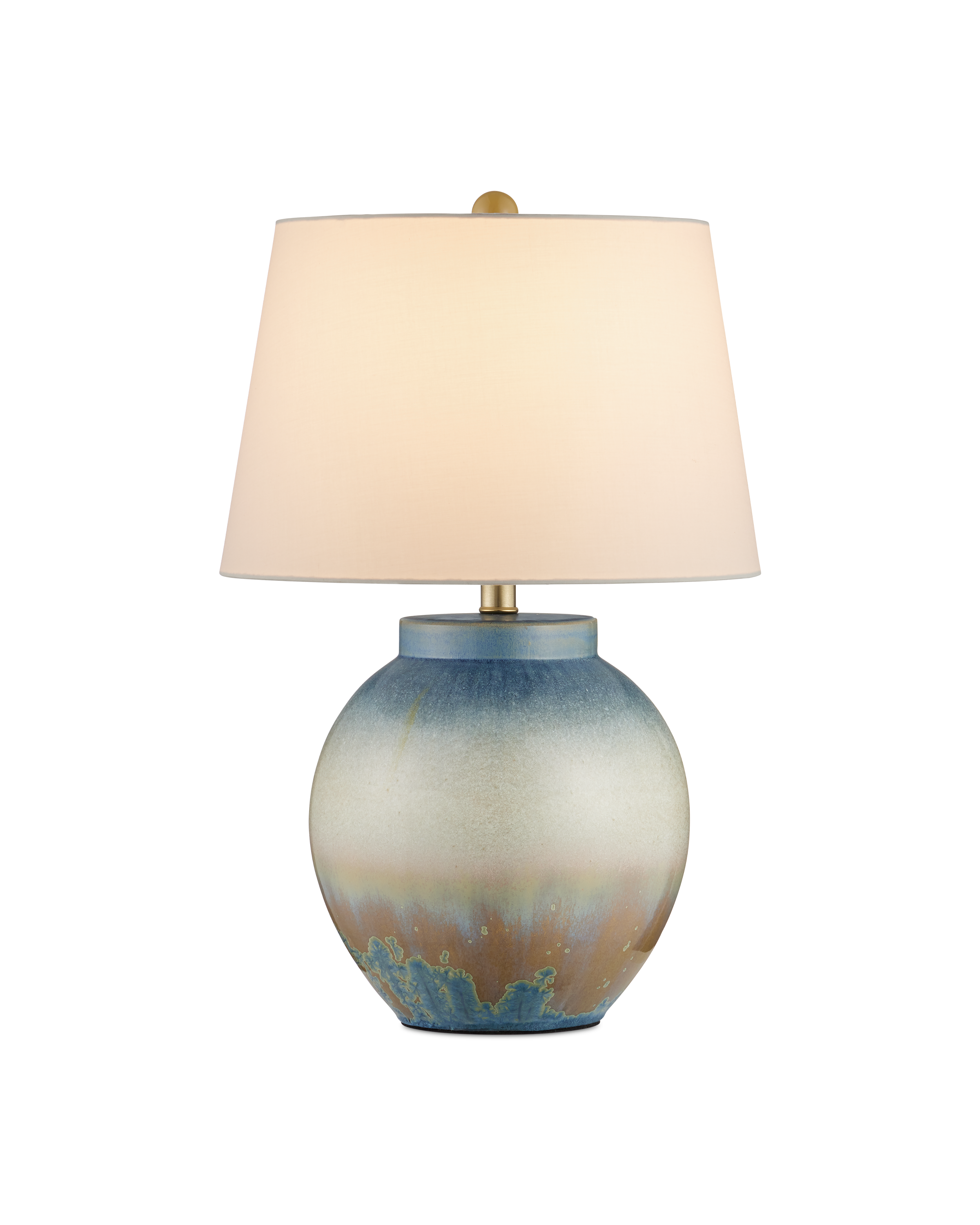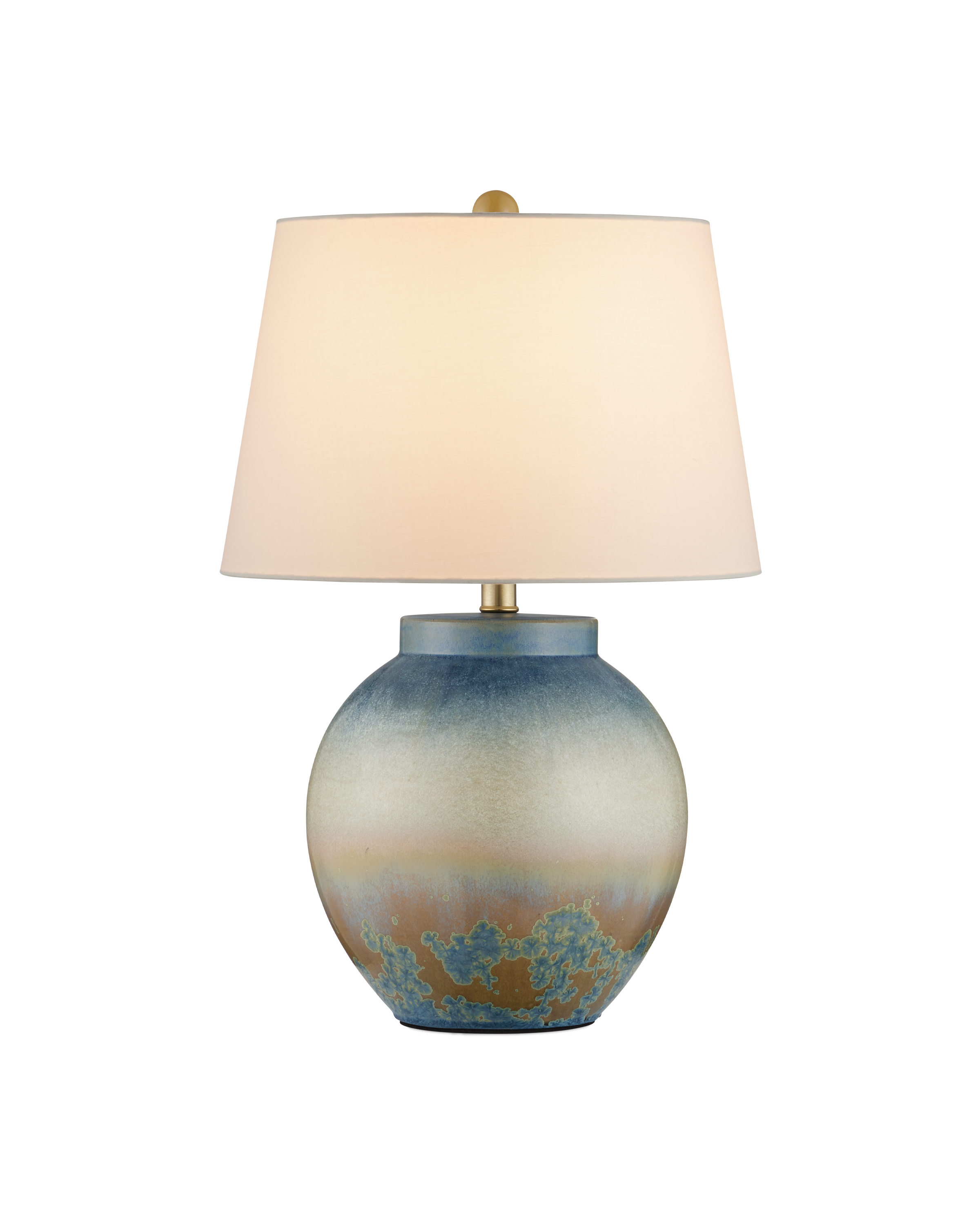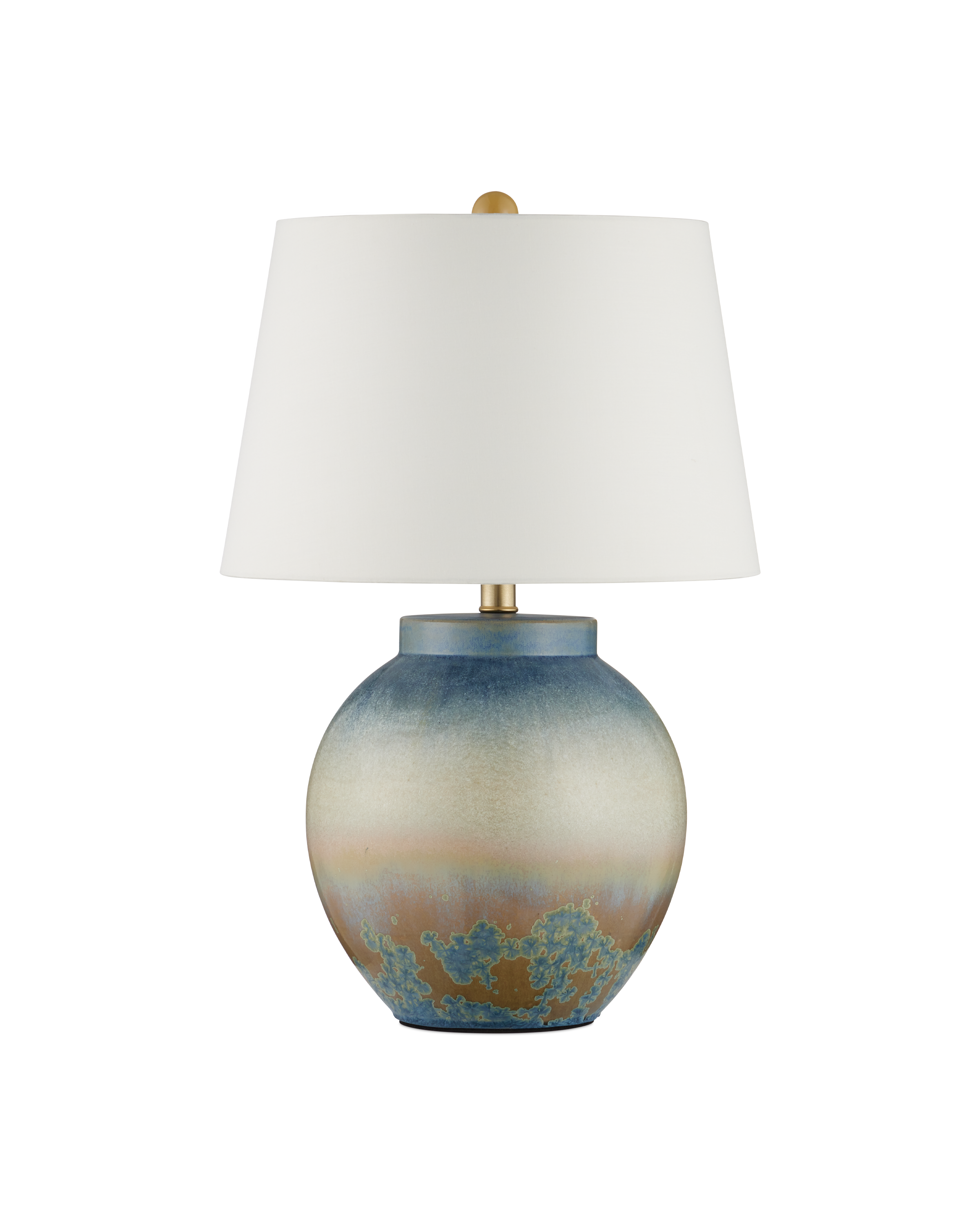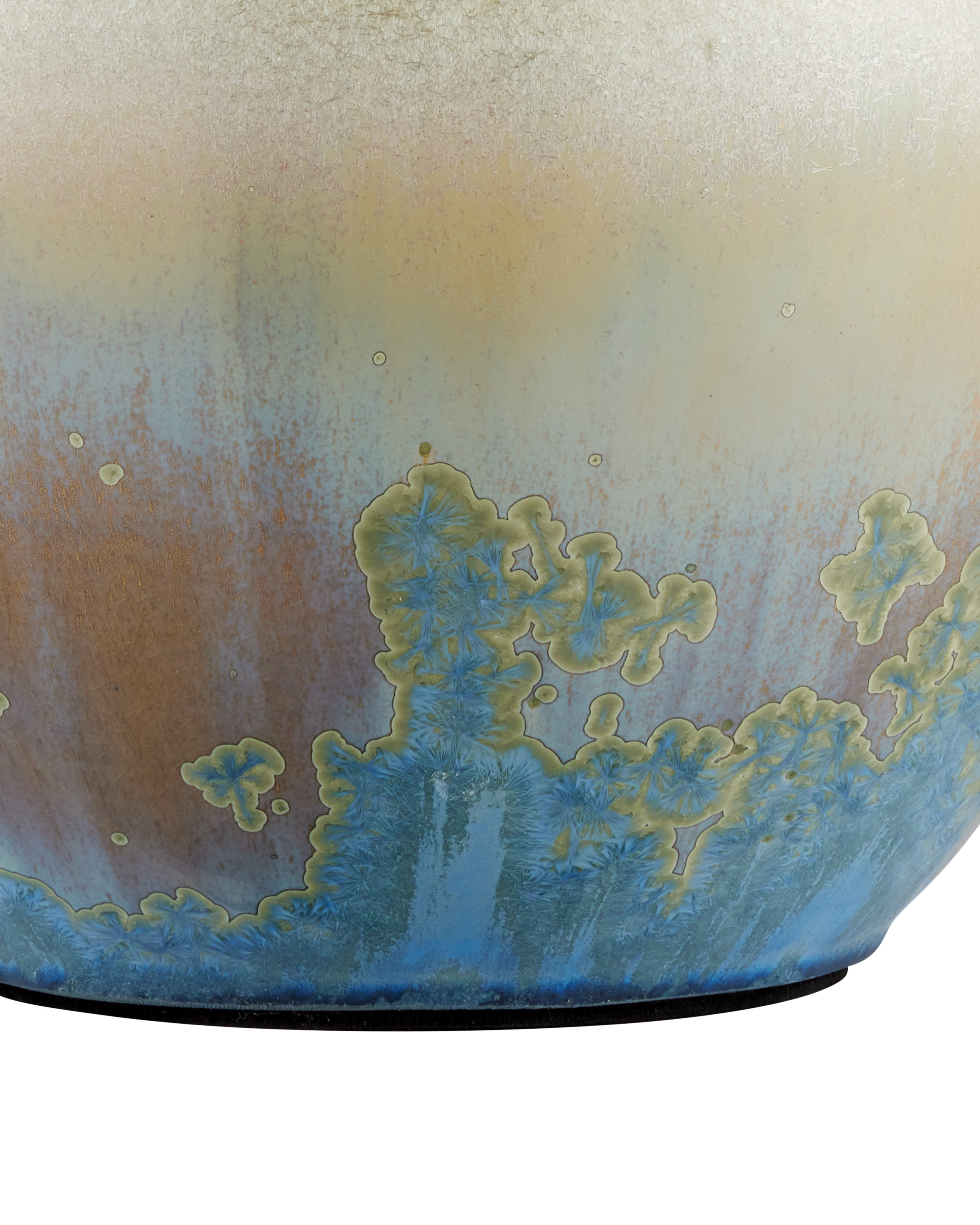 The Dawning Table Lamp features a ceramic body with a uniquely varied surface created through a crystallization process during firing. Multiple layers of different colored glazes react to high kiln temperatures, forming varied surface crystals that flow upward from the base, resulting in one-of-a-kind patterns on every lamp. With tones that evoke a sunrise over the ocean, each piece offers a rich blend of texture, color, and natural movement.