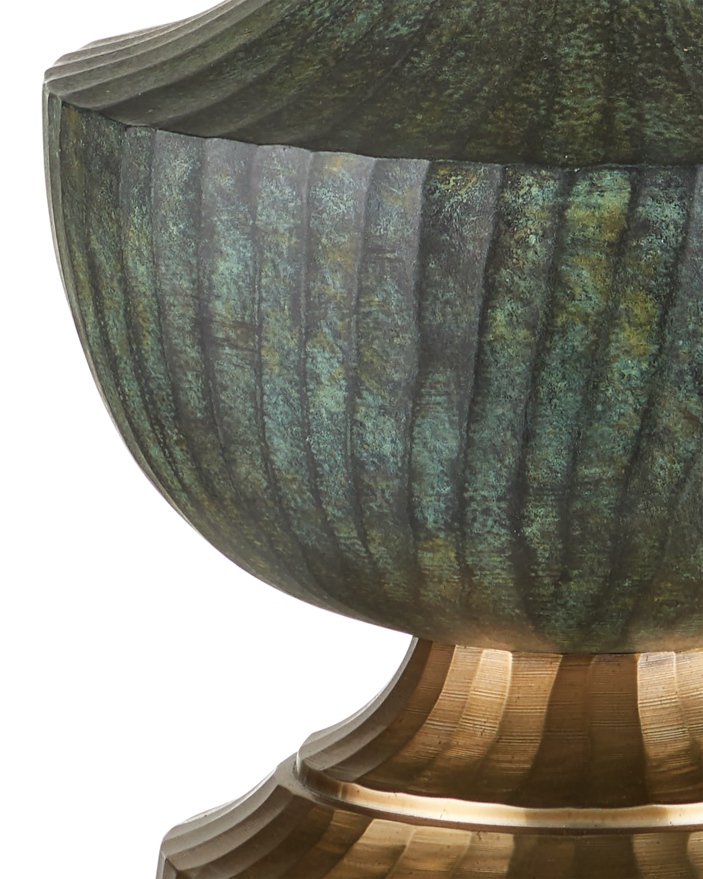 The Currey & Company Djinn Table Lamp is a gold and green lamp made of cast aluminum in a mix of verdigris and antique brass finishes.