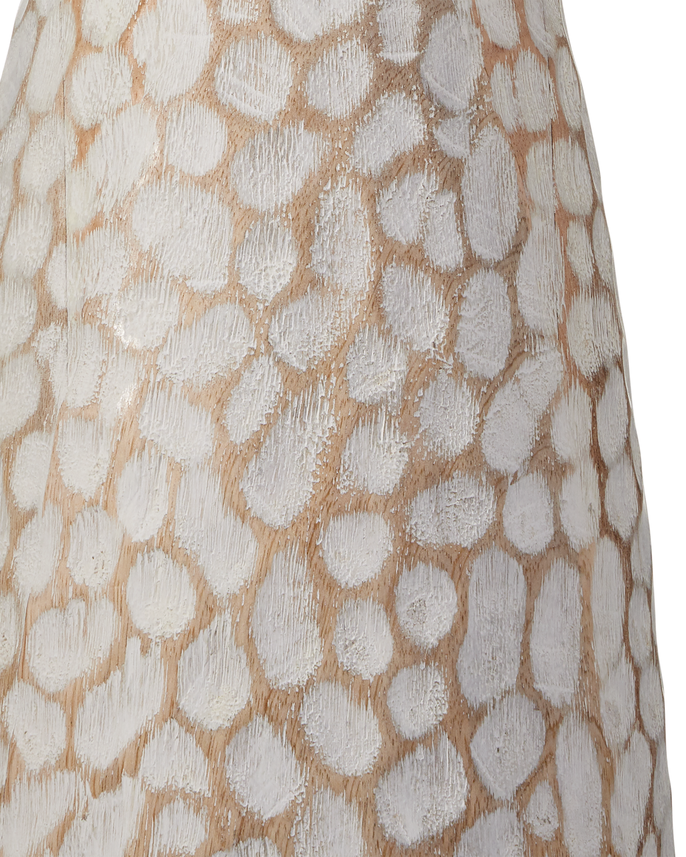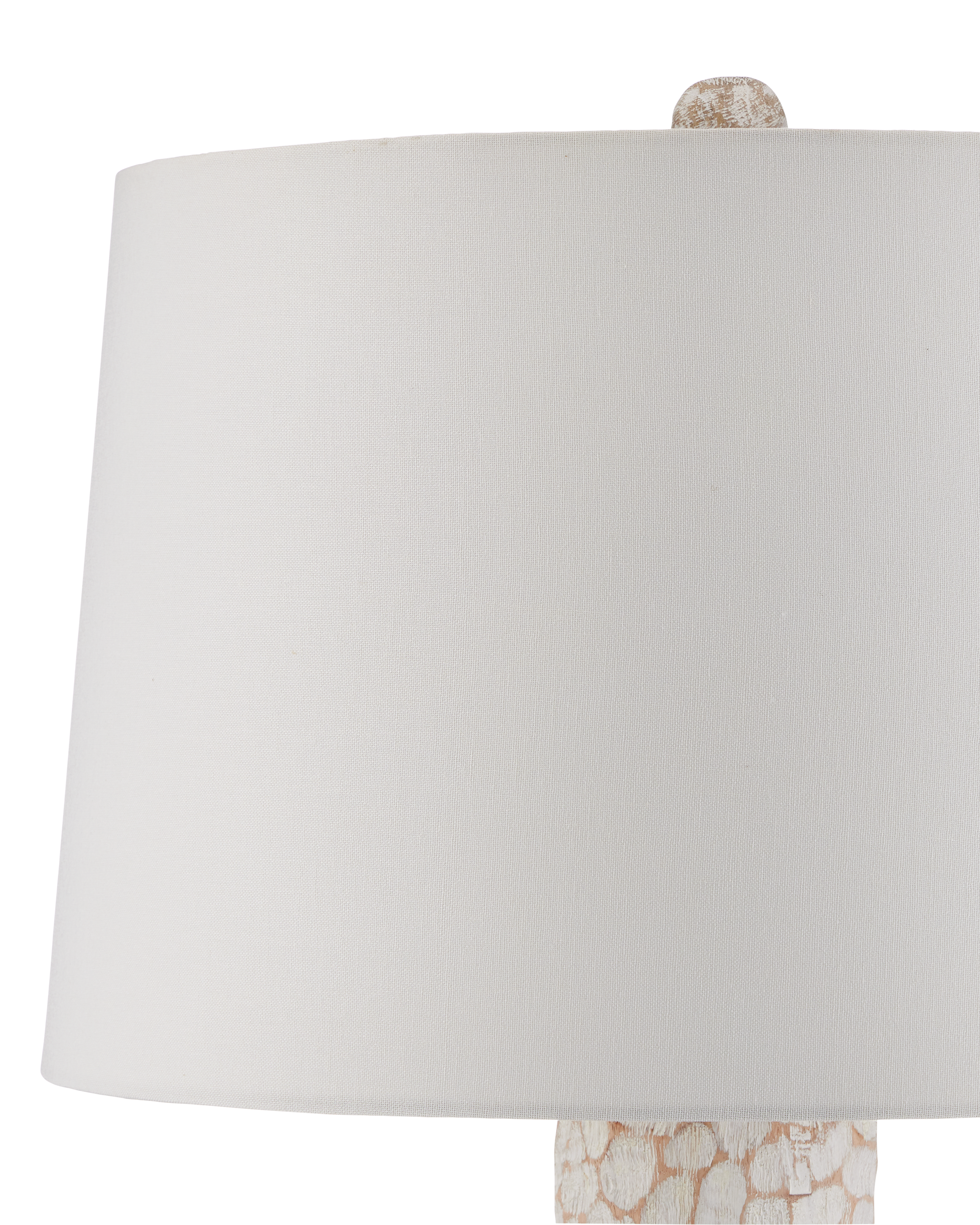 The Edwell Whitewash Table Lamp has a shapely body that has been hand-carved from wood to create a textural pattern, the organic shapes bringing the slim hourglass form a dynamic interest. The pattern is accentuated when the whitewash finish gathers in the crevices on the lamp and is wiped clean on the peaks that swim along the surface. A design detail is the finial that has been hand-carved and finished to match the lamp's body.