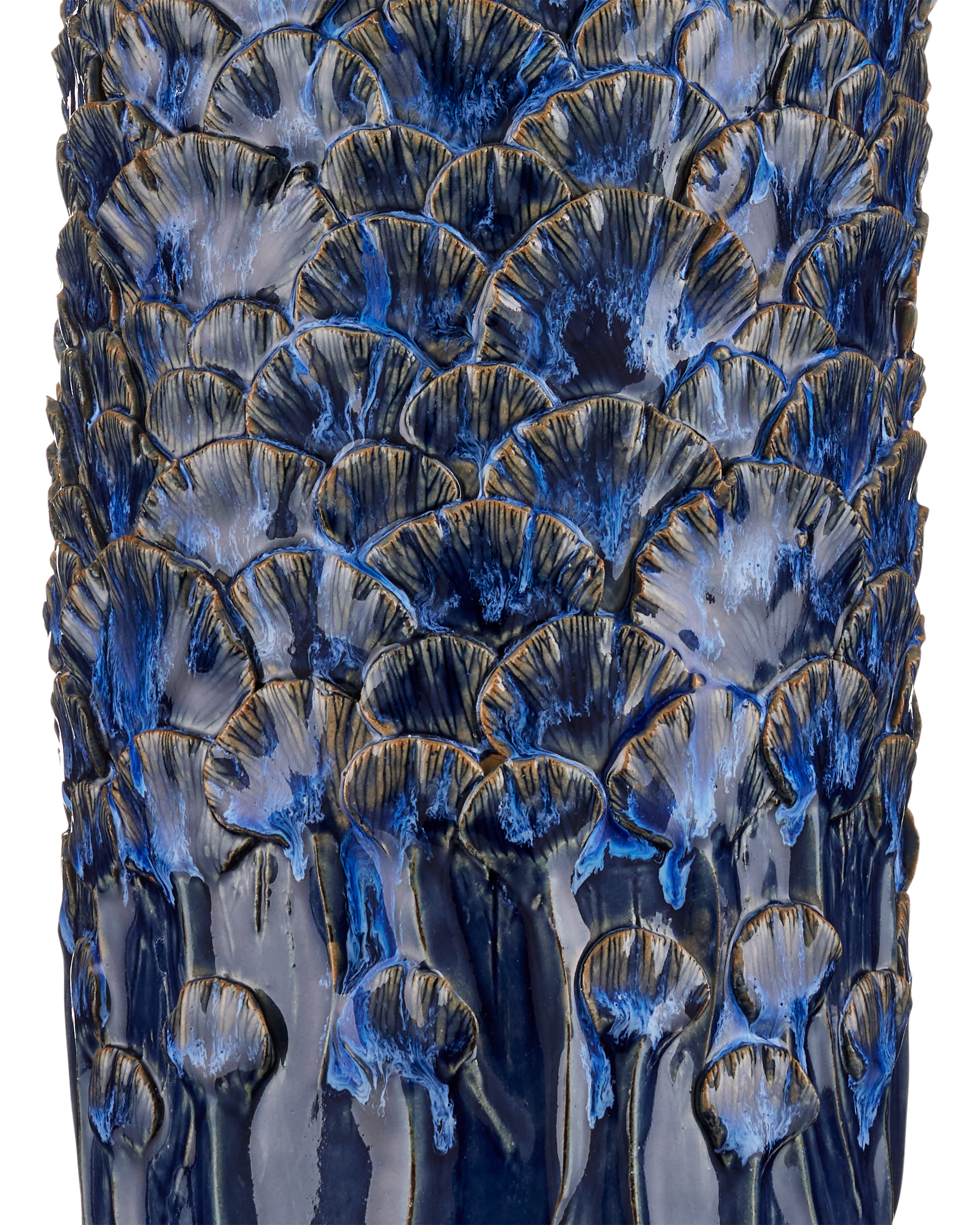 The Fairmont Dark Blue Table Lamp is a columnar navy lamp with a surface covered in handmade gingko leaves. The fanciful lamp is made of dark clay ceramic covered in a dark blue reactive glaze by a community of talented women artisans who live at the border of Burma and Thailand. Creating the leafy shapes and affixing each one by hand is a painstaking process that results in an artisanal creation.