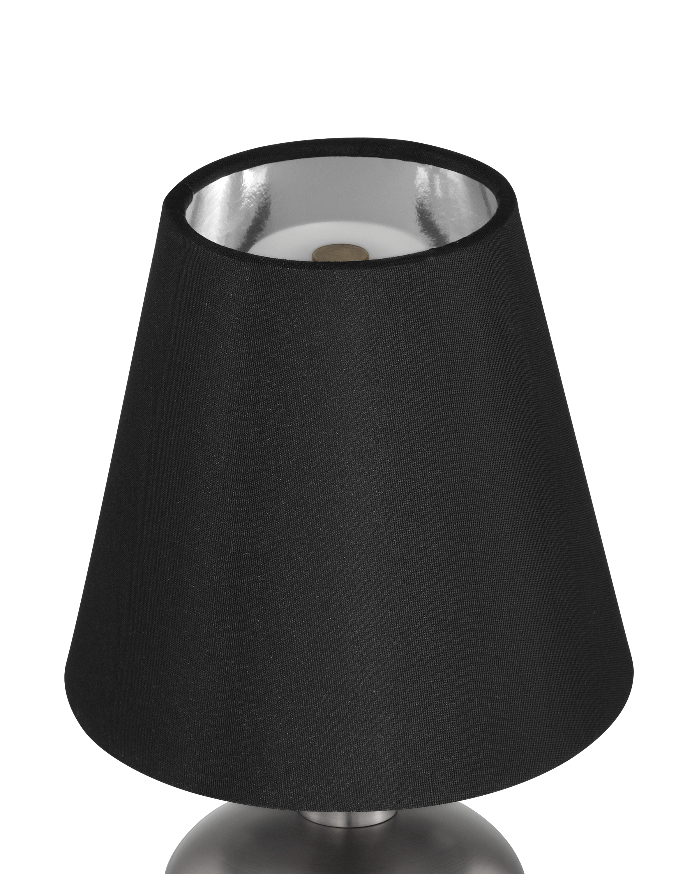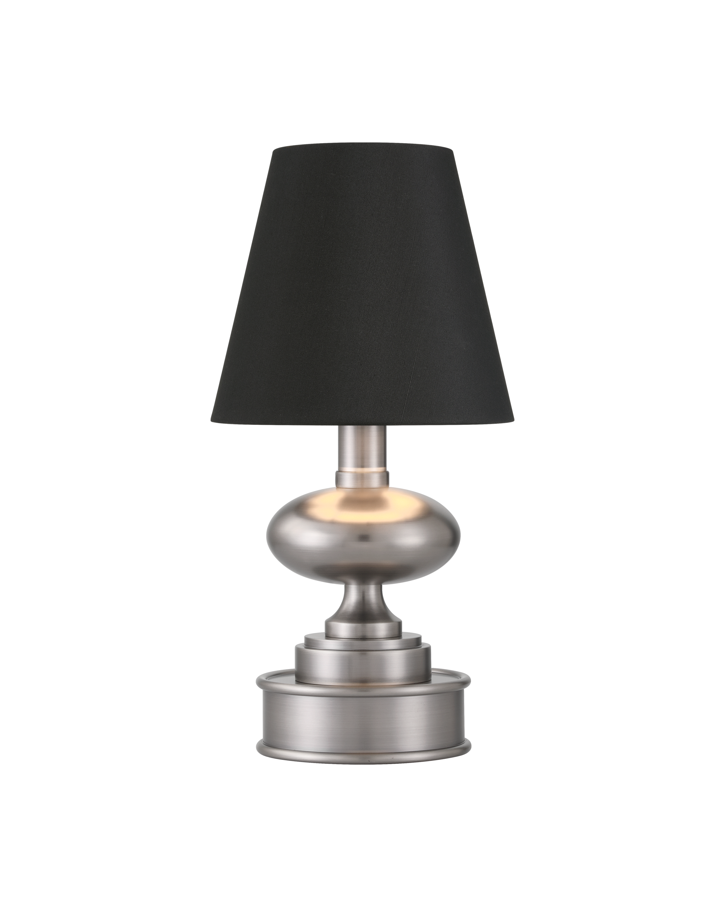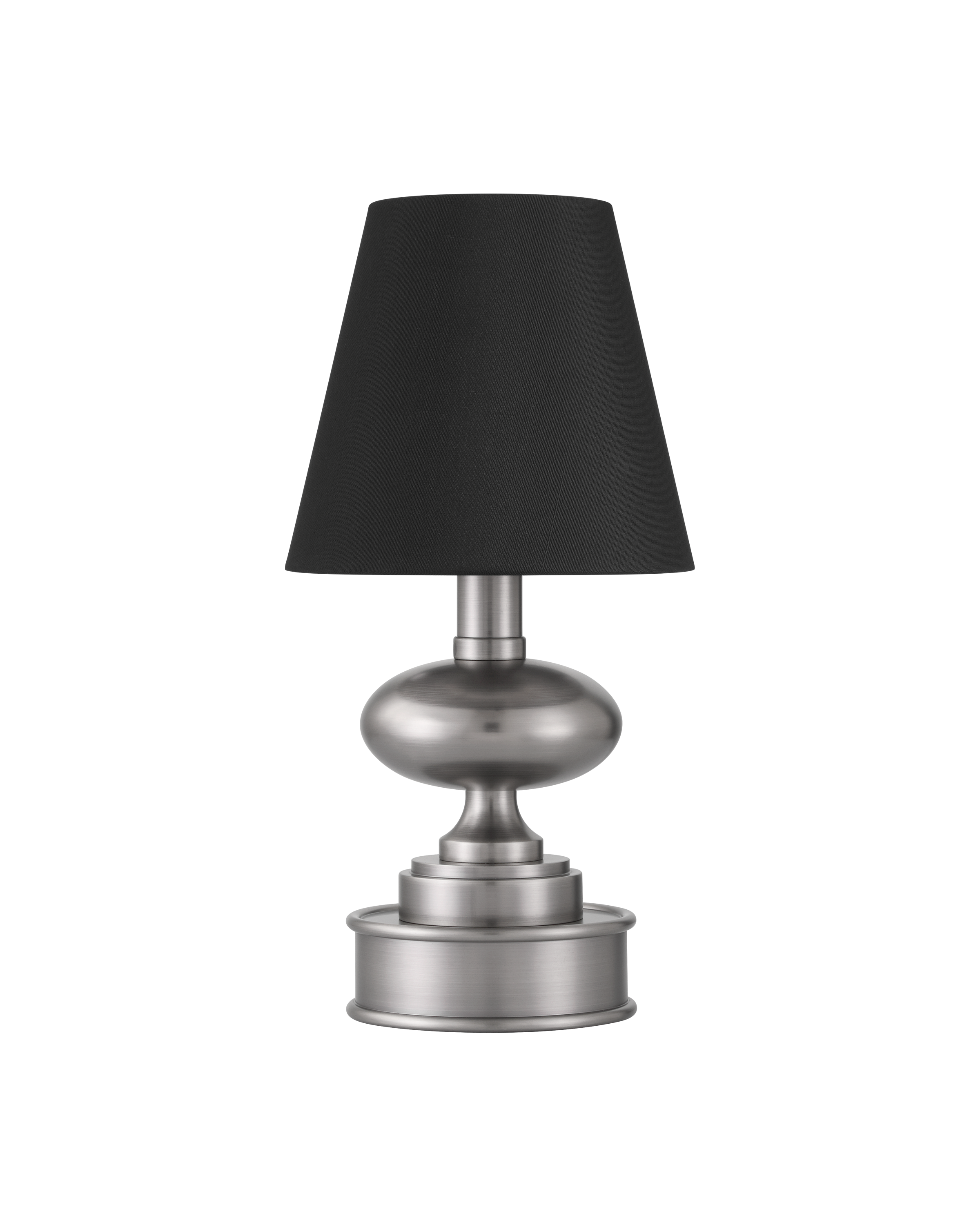 The Galavant Nickel Cordless Table Lamp is a petite silver lamp that makes movement a breeze. The rechargeable bulb sits atop the metal body in a brushed nickel finish and the black shantung shade slides seamlessly over it. The on/off switch is on the top of the bulb, and the shade has a silver foil lining for a luxe touch.