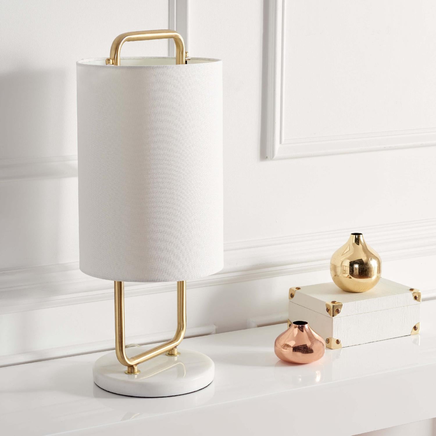 An icon of glamorous modern minimalism, this glimmering Giulia Table Lamp is a must-have for today?? celebrity-chic interiors. Giulia?? circular white marble base and white cylinder shade pair perfectly with the rounded corners of its open gold frame.