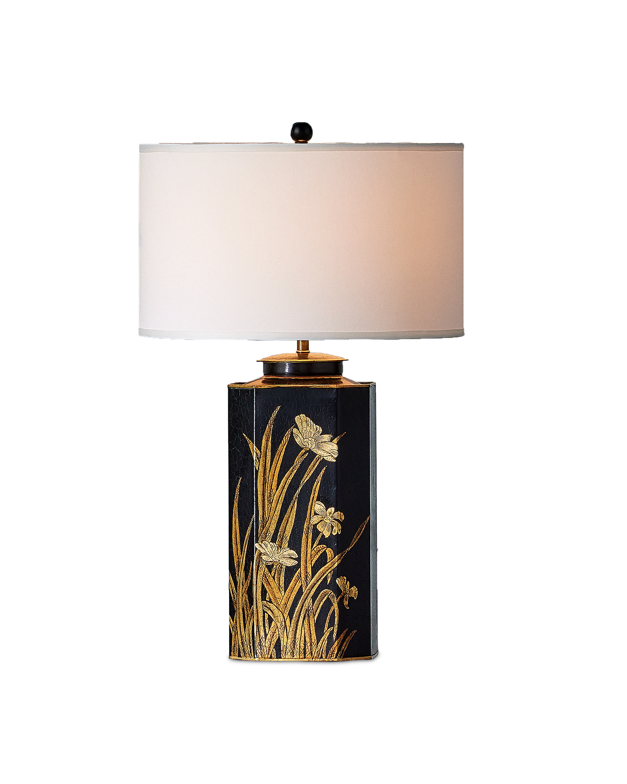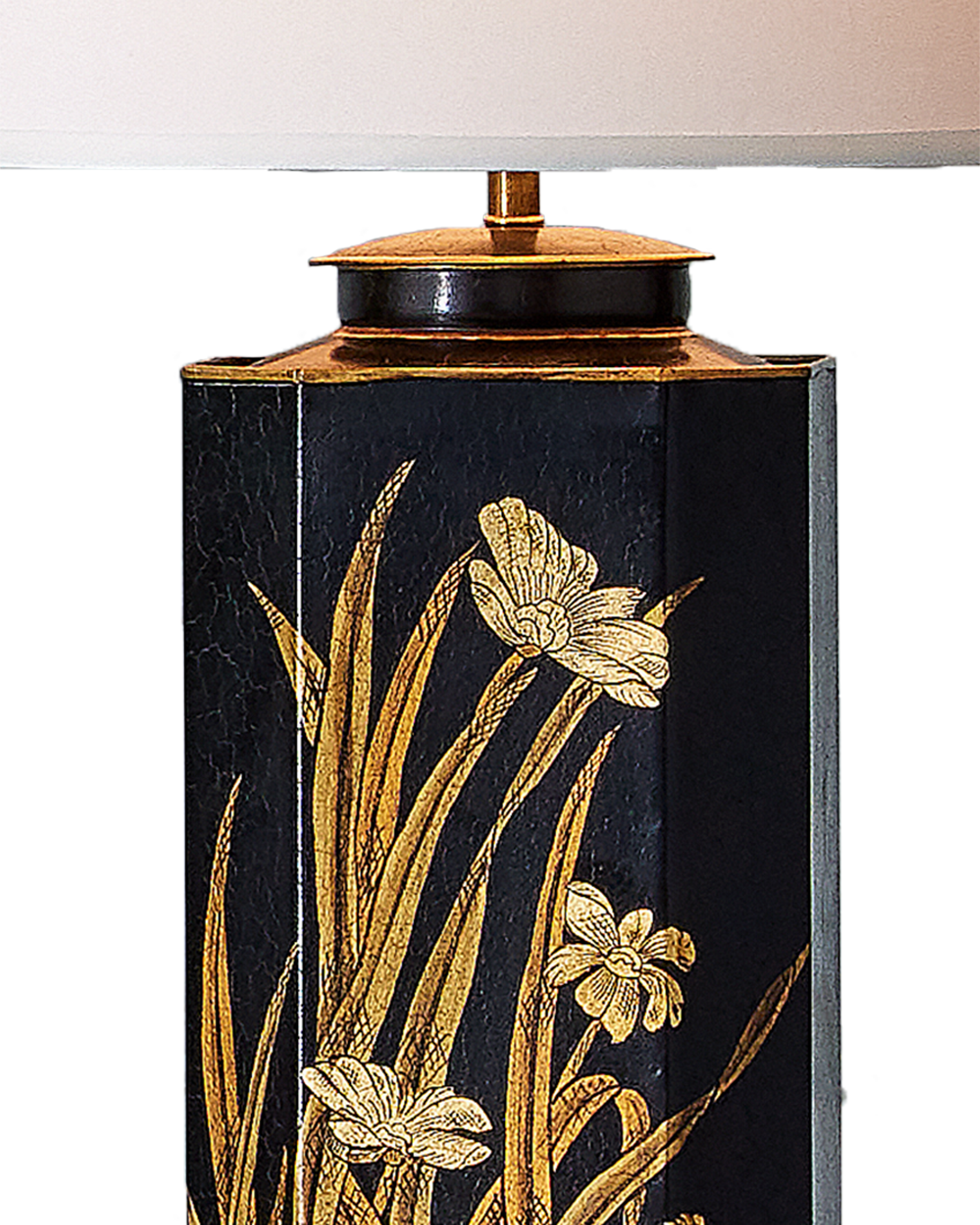 The Currey & Company Glasshouse Tole Table Lamp has a timeless beauty with its gold and black floral design on the trophy-shaped body.