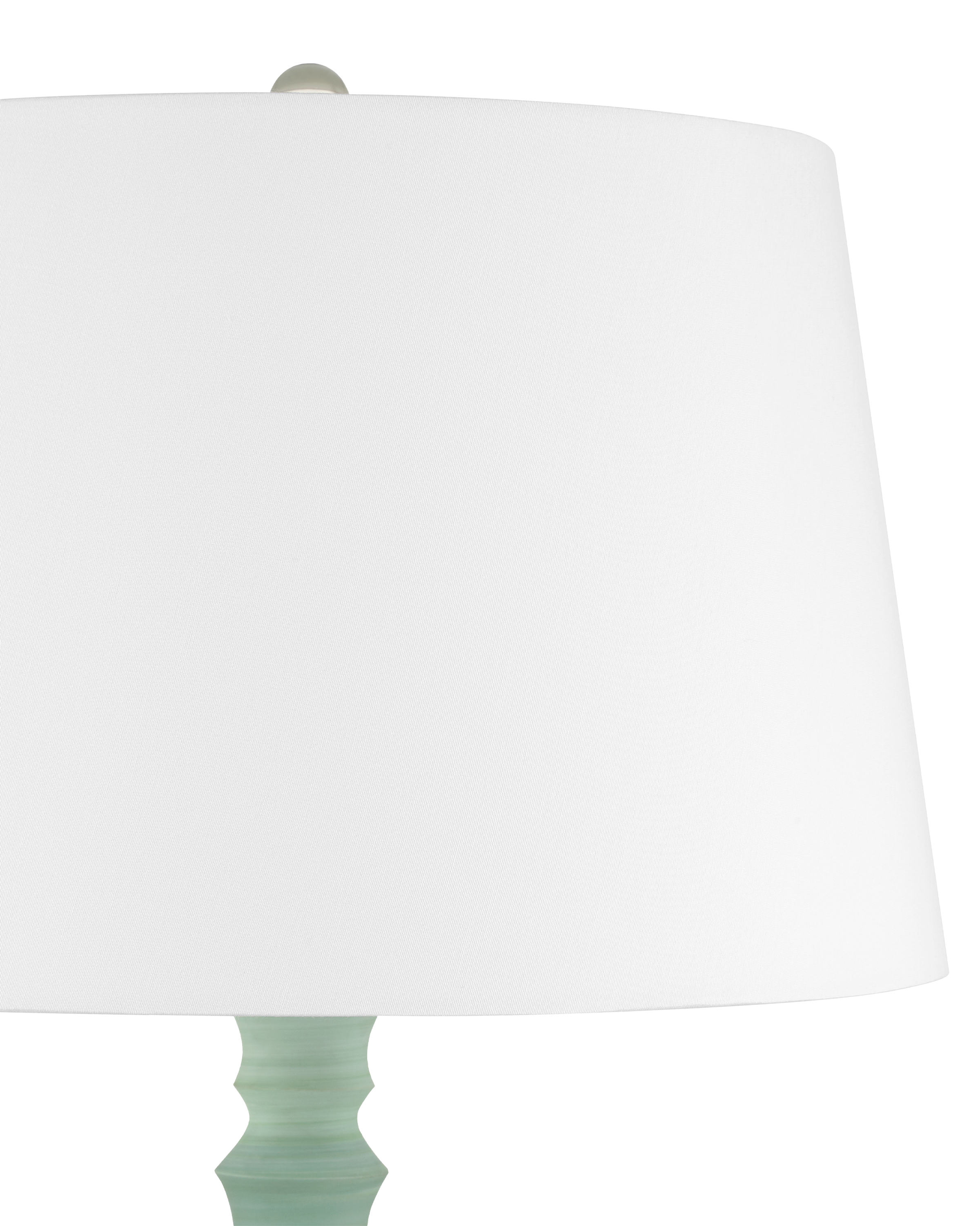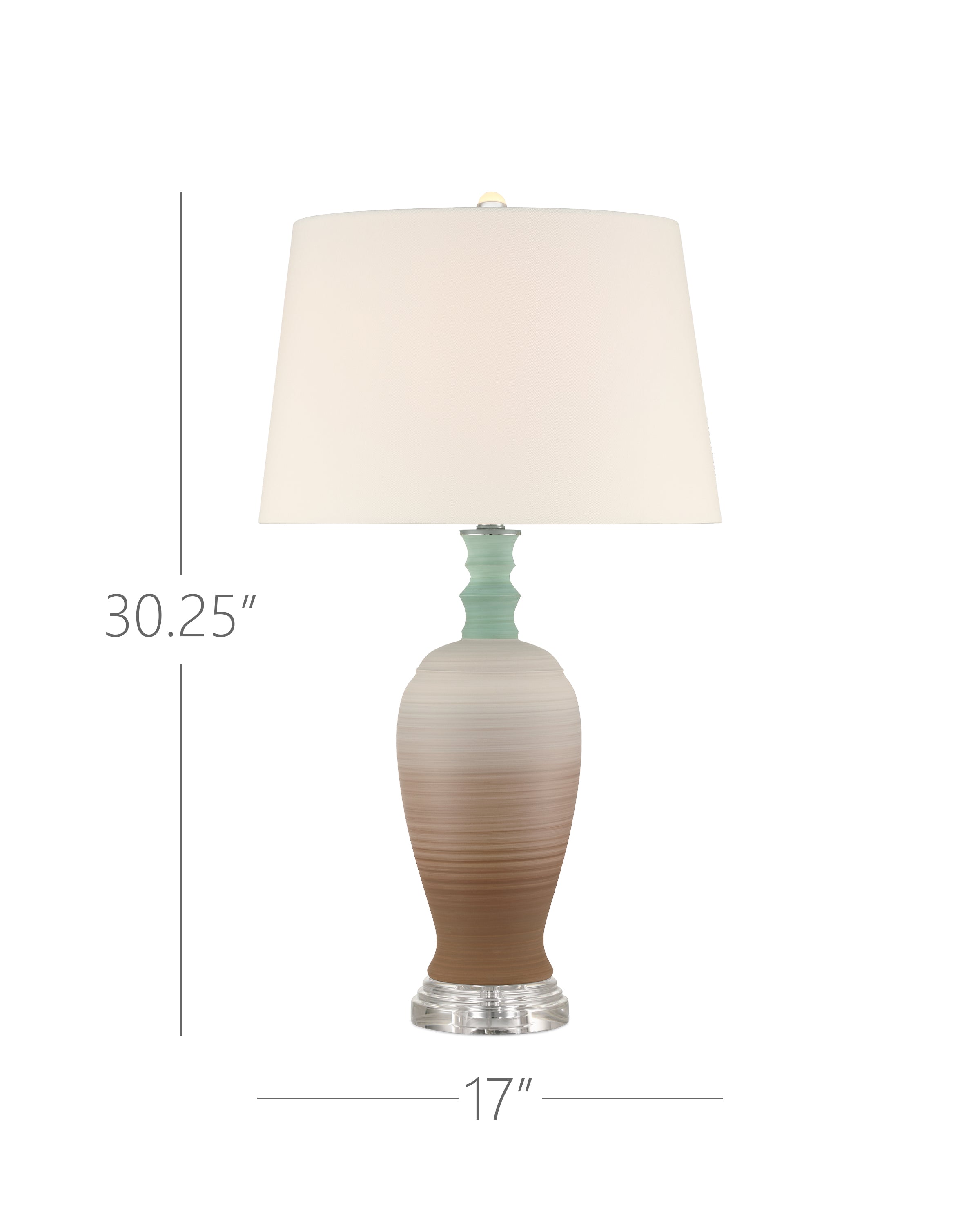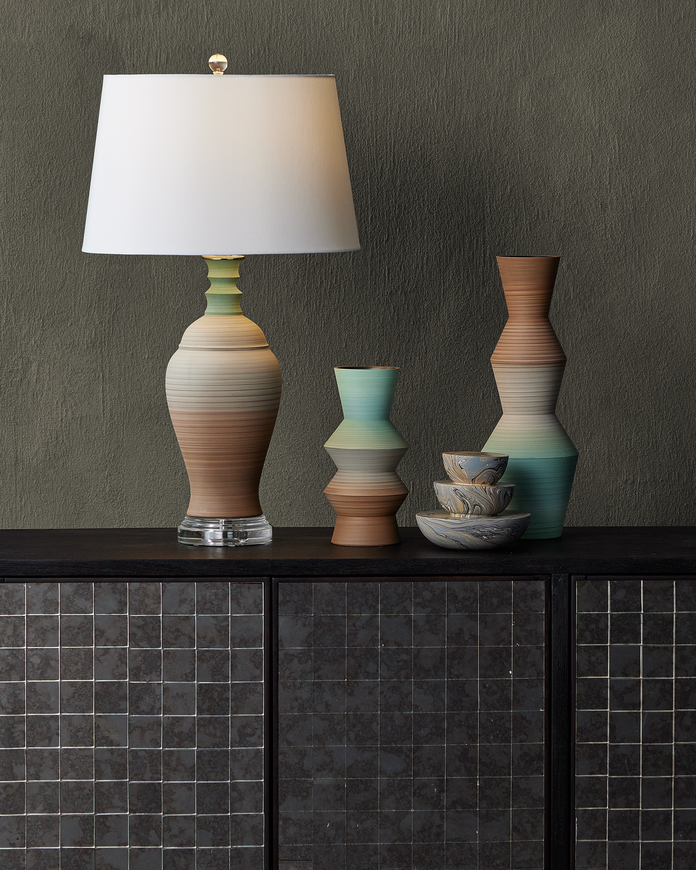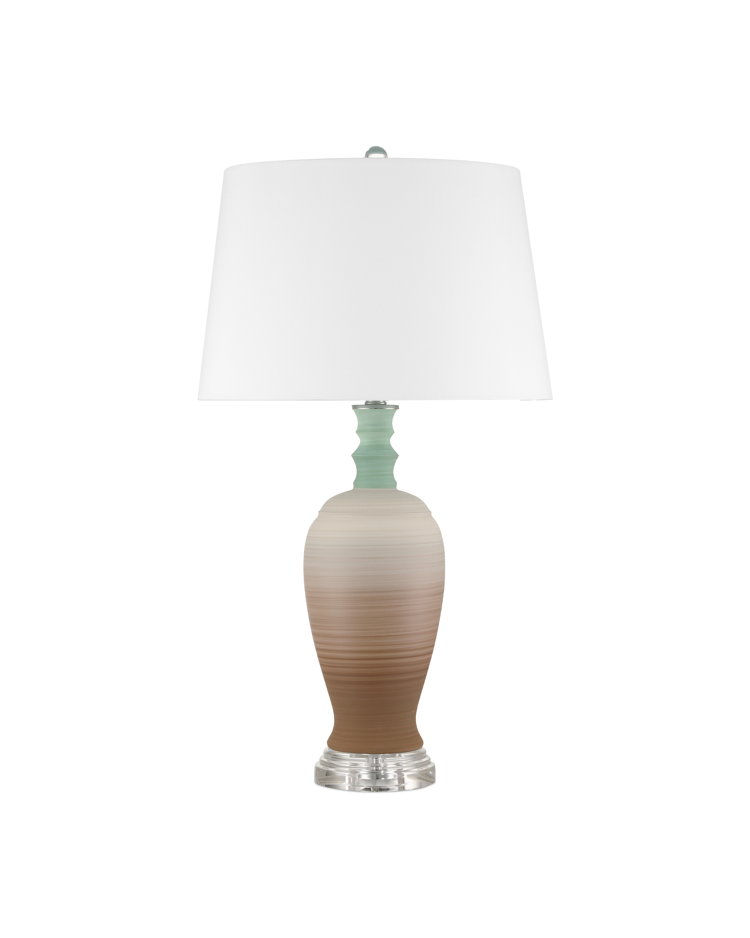 A playful retro vibe enters a room when the Happy 80's Green and Brown Vase Set come on the scene. The lamp’s body is painted with unique striations of earthy brown and pale blue that are achieved while still spinning on the potter's wheel. The result is a layered pattern that adds depth and character to the design. The shade that is fastened with an optic crystal finial is white on the outside and lined in a blue fabric.