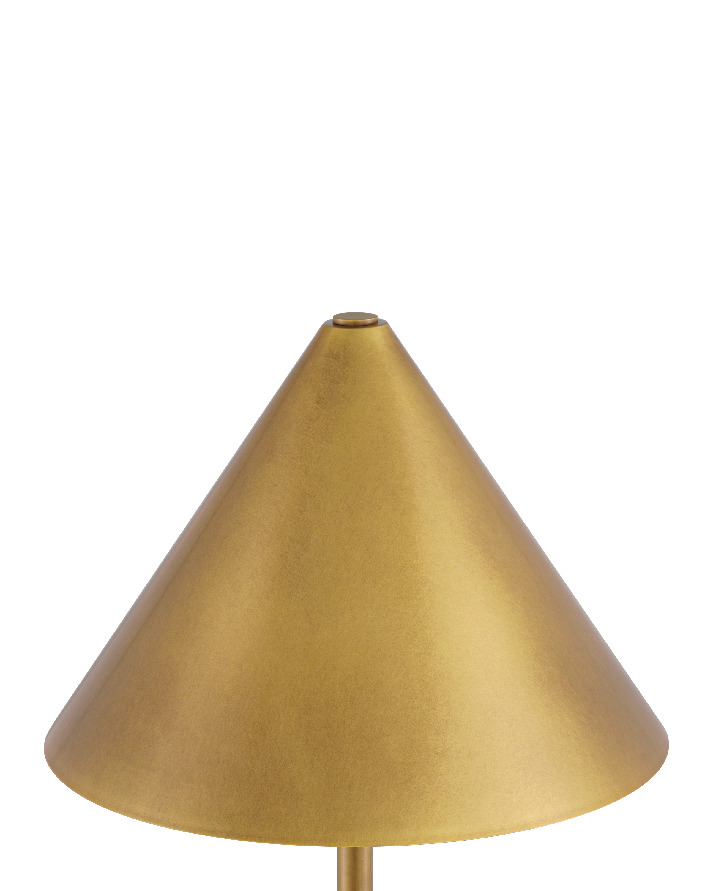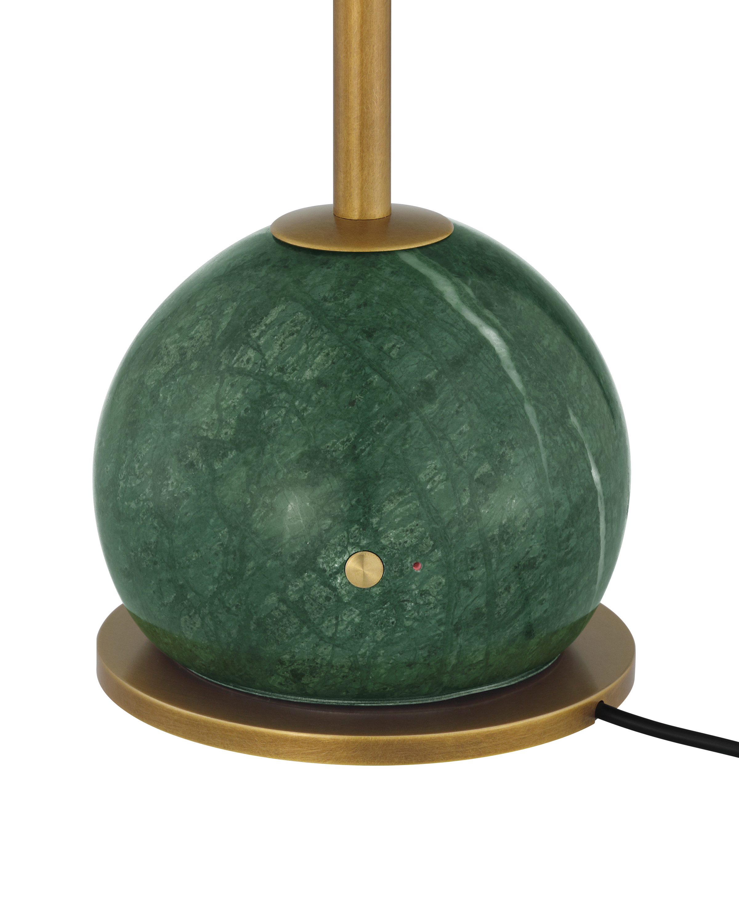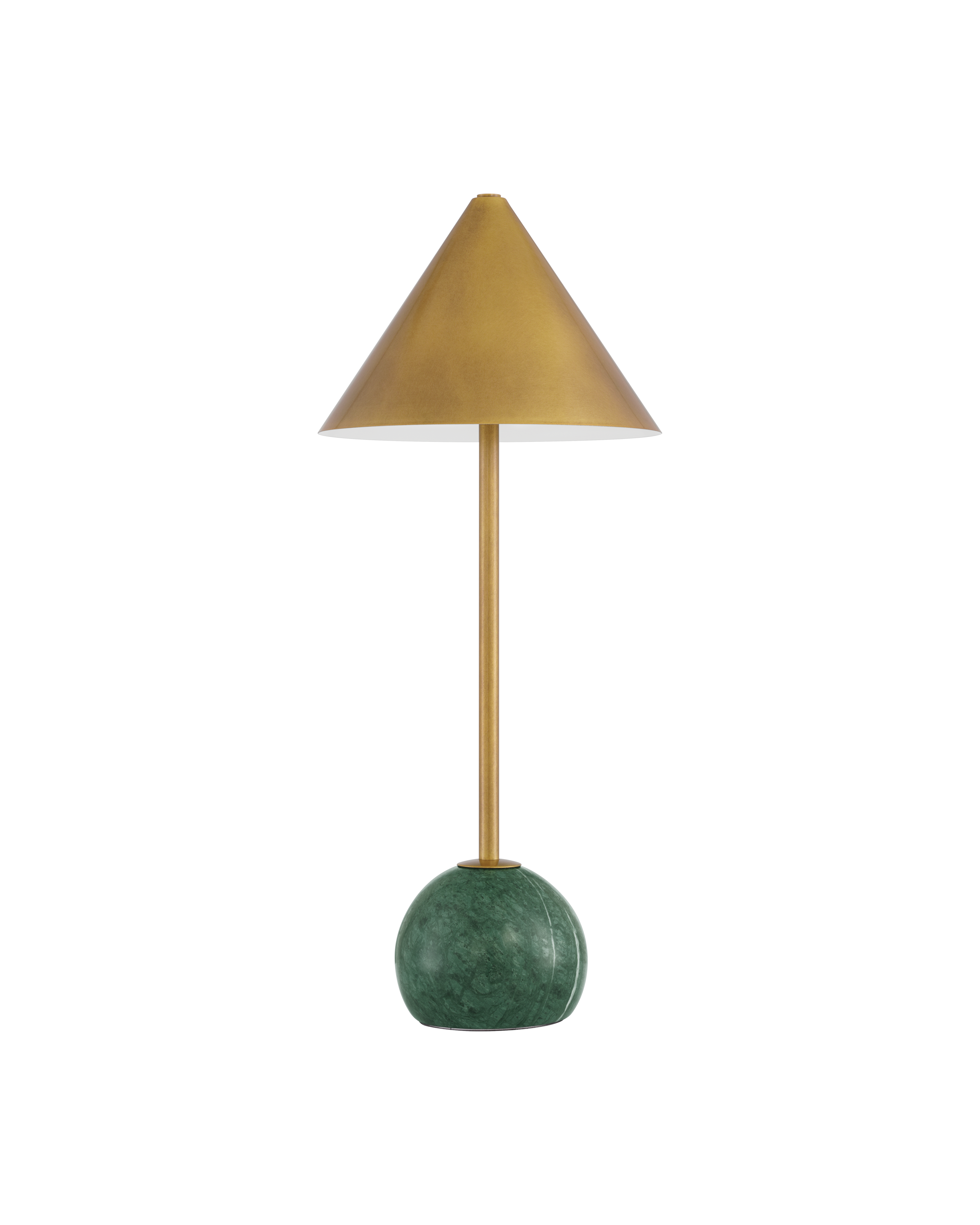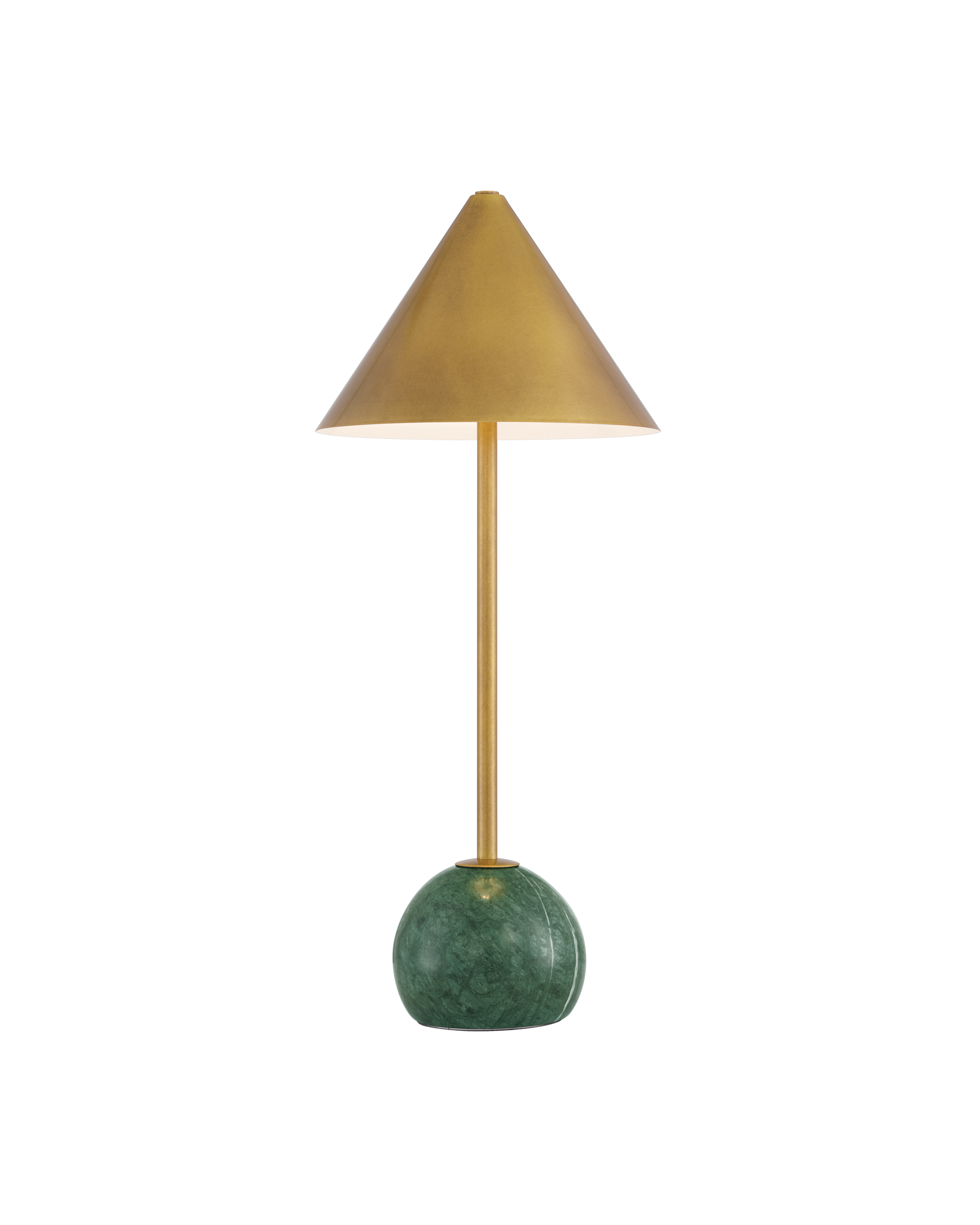The Journey Green & Brass Cordless Table Lamp packs a fashionable punch for a portable design. The antique brass finish on the long thin stem and the cone-shaped shade brings it a subdued sophisticated gleam, while the green marble globeon the bottom anchors the piece. At less than 20 inches tall, the gold lamp has an on and off button and a battery-life indication light that alerts when it is time to recharge on the side of the base.