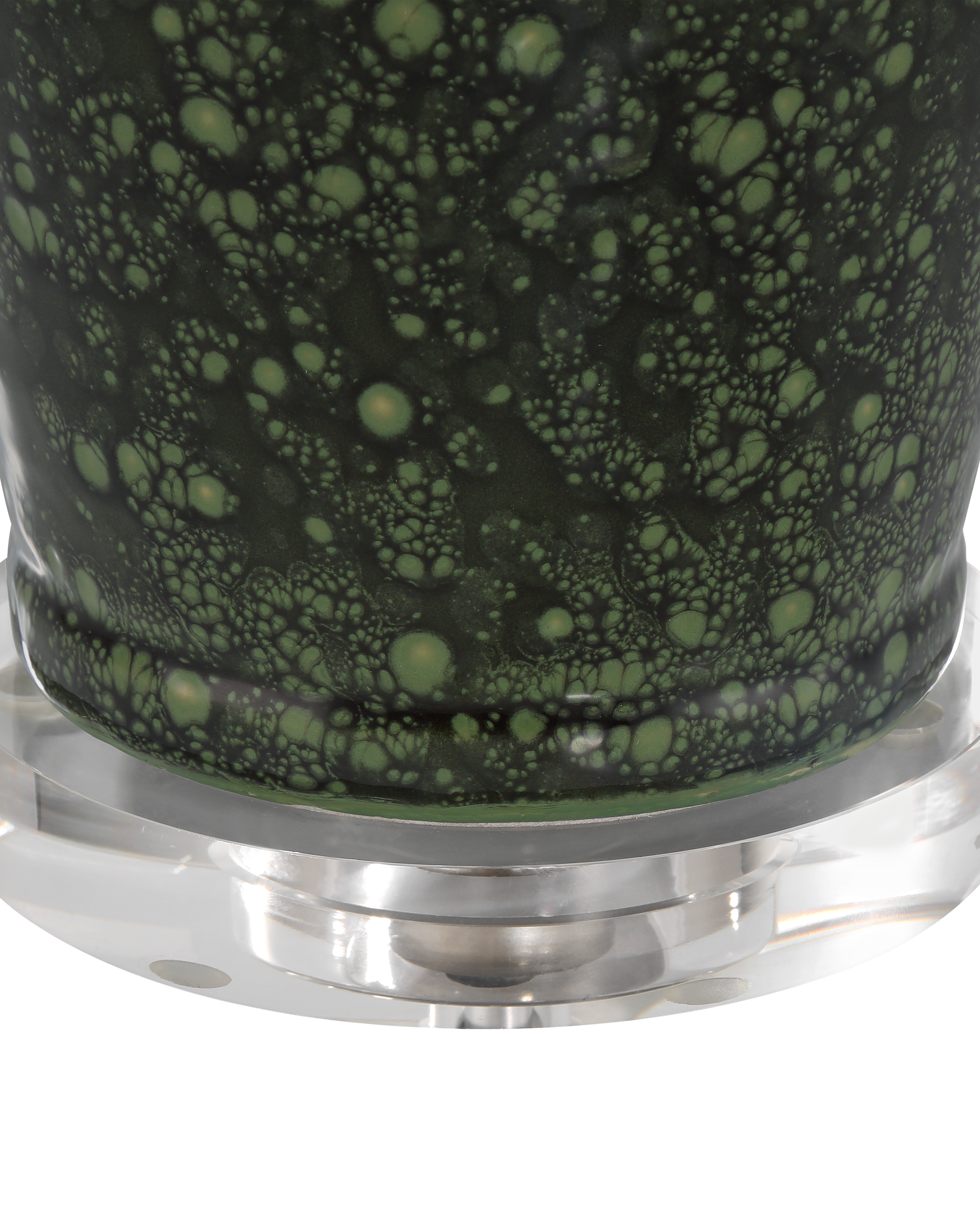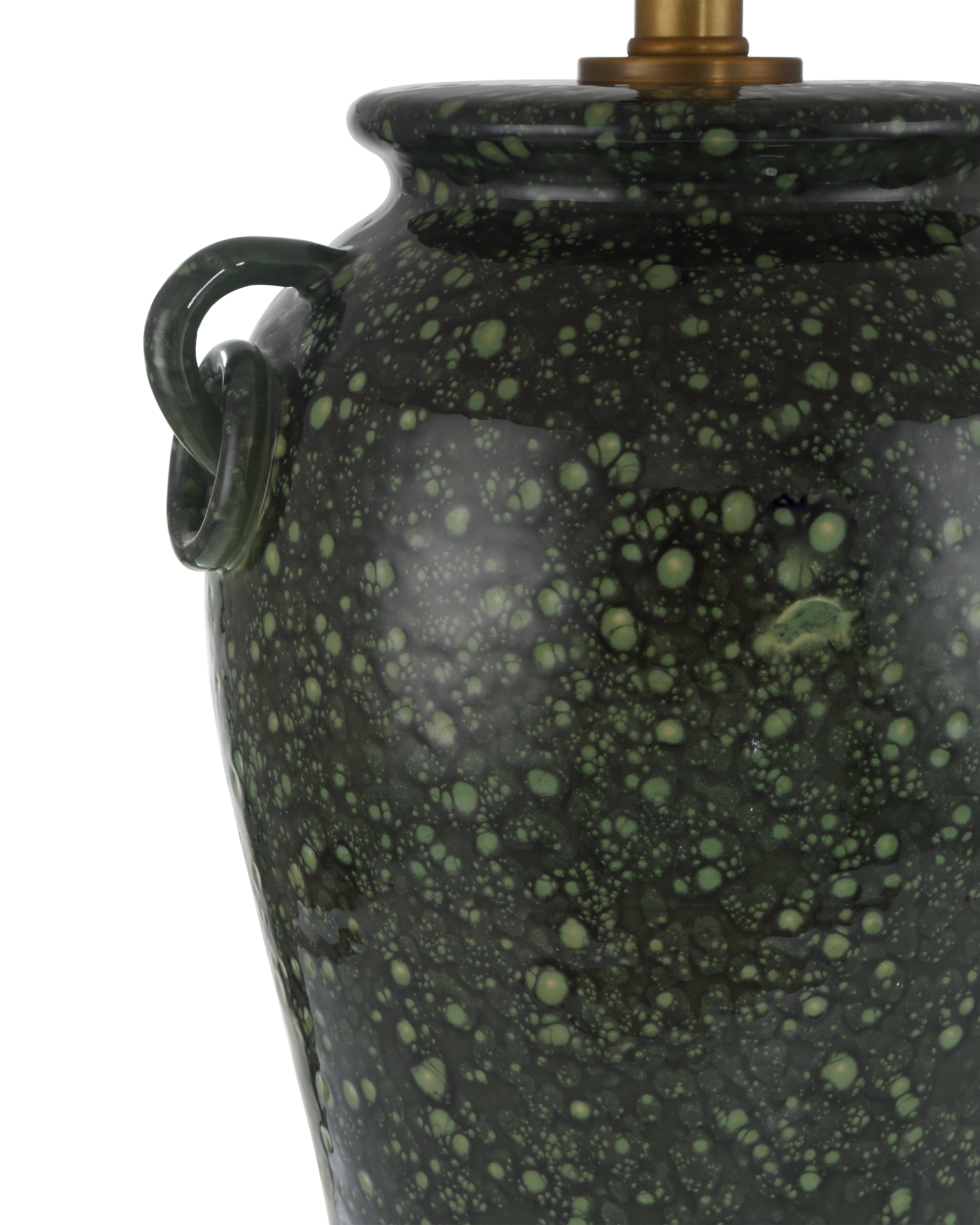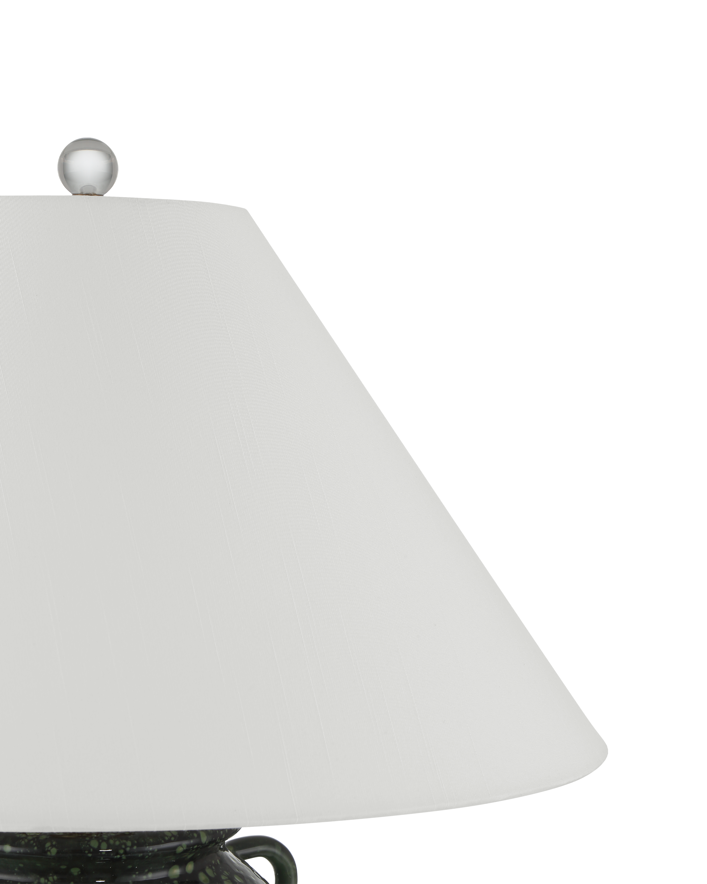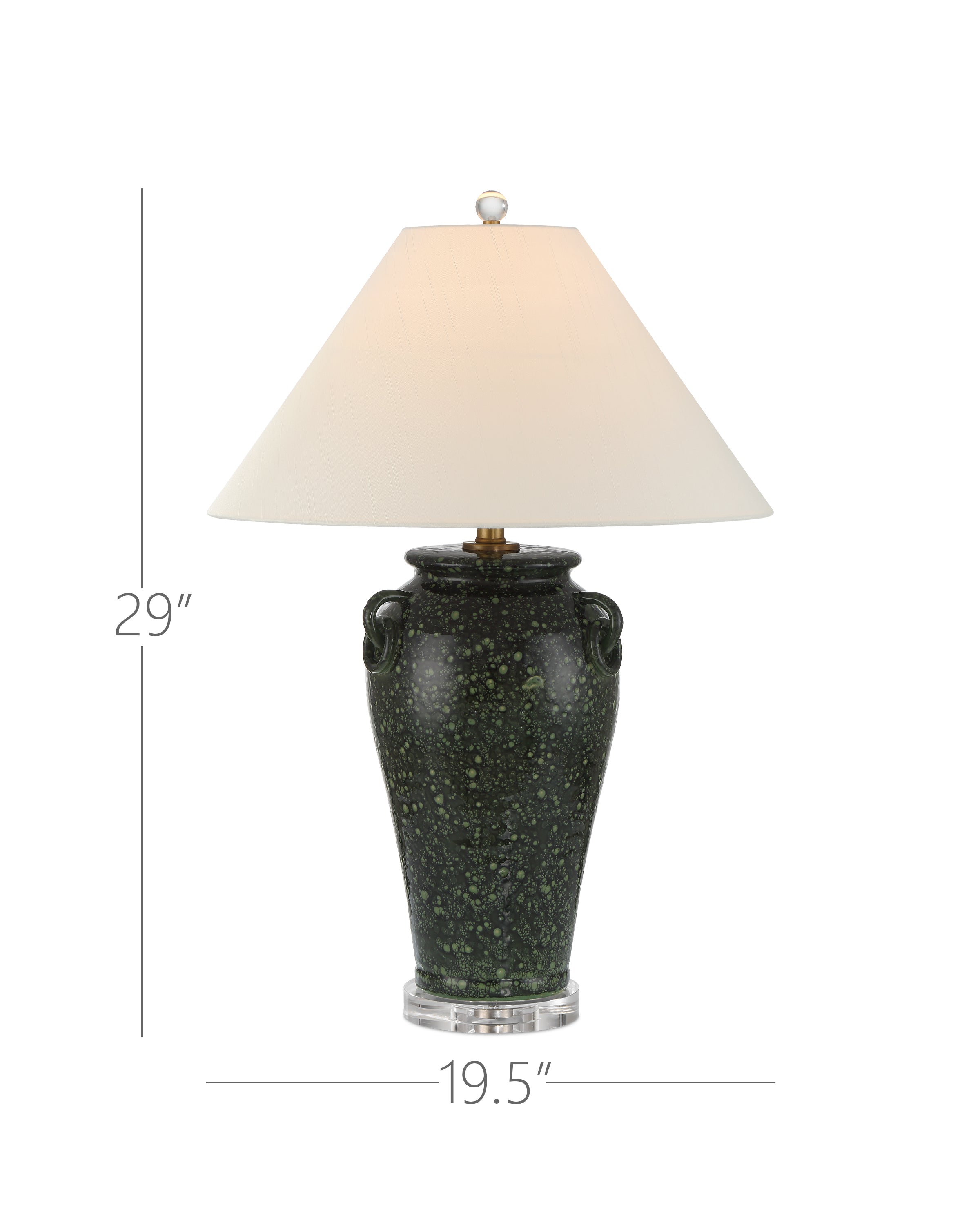 The Junko Green Table Lamp features an amphora-shaped terracotta body finished with a mottled green glaze, created through an artisanal firing process where oxides form tiny surface bubbles, adding rich texture and depth. Antique brass hardware introduces warmth, while an optic crystal base and metal finial provide a crisp, luminous contrast. The look is completed with a pale, flared empire shade that adds a tailored and refined finish.