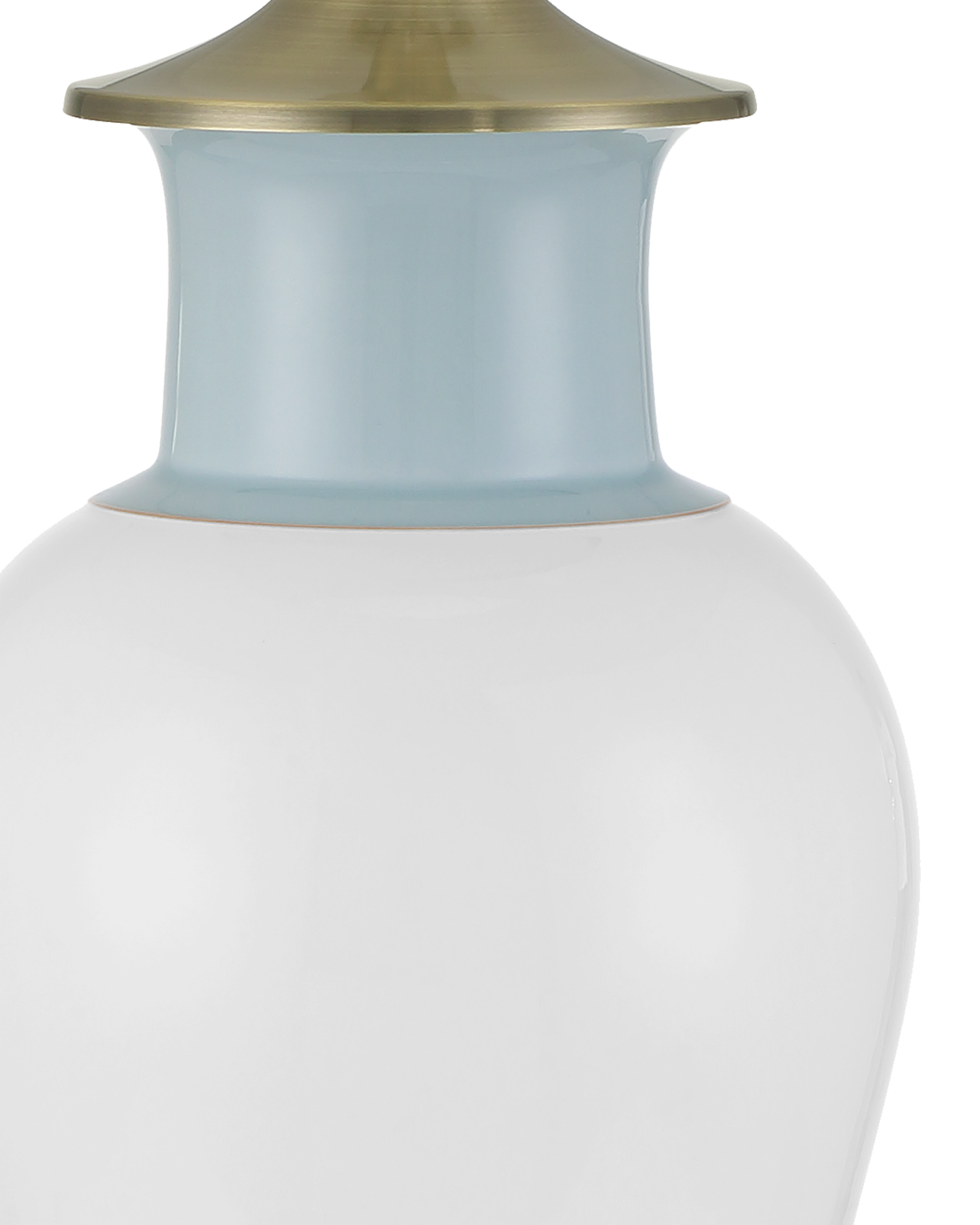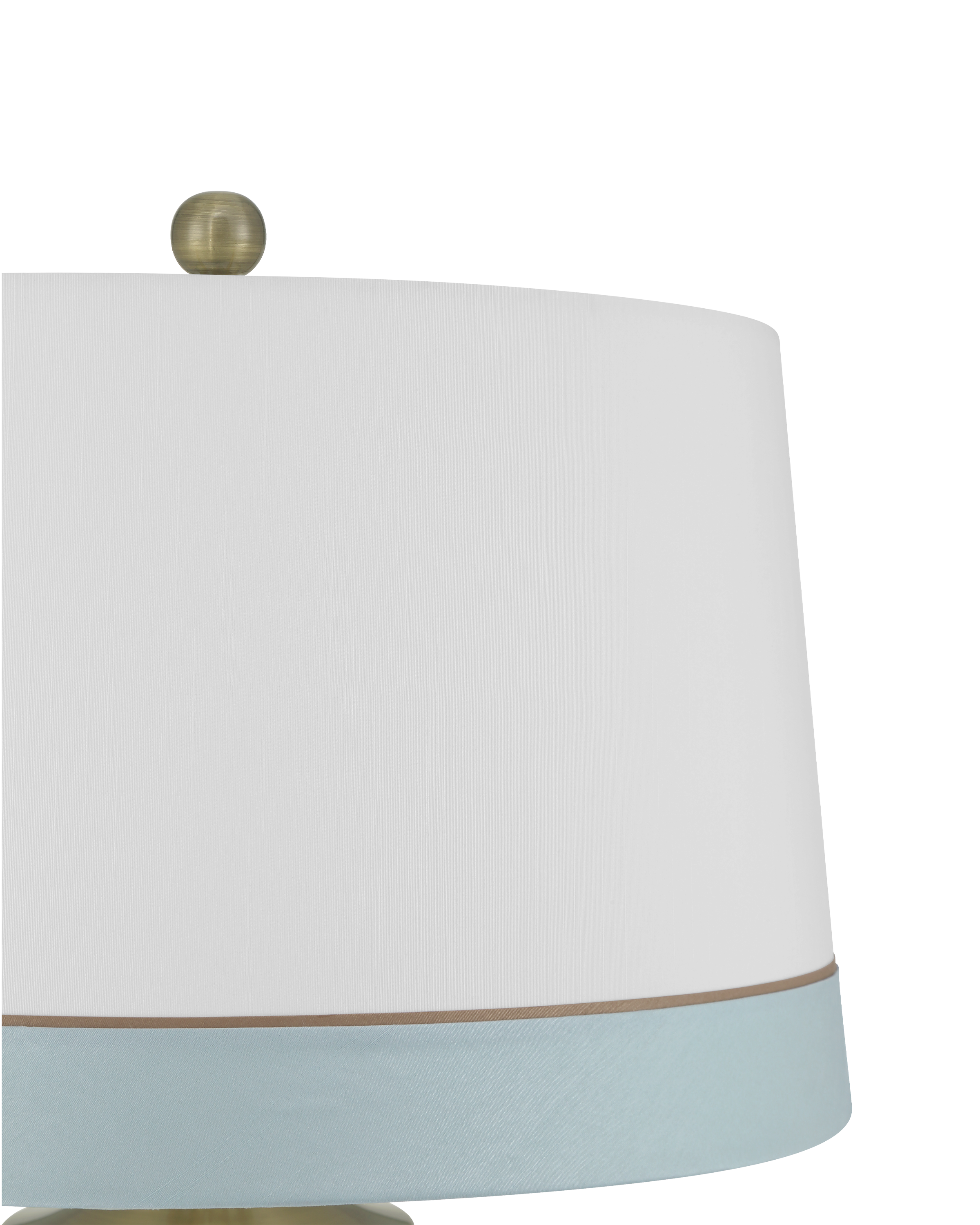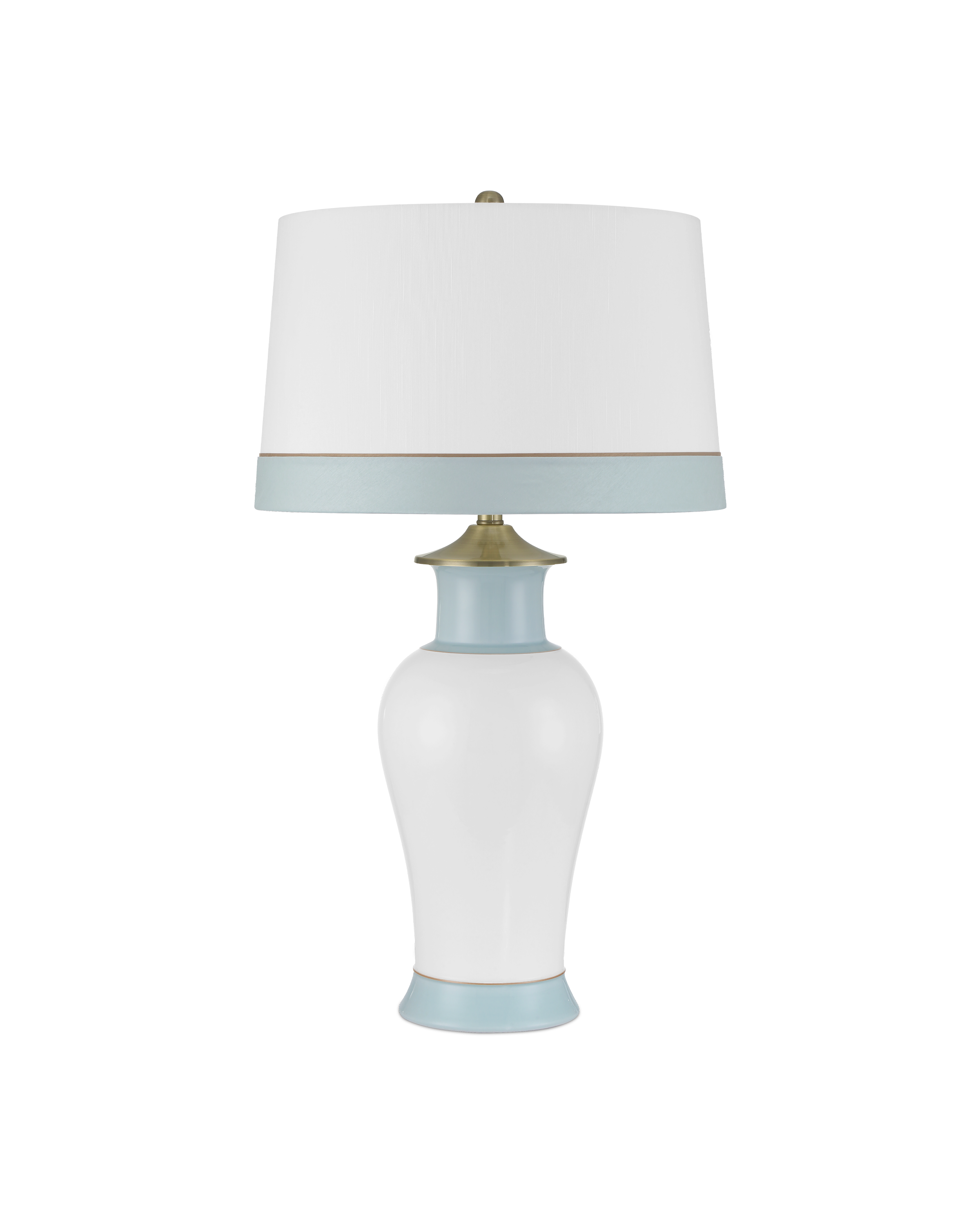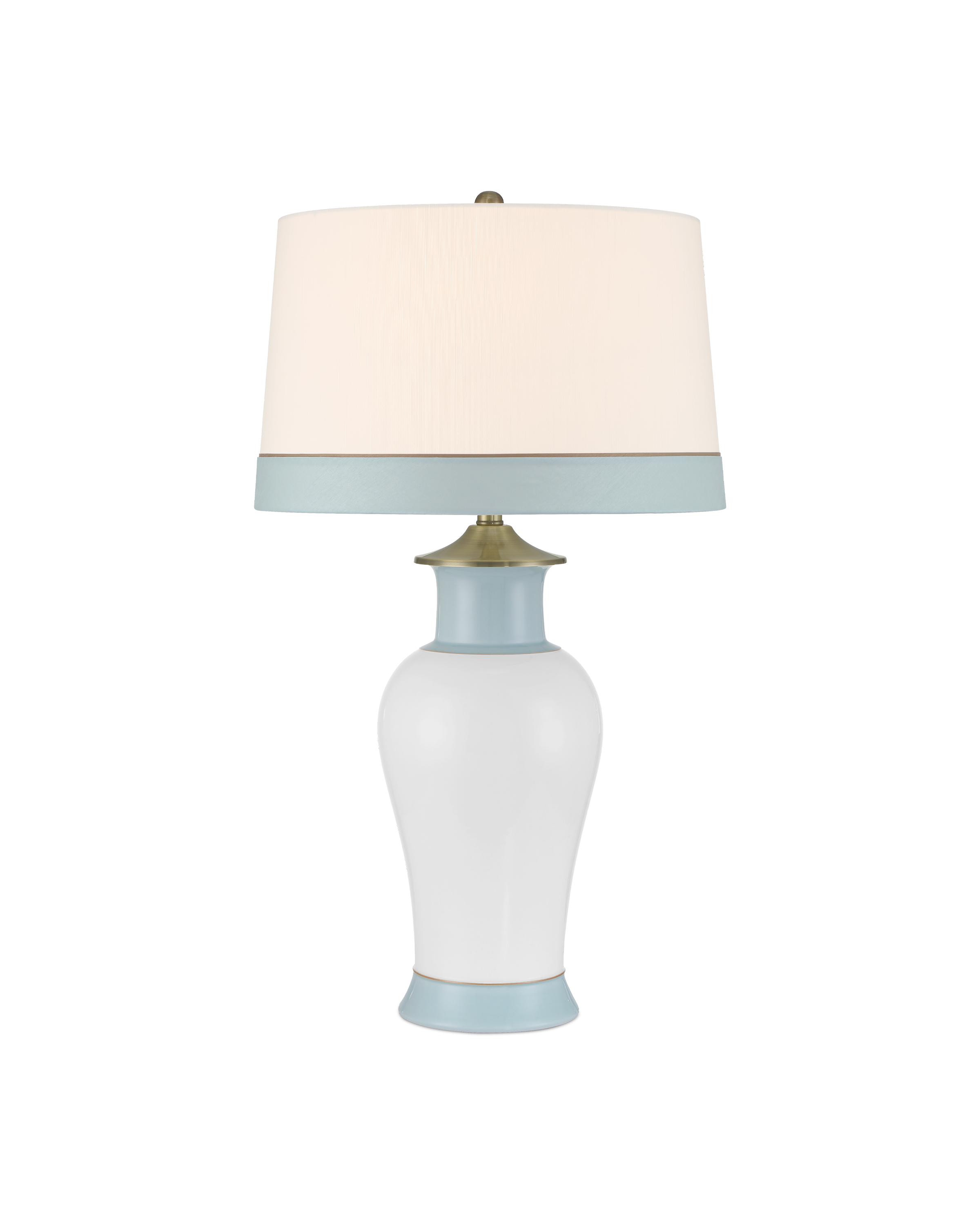 The Kora Blue Table Lamp has a crisp white ground on which pale blue stripes are painted at the bottom and top. A slender brown line separates the bottom one from the white, a detail thoughtfully echoed on the lamp’s shade. A brushed brass cap sits just beneath the shade and is mirrored by the matching finial, adding a warm metallic accent that subtly elevates the piece.