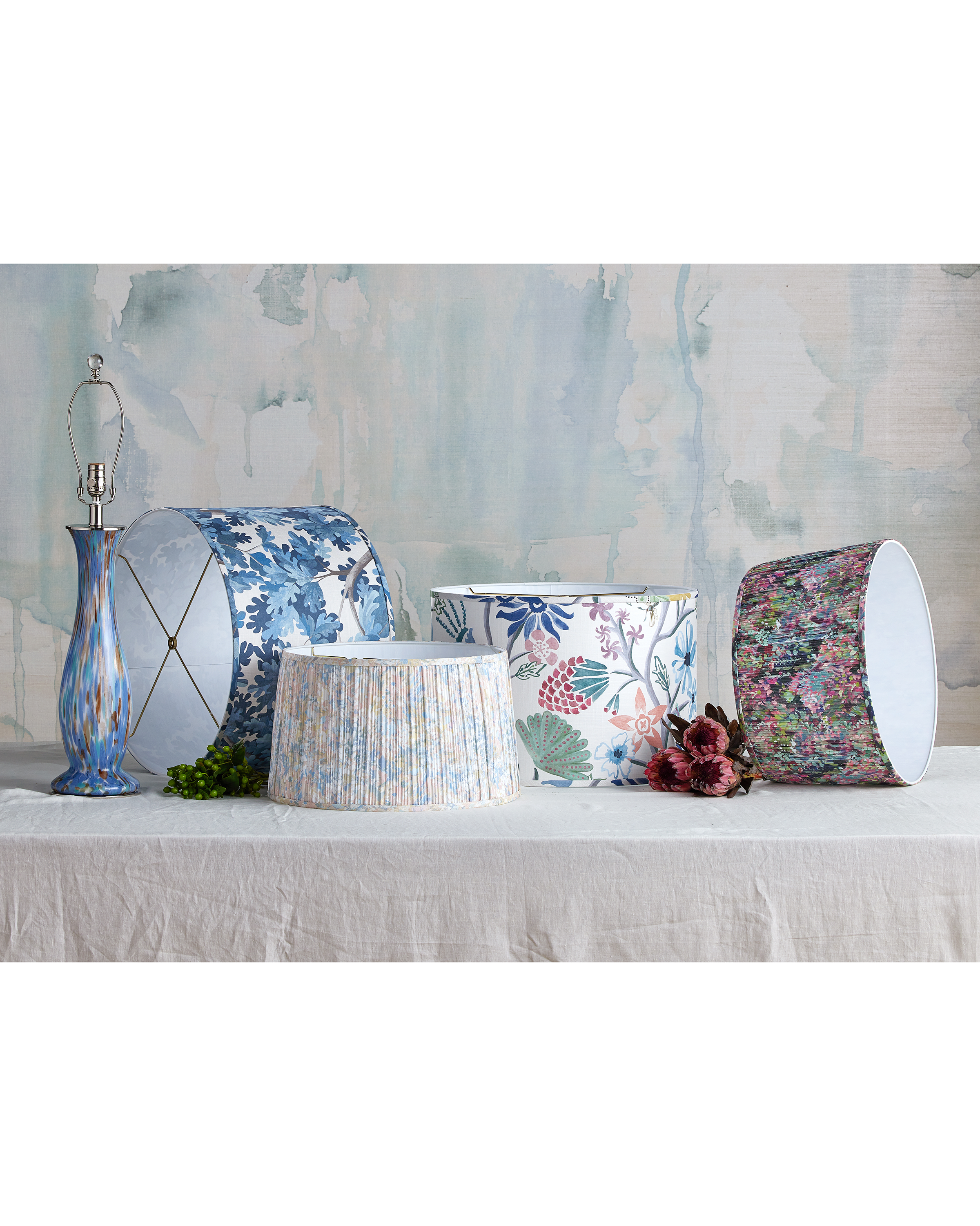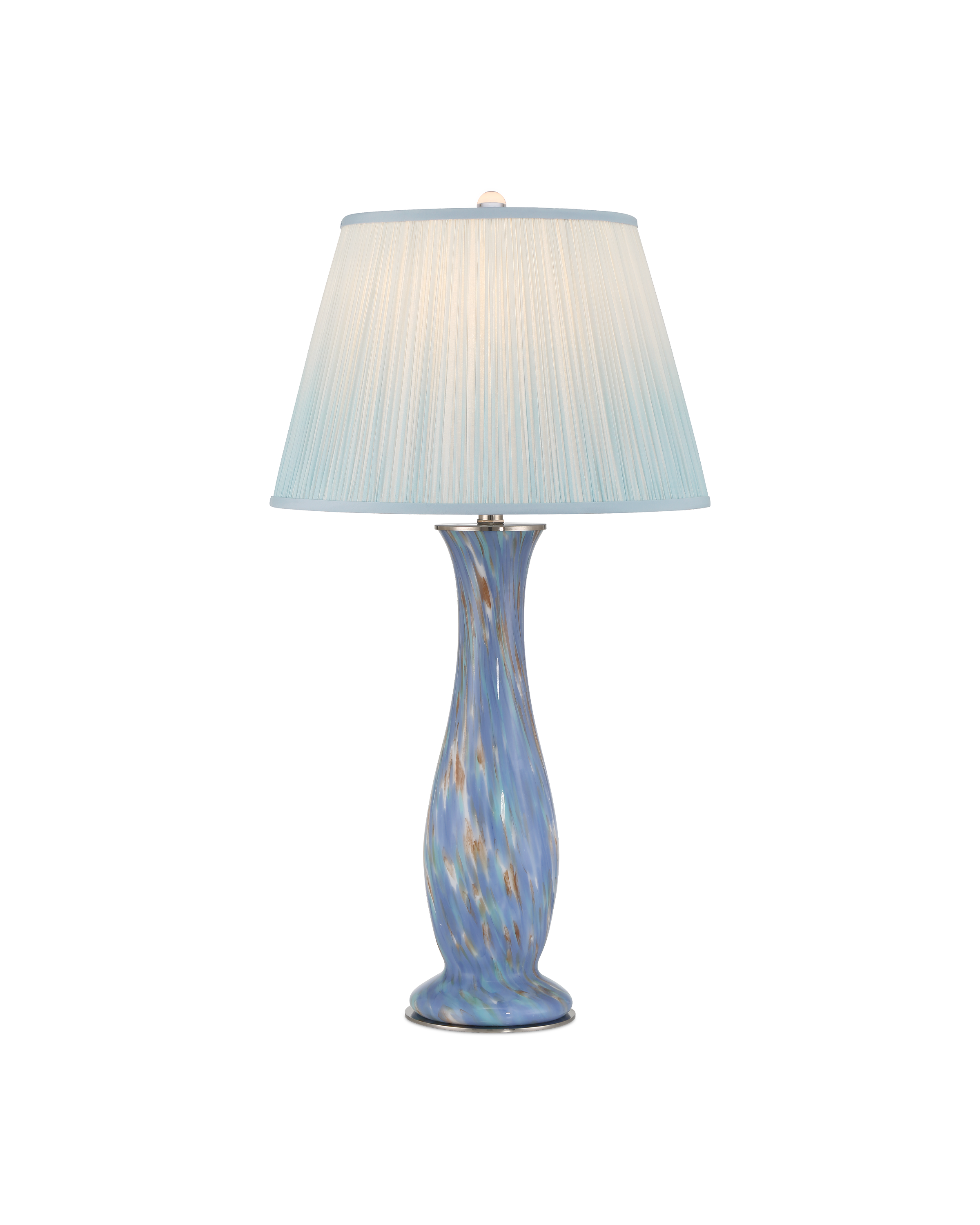 The Lapis Blue Table Lamp has a gleaming glass body on which streaks of white, deep blue, and iridescent copper twist together to create a mesmerizing Easter-egg effect. This swirling pattern gives the lamp a strong sense of movement achieved through a painstaking fusion of marbling and glass-fusing techniques that are difficult to master in combination. Topped with a pleated ombré blue shade, the lamp’s silhouette is inspired by the tallest vase ever created by celebrated French glassmaker Charles Schneider in 1925.
