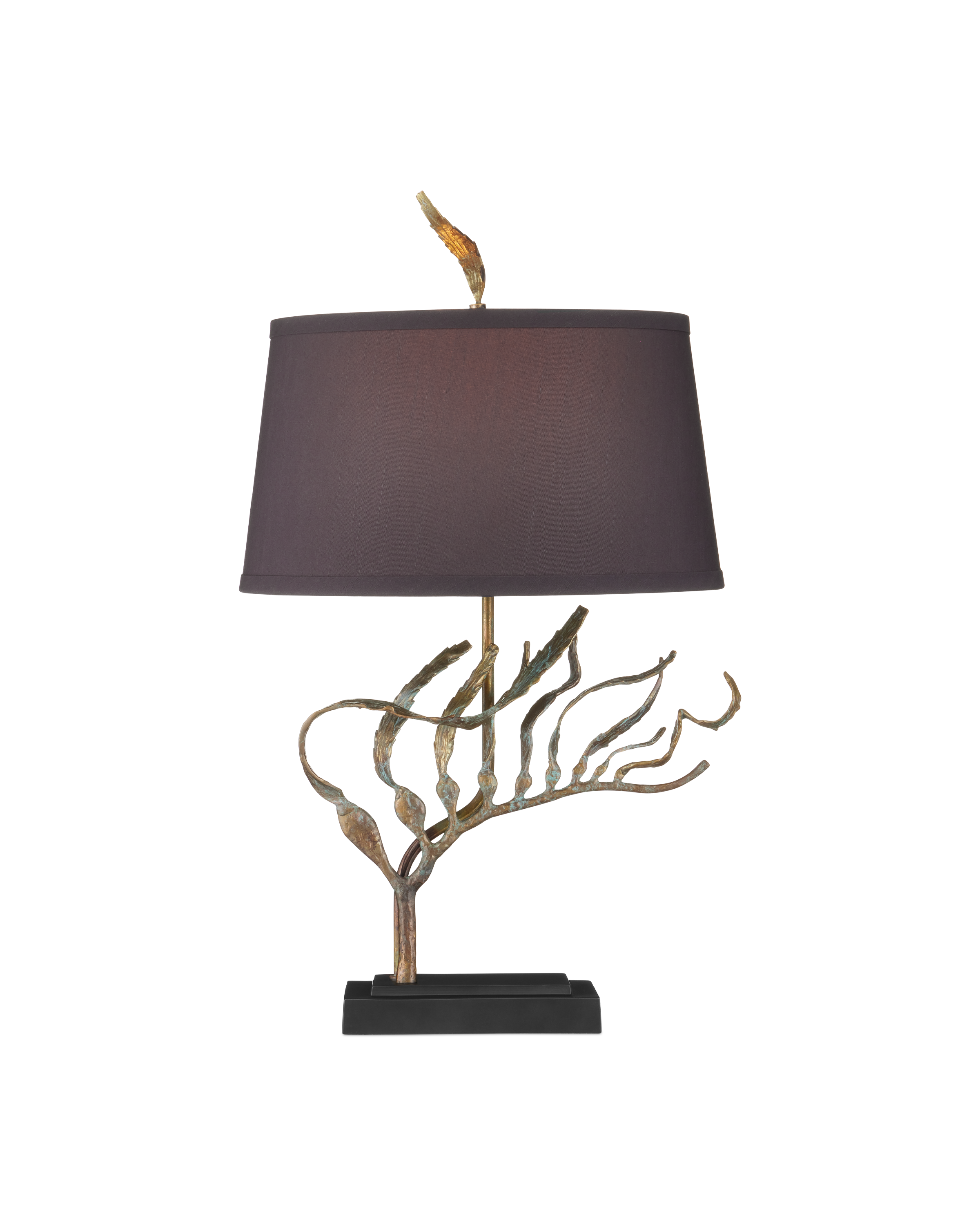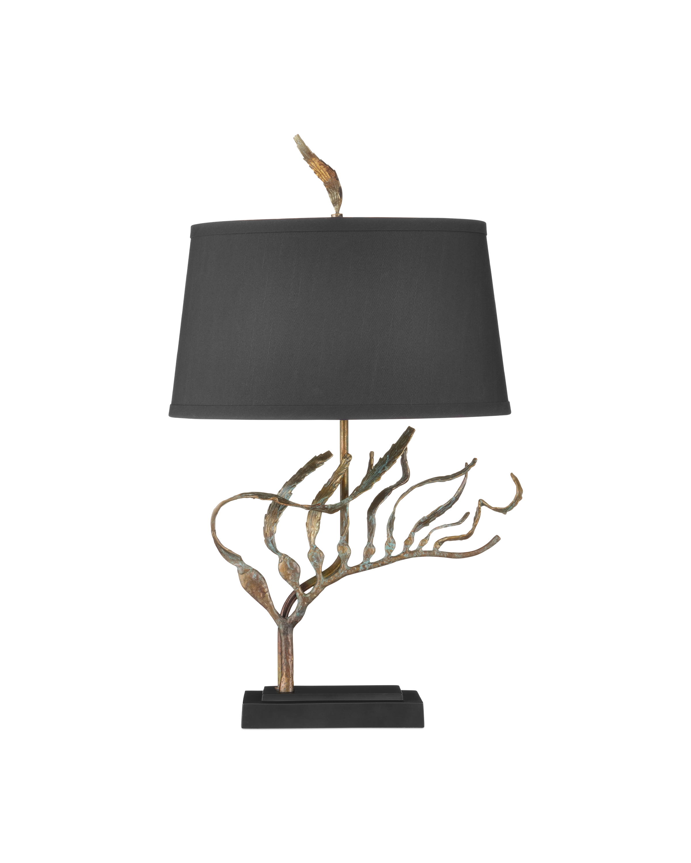 The Latissima Table Lamp is a sculptural brass design with fluid metal extensions that mimic the movement of kelp swaying beneath the sea resting on a stacked black metal base. Finished in a verdigris patina, each piece reflects artisan craftsmanship and organic elegance. A matching kelp-like finial secures the black shade, which is lined in gold fabric to cast a warm, ambient glow.