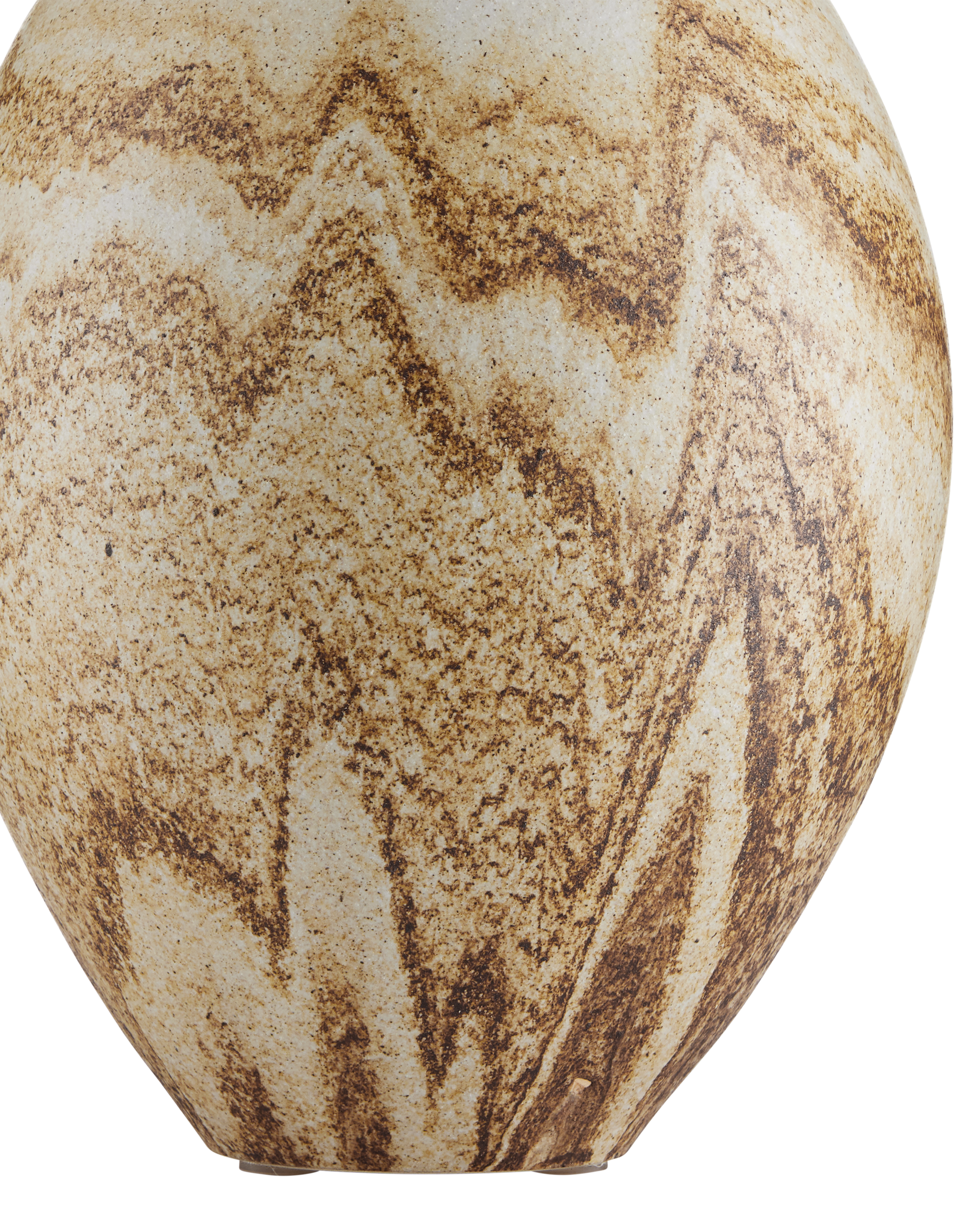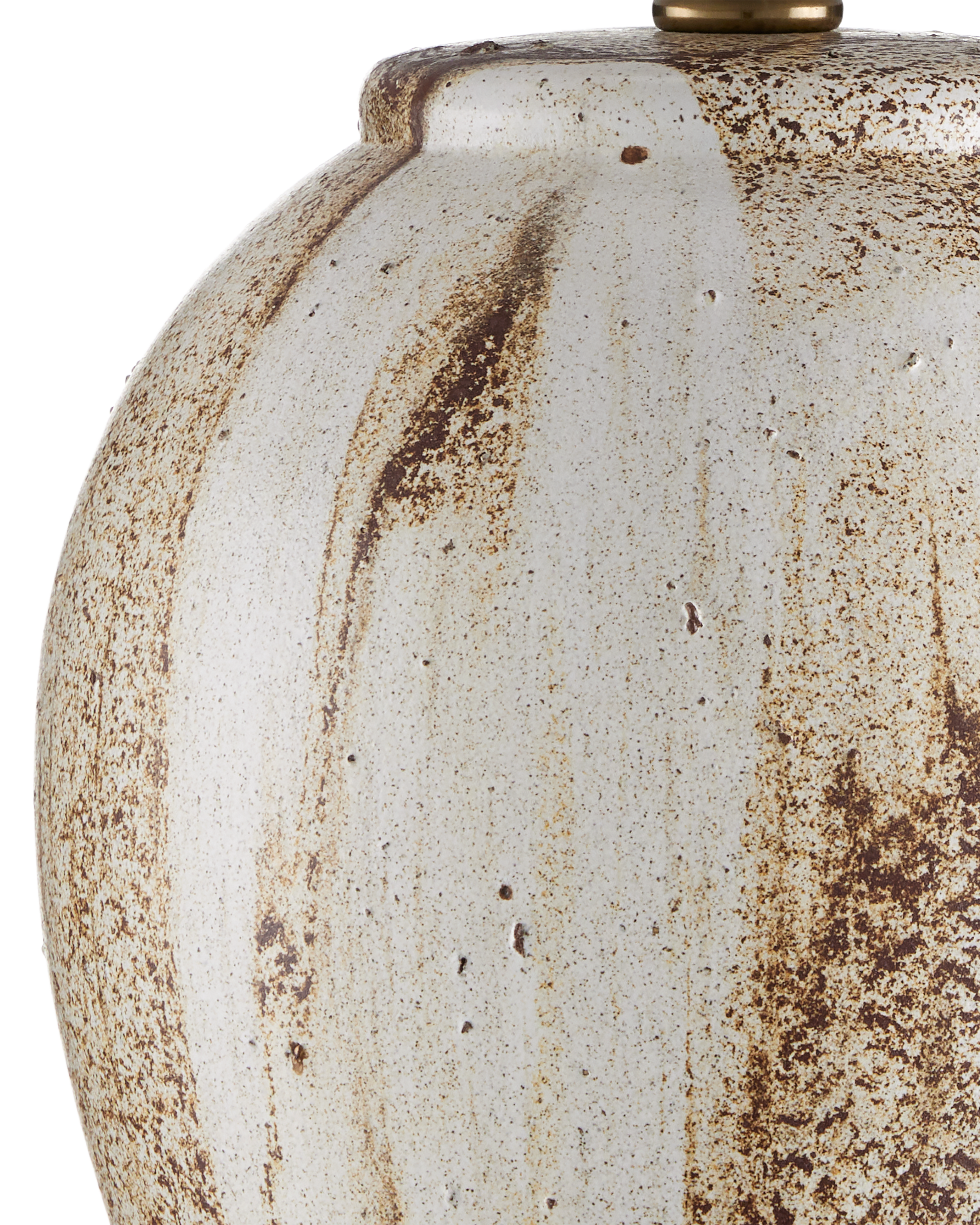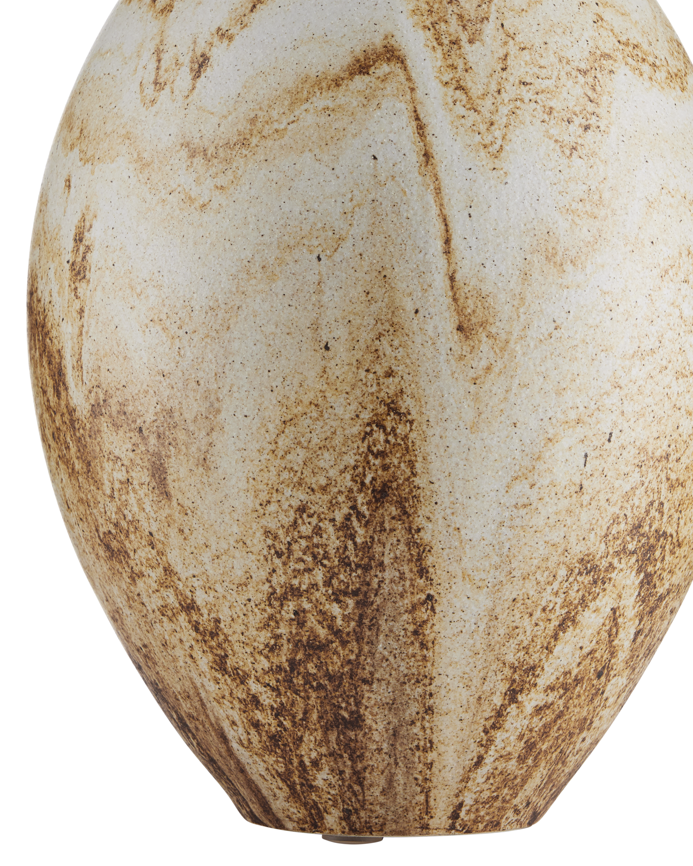 The Latte Beige Table Lamp is made of ceramic in a mix of beige, off-white, and brown glazing that mimics the way cream swirls into coffee. Because glazing ceramic is an artisanal process, this design will vary from piece to piece. The warmth of the empire shade when the lights are switched on draw out the tan tones in the lamp's body.