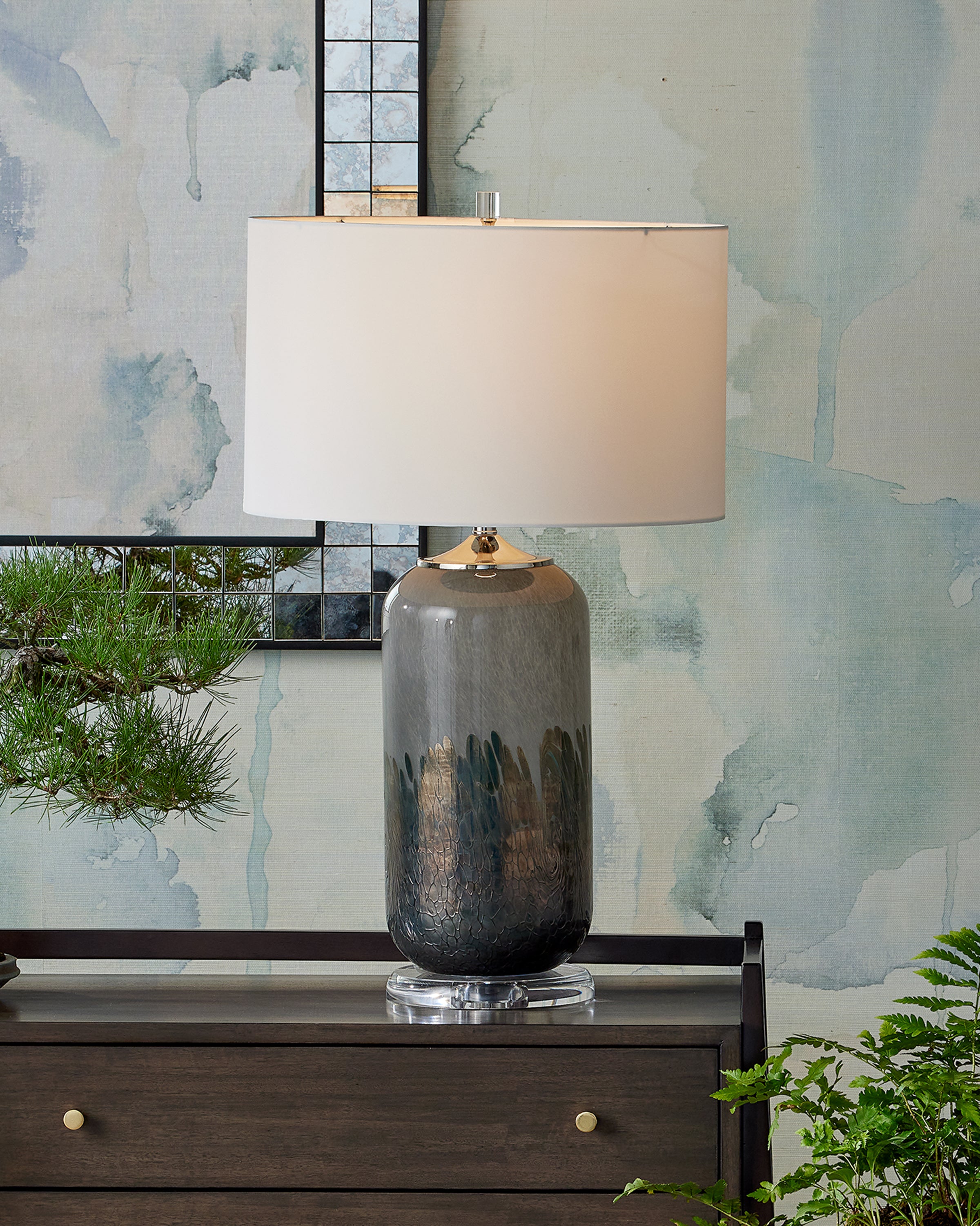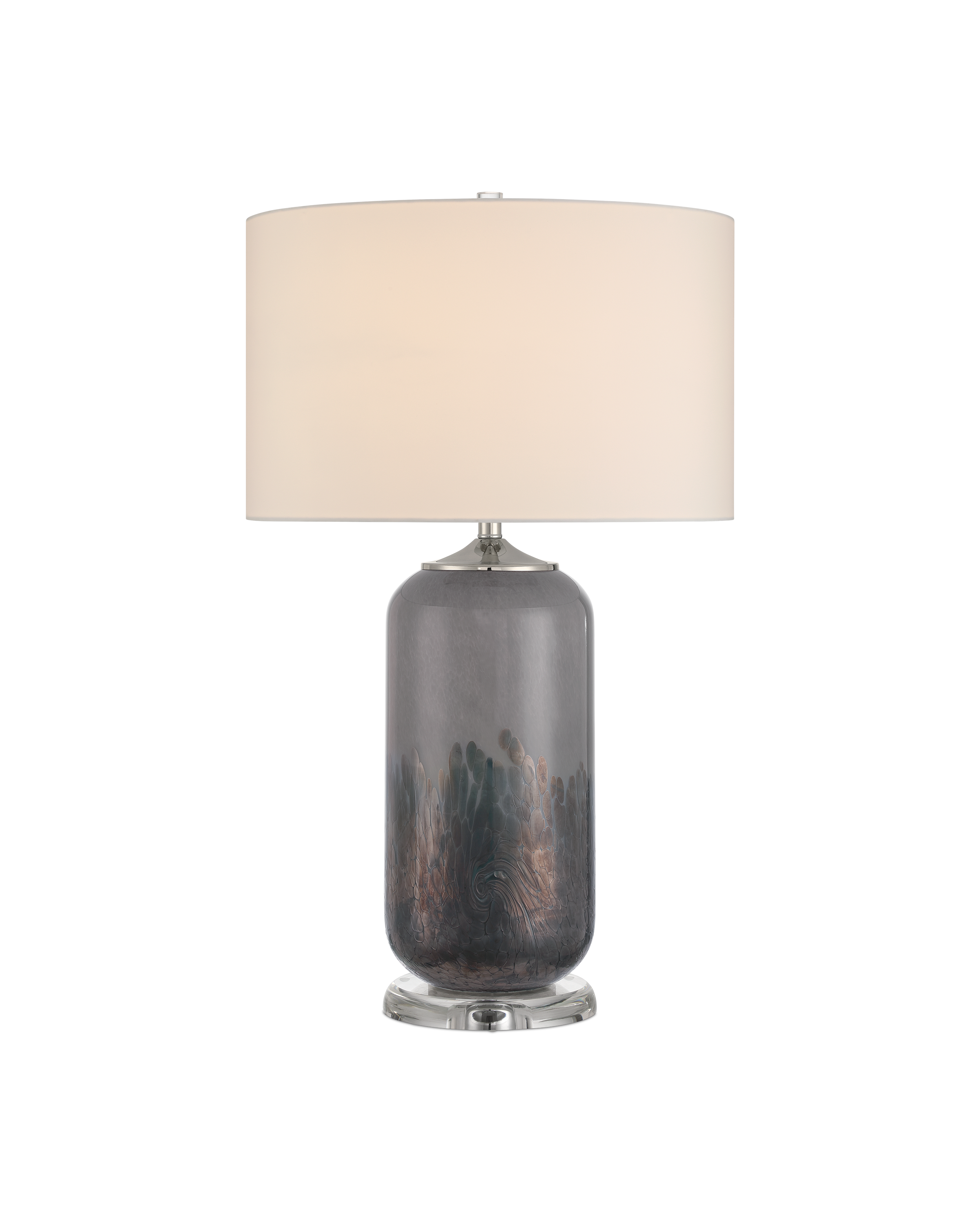 The Currey & Company Lewes Table Lamp has a body of gray glass with a painterly pattern in darker gray tones accentuated with iridescent glazes.