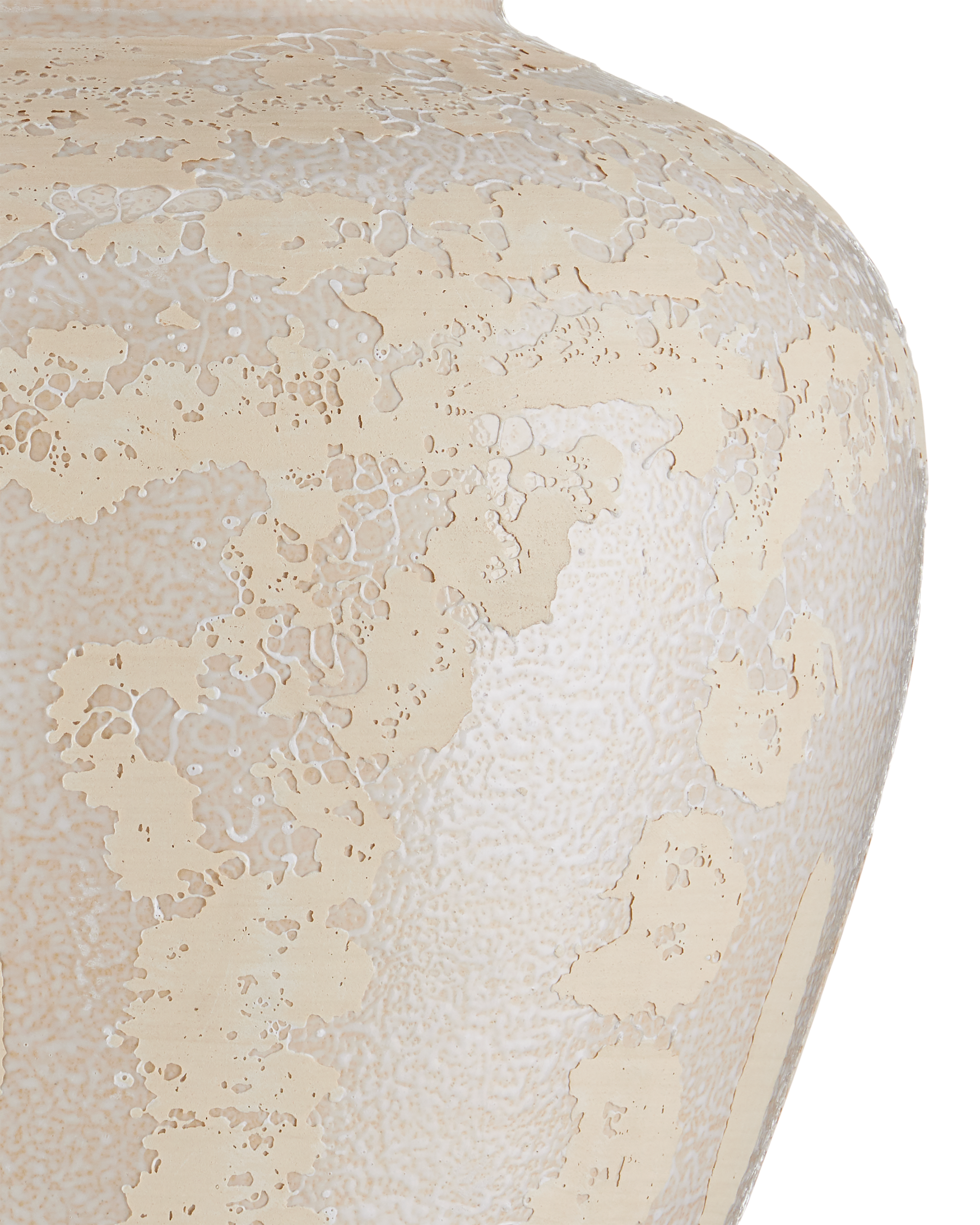 The Mimi Ivory Table Lamp is made of ceramic with a mix of ivory and cream glazing, which creates a swirling pattern to give its surface tone-on-tone depth. The ginger-jar shape of the cream-colored lamp is topped with an drum shade that echoes the pale hues in its body. The artisanal quality comes into full view when the surface of the lamp is viewed close up.