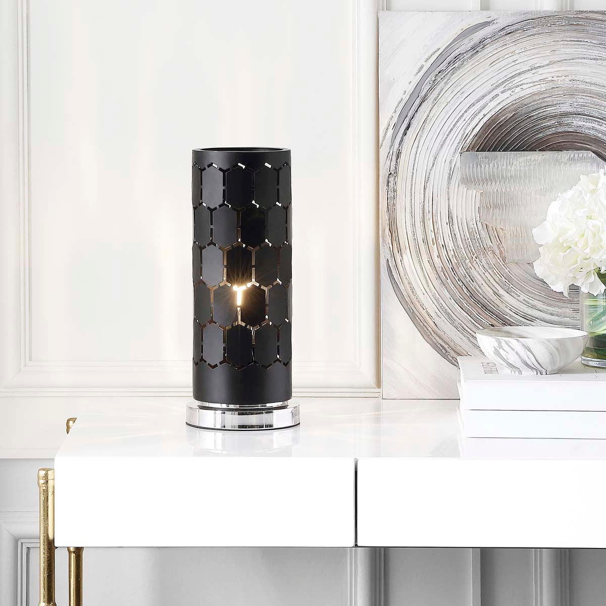 Dramatic and daring, this luxurious contemporary table lamp makes a bold design statement in any living room. Often used in pairs, it?? finely crafted with the depth and style of a chic black cut out hexagon pattern to create a subtle glow.