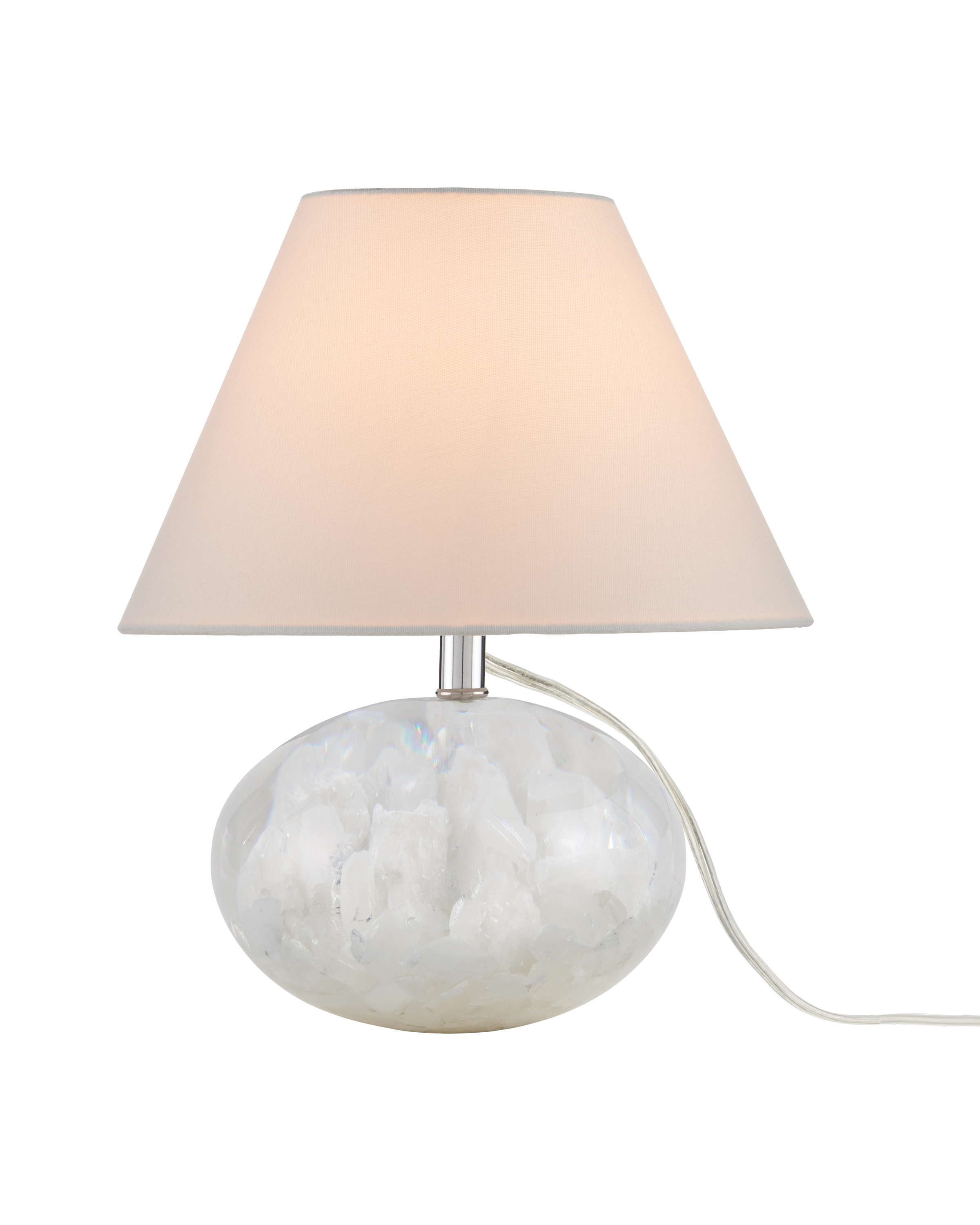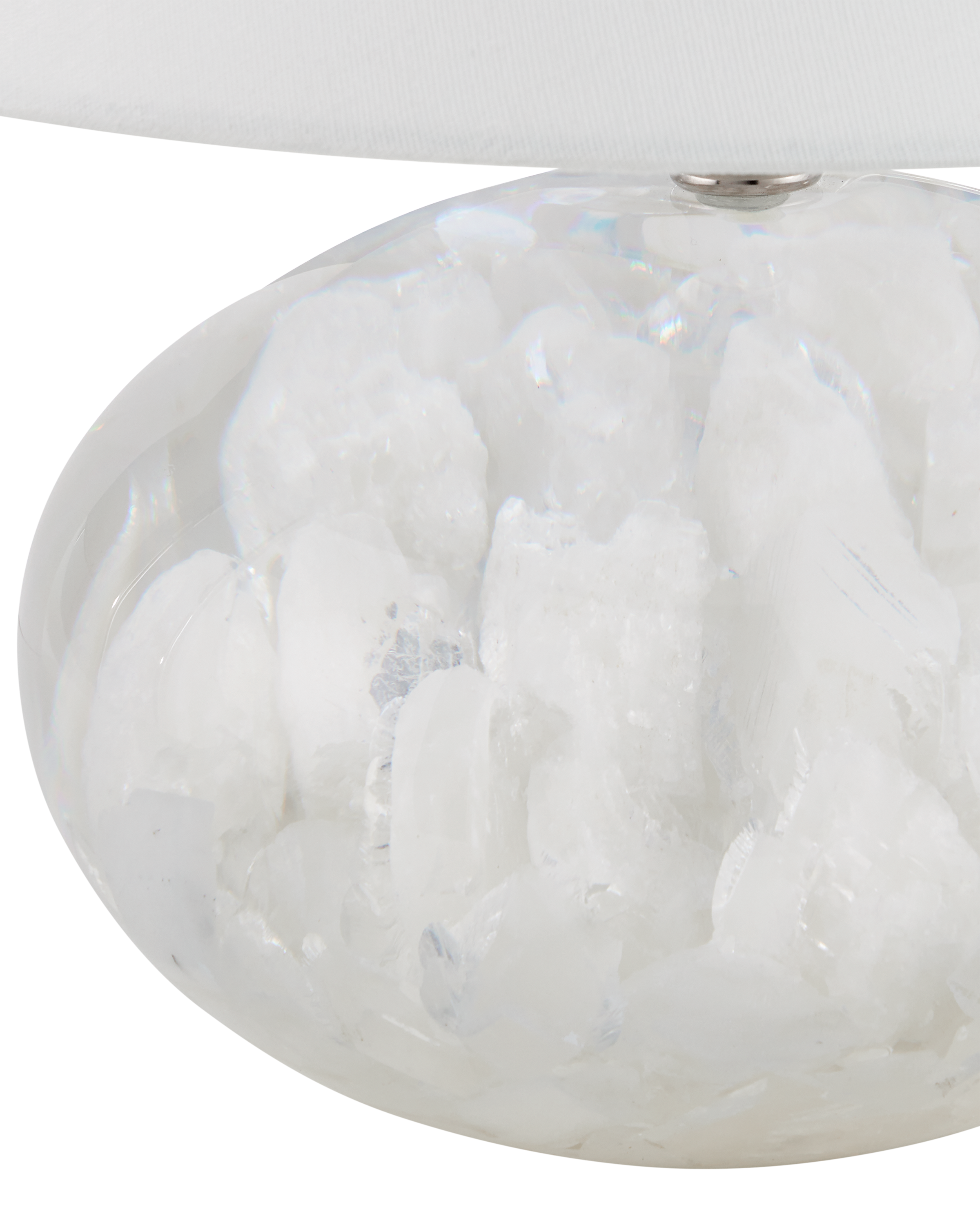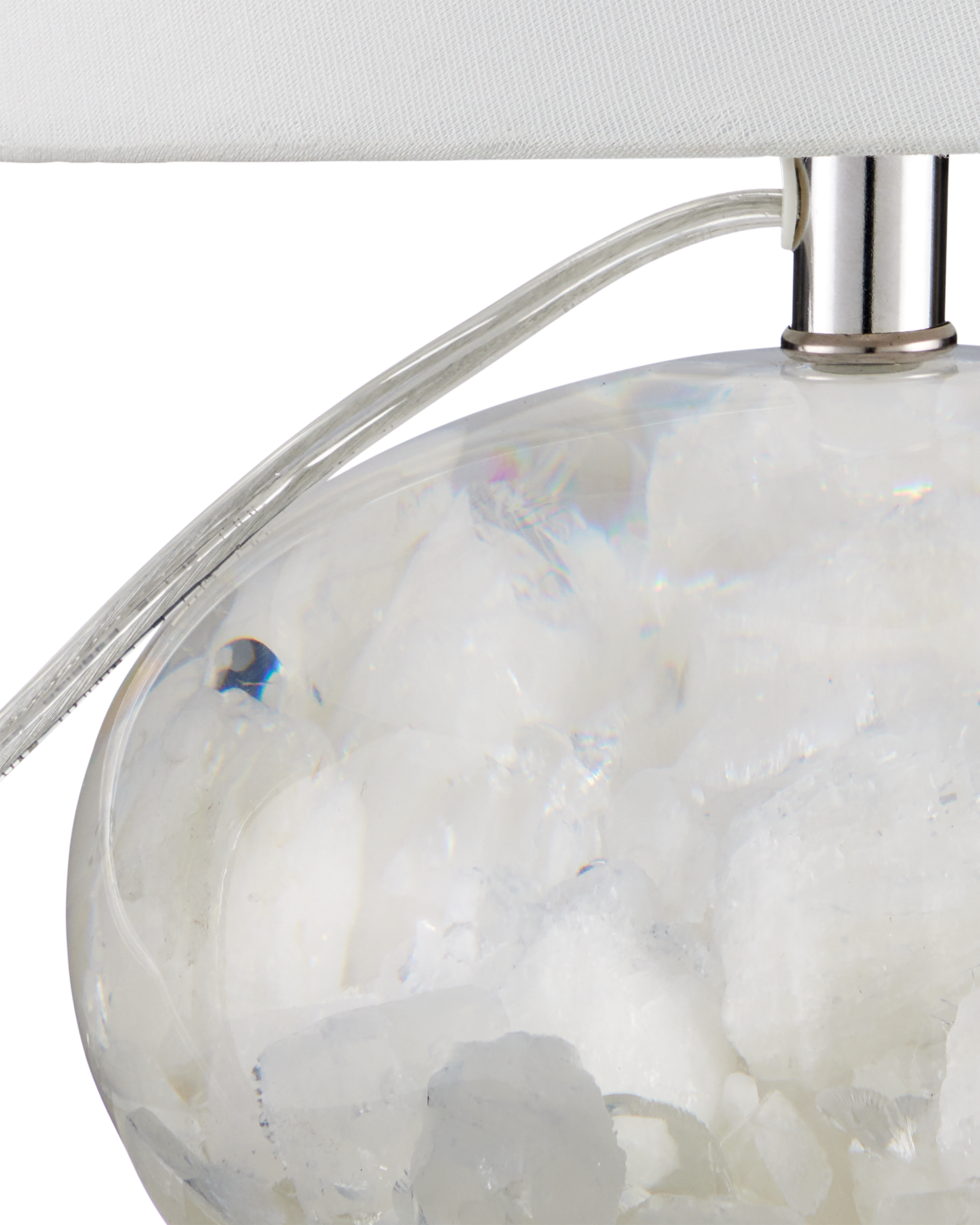 The blossoming cloud-like formations contained in the orb-shaped body of the Odette White Table Lamp were formed when quartz was encased in clear composite. Contributing to the brightness of this design is the polished nickel hardware that rises to disappear under the clean-lined shade. Because this is an artisanal piece, no two of the Odette lamps will be exactly alike.