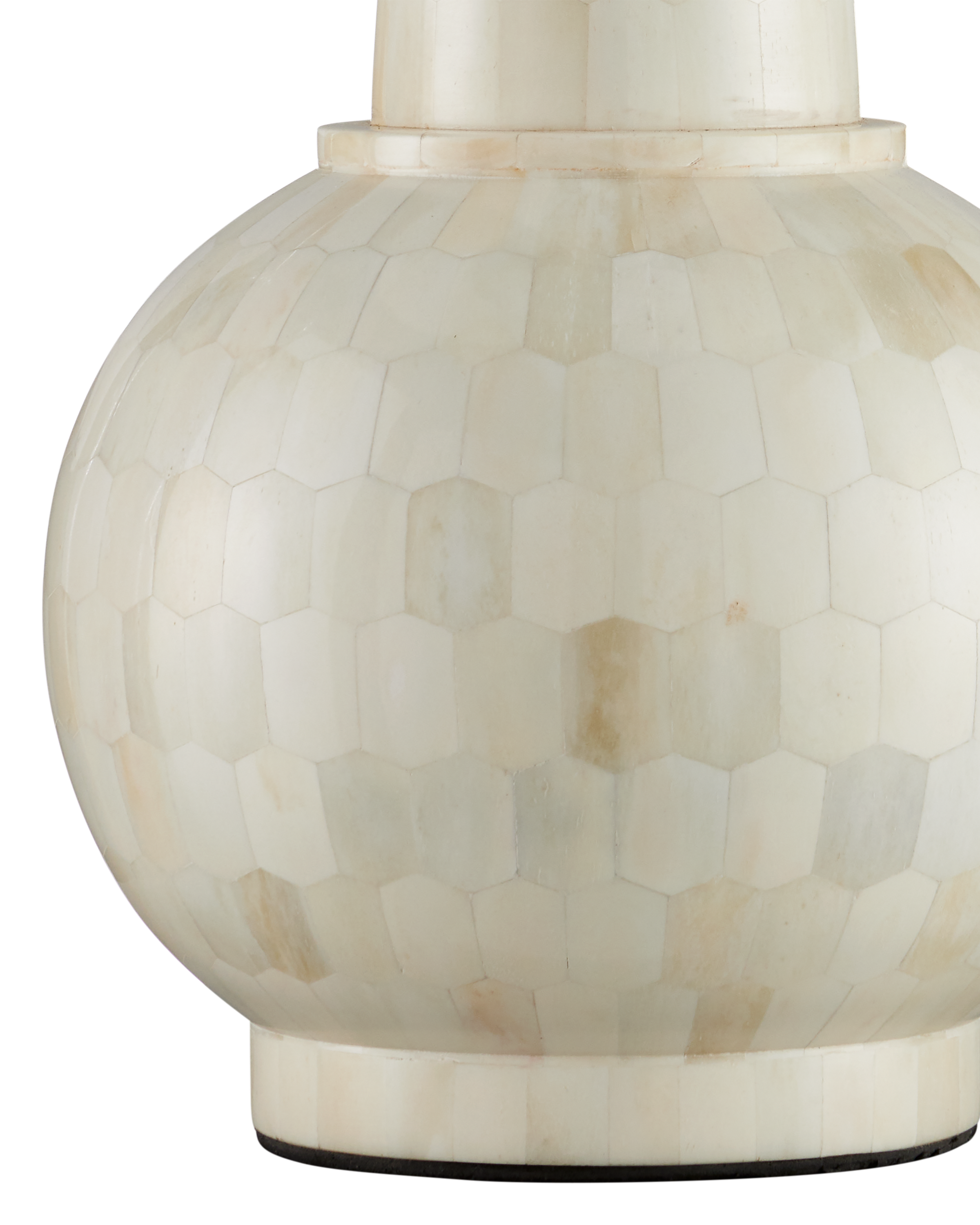 The Osa Table Lamp is a work of art, as its surface is covered in hundreds of pieces of natural bone that were ground into picket-tile shapes before being applied. The precision required to place the pieces so perfectly is a painstaking process. The plinth base the ivory table lamp sits on is also covered in bone.