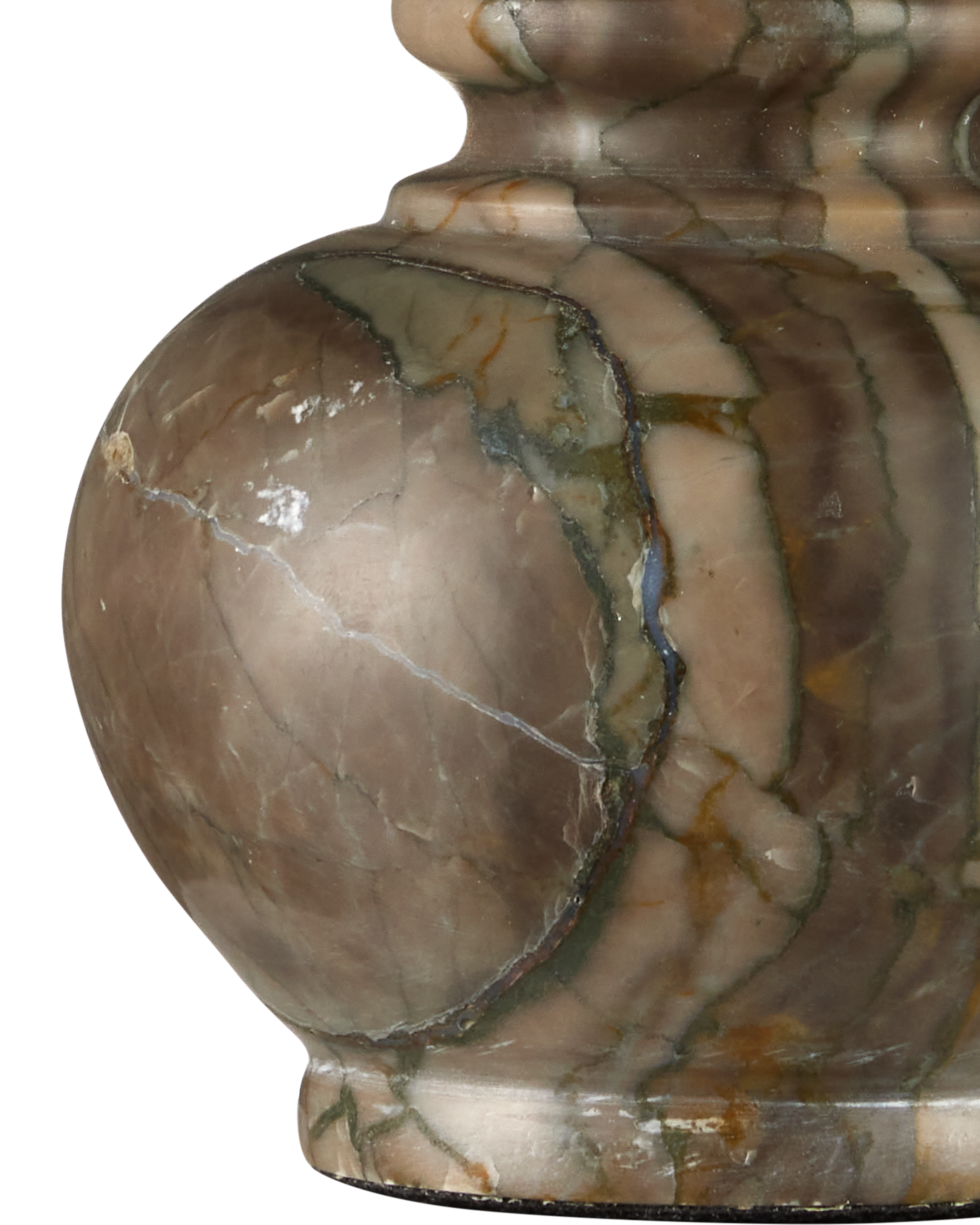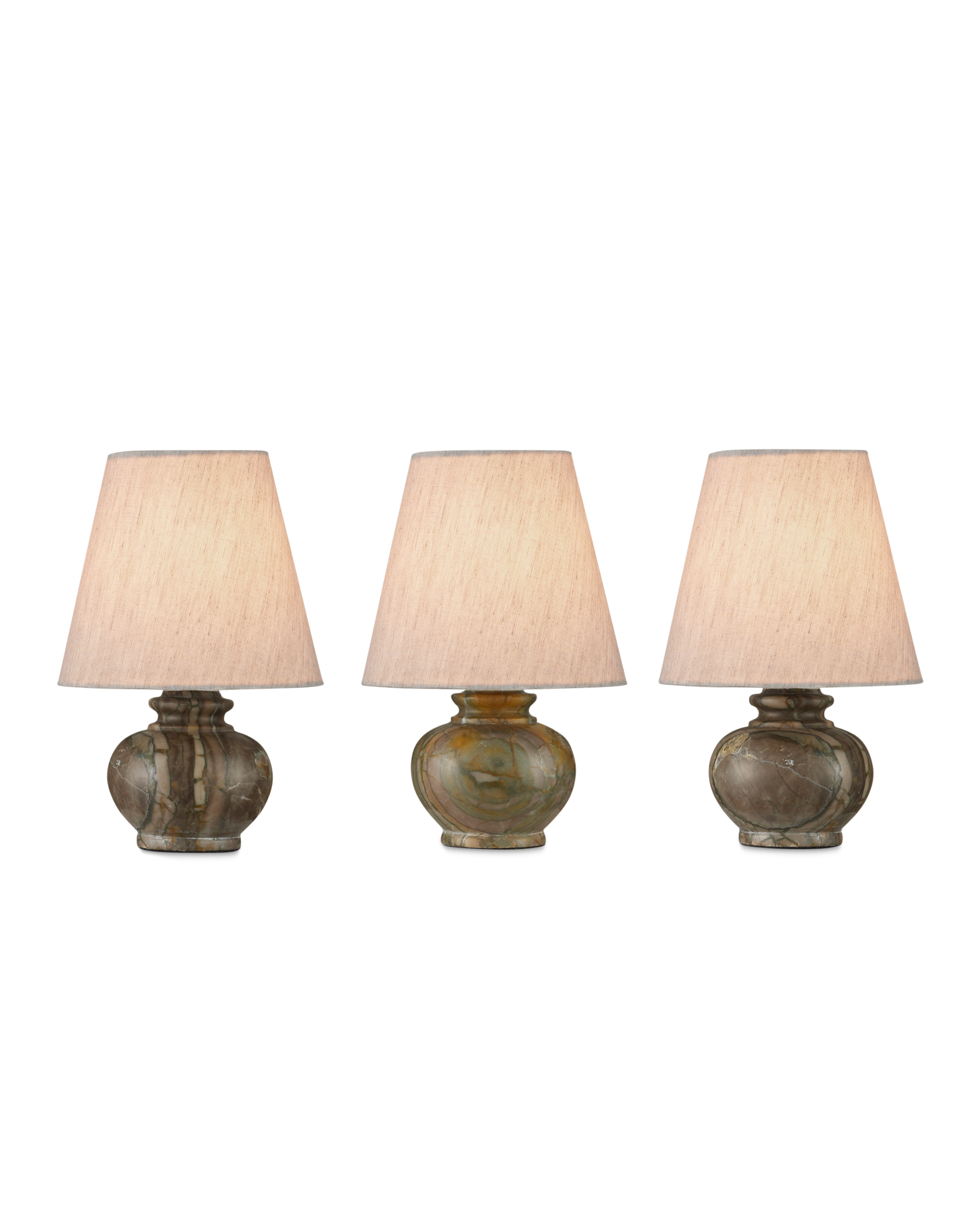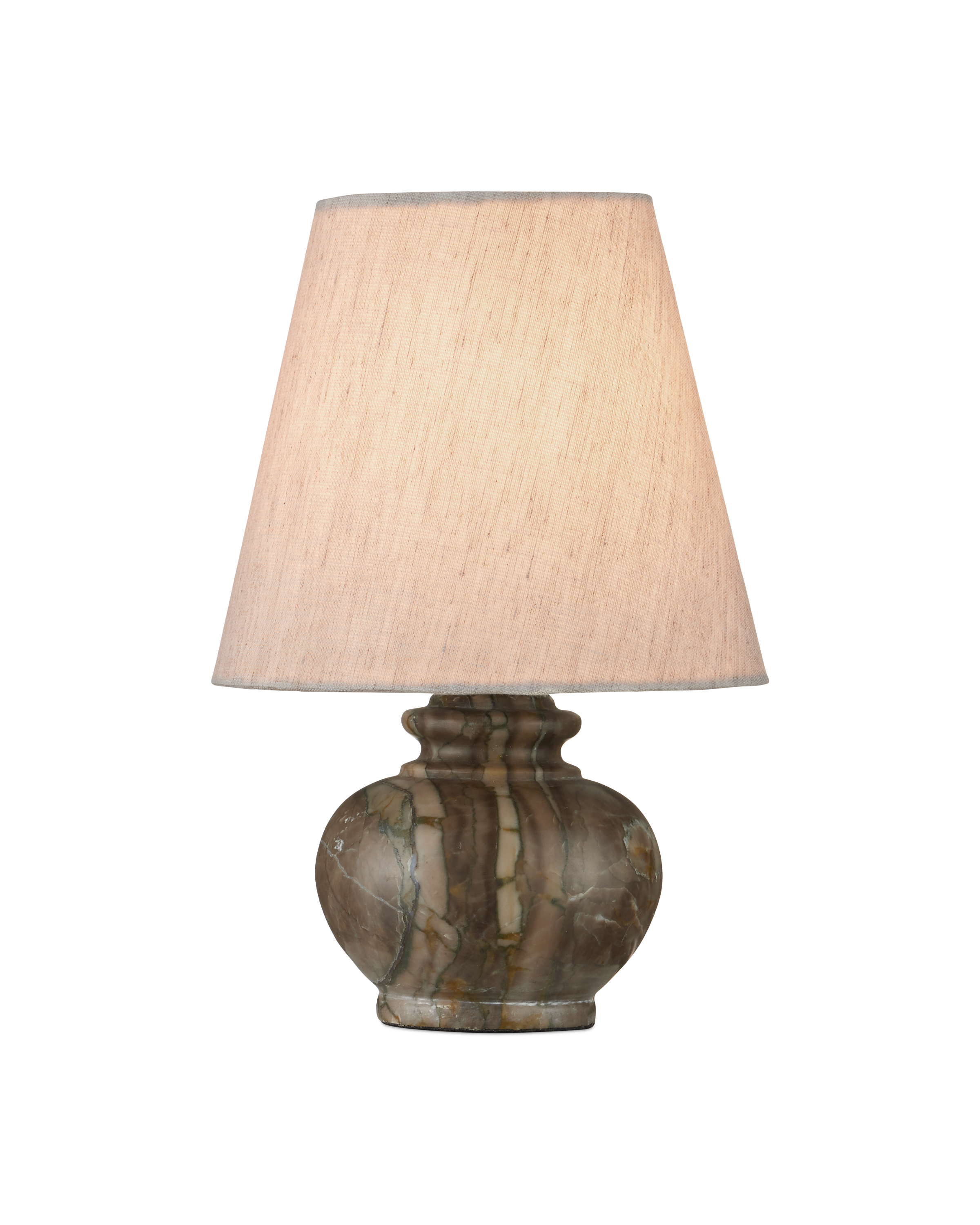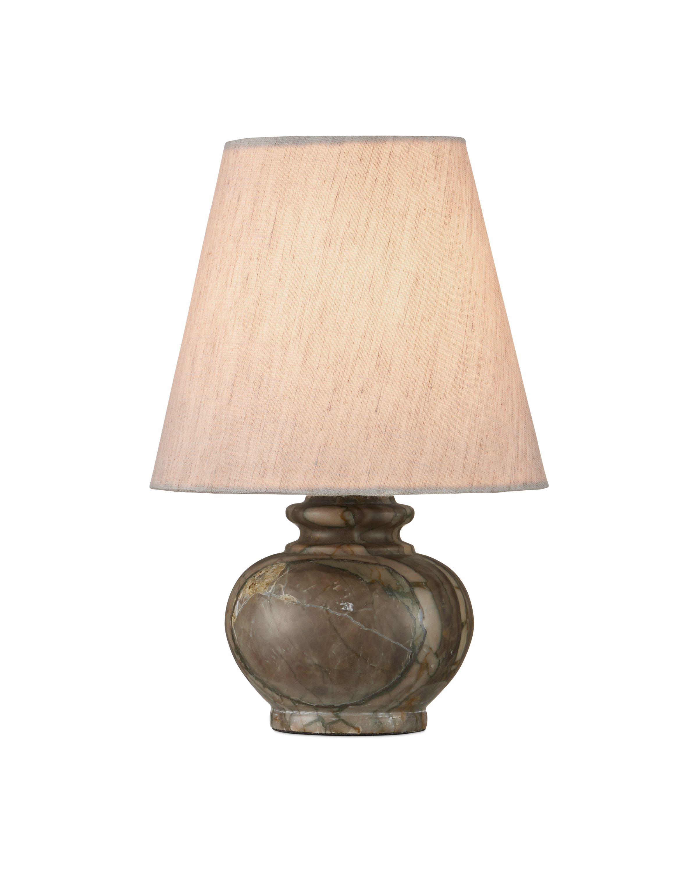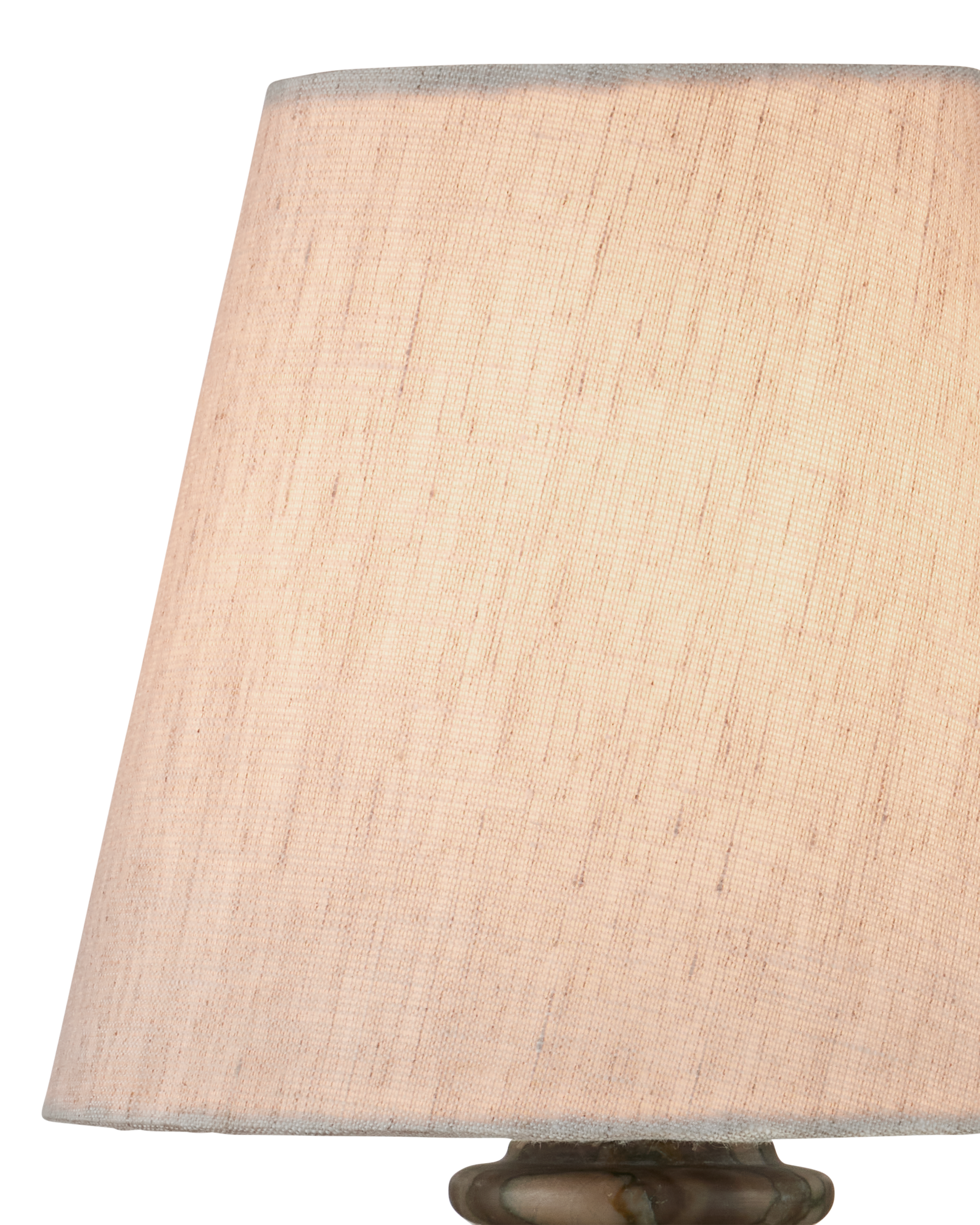 The Piccolo Pistachio Mini Table Lamp is a petite accent piece crafted from Pistachio Green marble that features soft pink tones and natural veining to make each lamp unique. Inspired by a vintage design, it stands just 4.5 inches high to the bottom of the off-white linen shade, making it perfect for tucking into bookcases, shelving, or layered decorative vignettes.