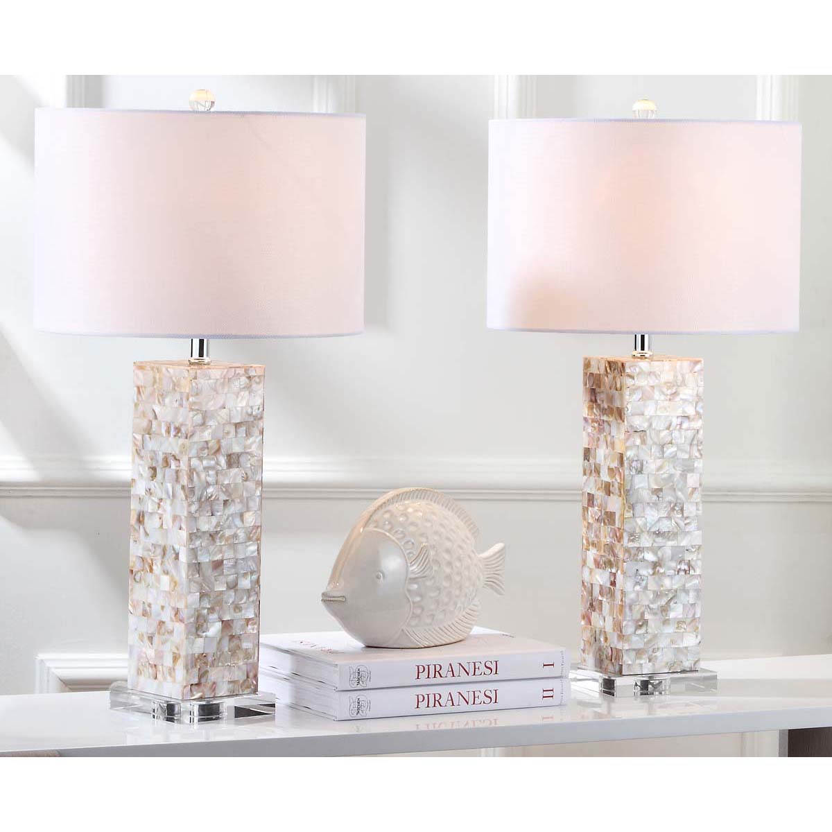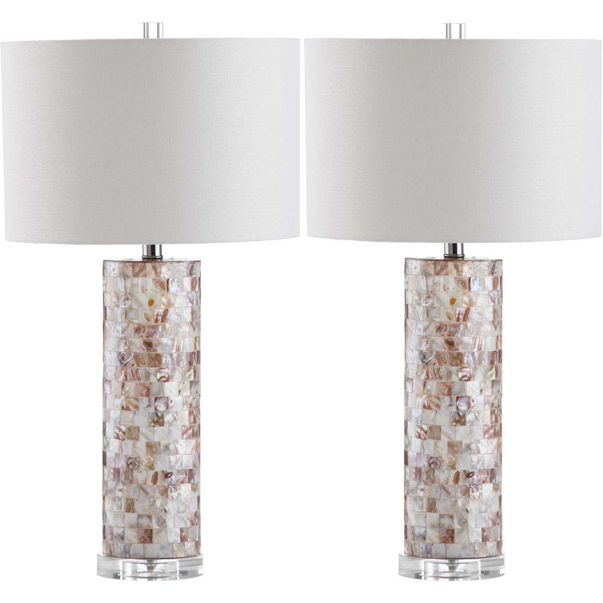 Naturally elegant, the set of two Jacoby Table Lamps features a column base finished with a mosaic of capiz shell tiles. A white cotton drum shade sits atop this romantic lamp set, replete with a clear acrylic pedestal and finial for a hint of glamour.