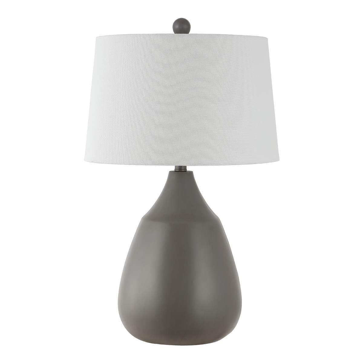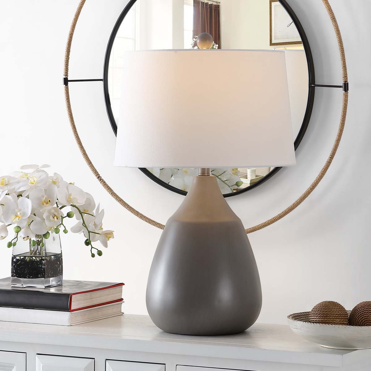 Bring substantial style to your d?cor with this eye-catching Sinrus Table Lamp. Sinrus?? soft grey finish and striking silhouette give any room a rich touch of decorative drama.