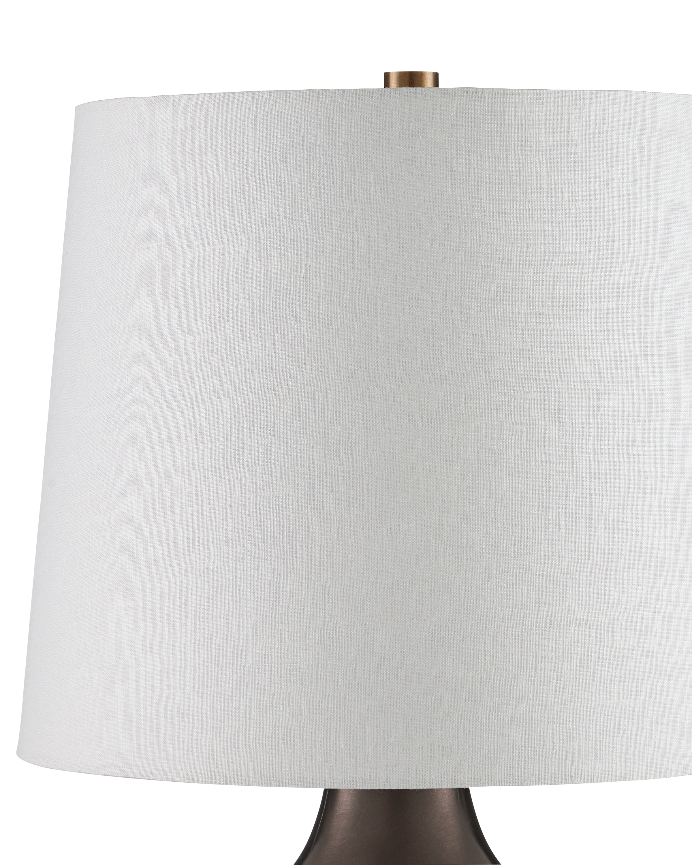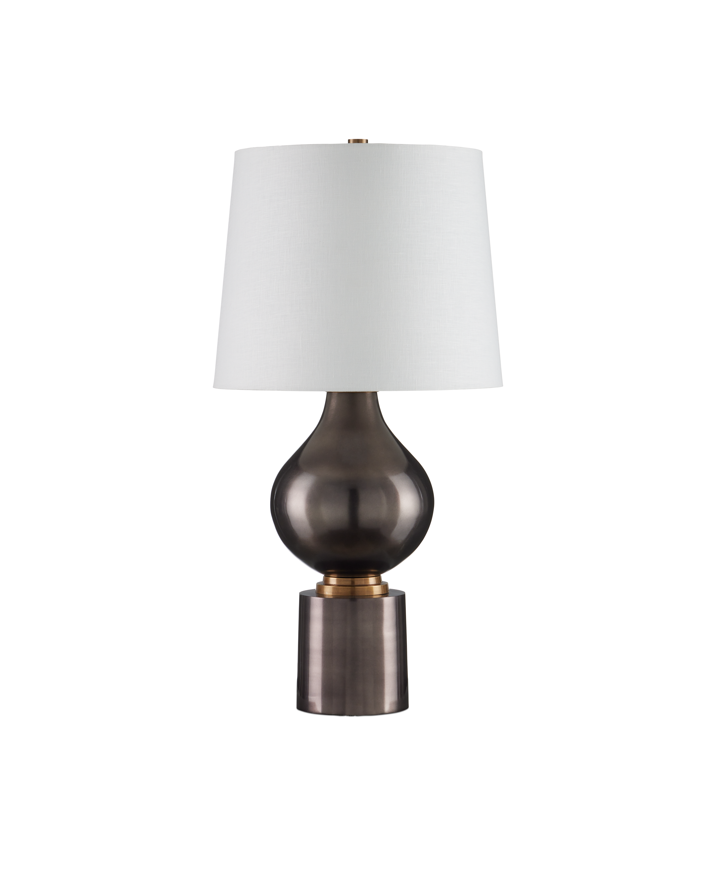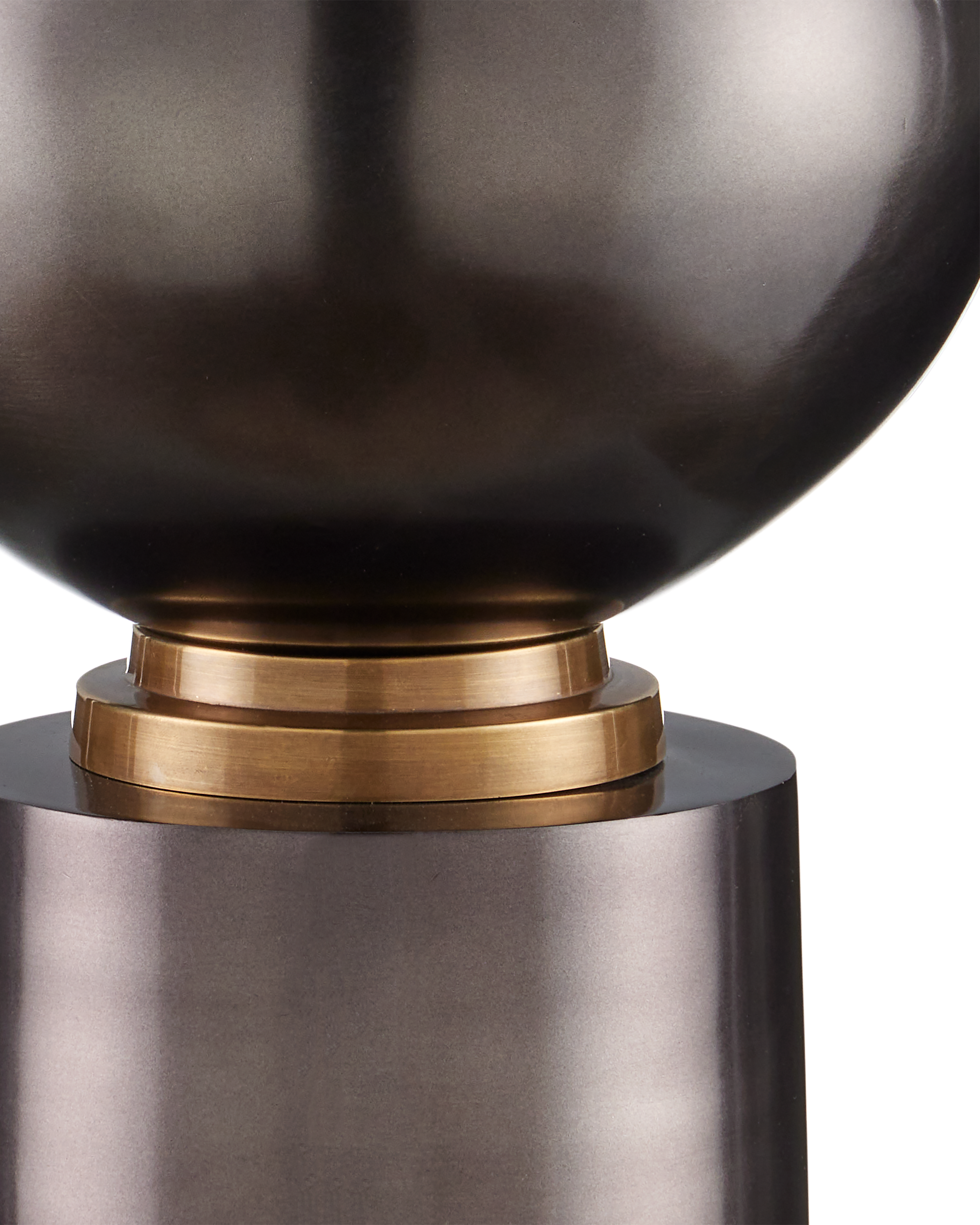 The Tamerlane Table Lamp has an elongated body that looks like a sophisticated trophy shape. Made of aluminum, the geometrical sections are covered in a mix of black nickel and vintage brass finishes. The contrasting brass is perfectly placed in the two rings cinching the body where the tall disc meets the vase shape and the finial.