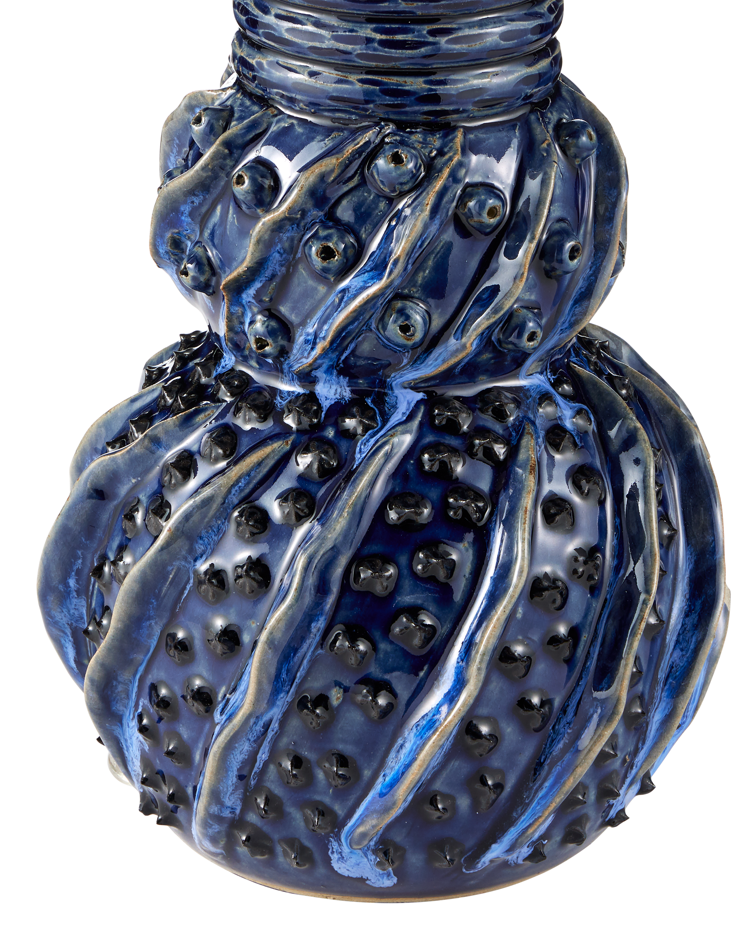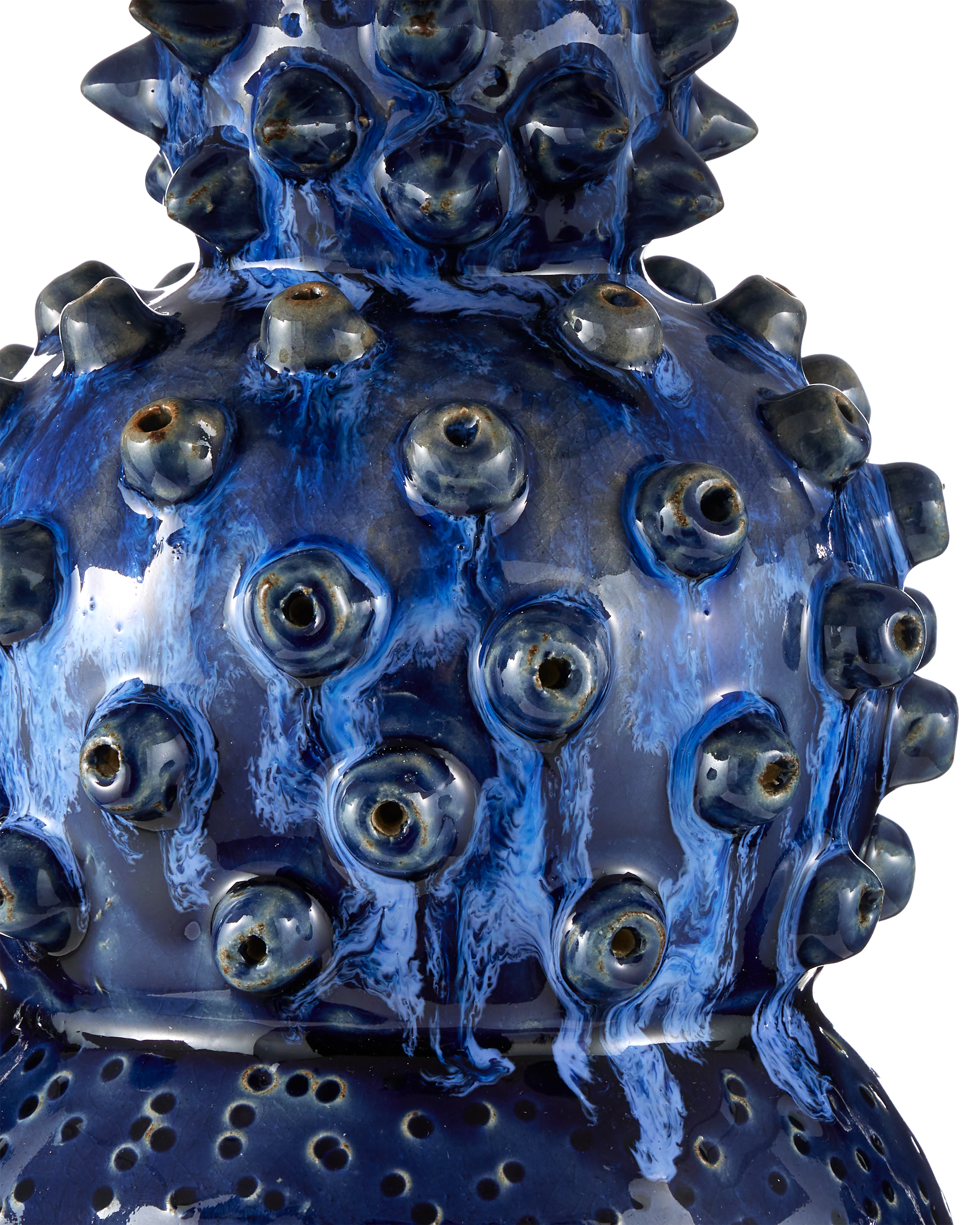 Stacked geometric shapes that represent coral and urchins are fired into an ornamental column to create the Undersea Dark Blue Table Lamp. Made of dark clay ceramic covered in a blue reactive glaze, the lovely creation was created by a group of women who live at the border of Burma and Thailand. Their agile hands manipulate, pinch, and affix textural decorative elements to the surfaces of their artistry, making each piece they create unique.