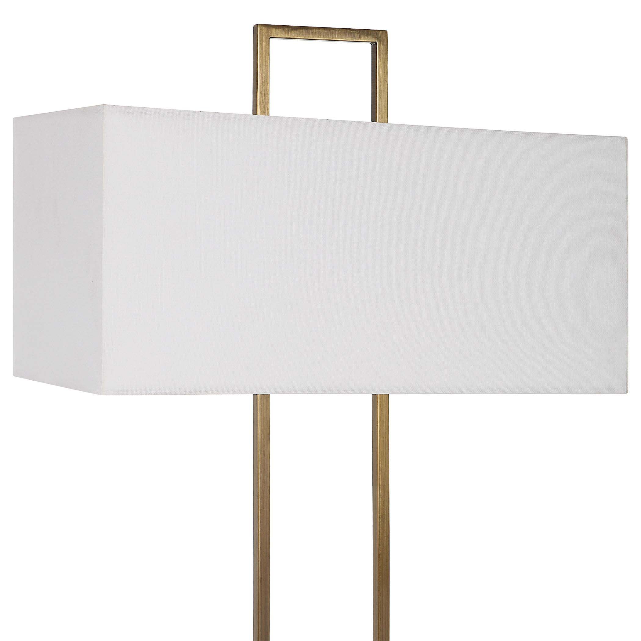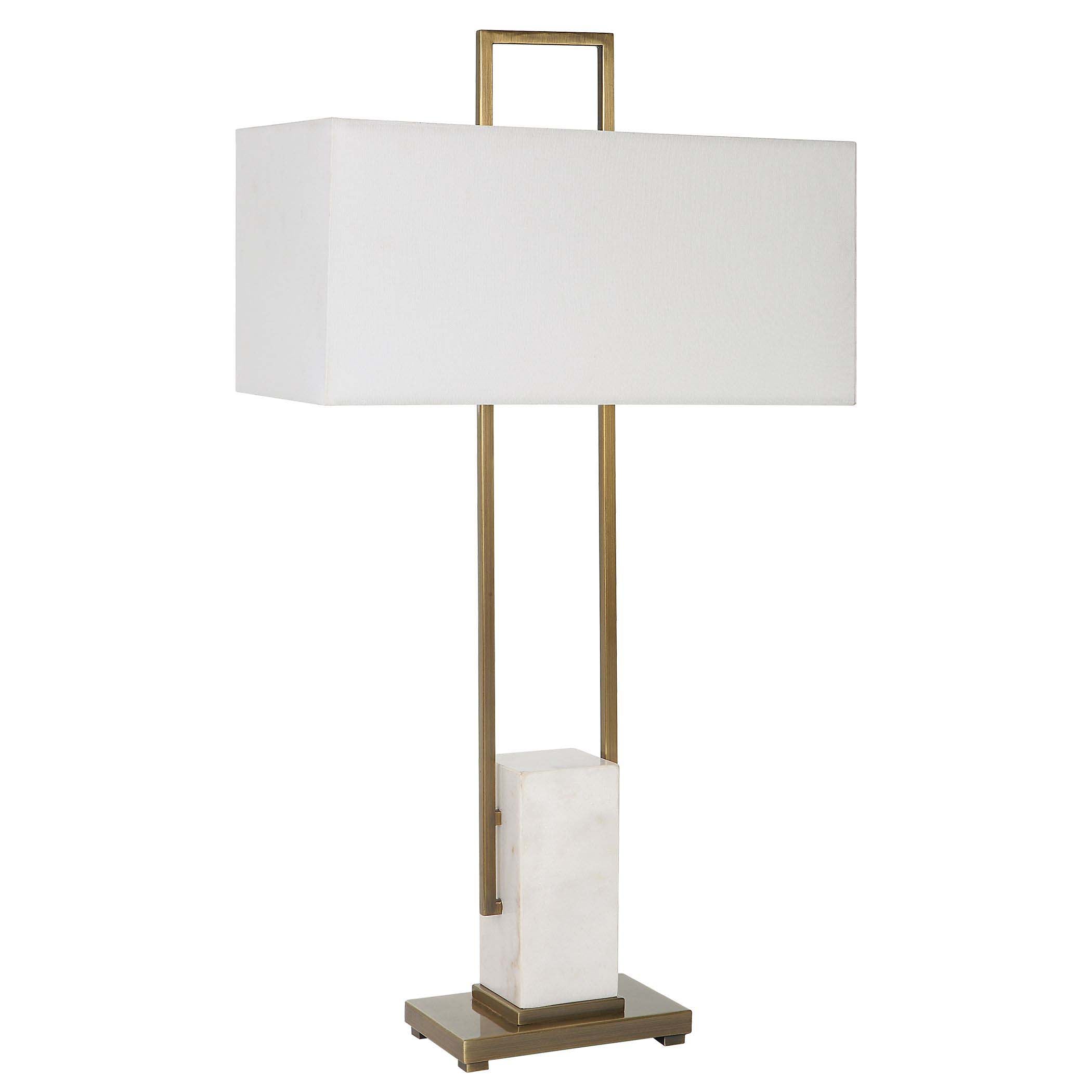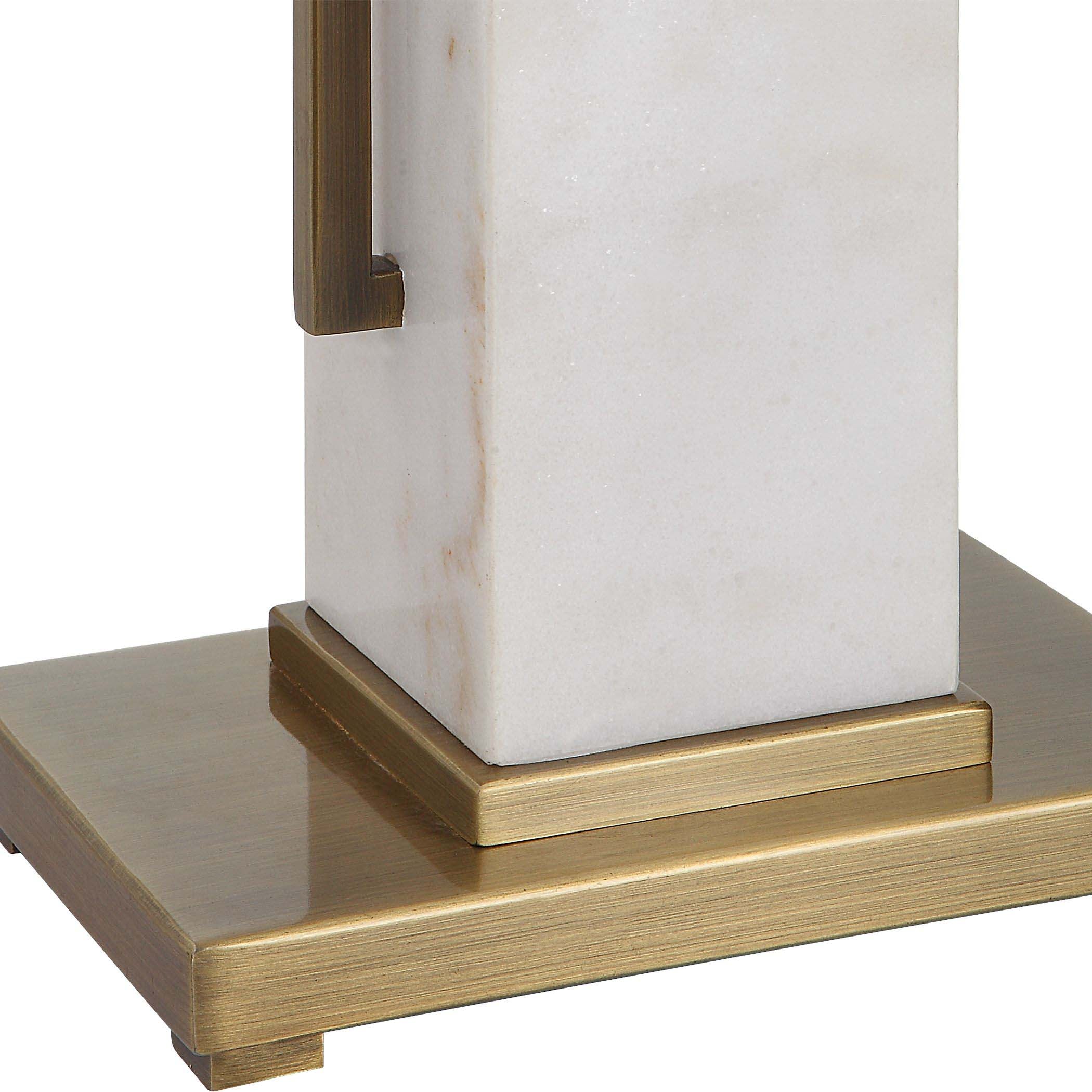 The Column Lamp Displays A Modern Look With Square Steel Bars Finished In Plated Brass And Matching Continuation Finial, Accented With A White Marble Pillar. The Rectangular Hardback Shade Is Covered In A White Linen Fabric.