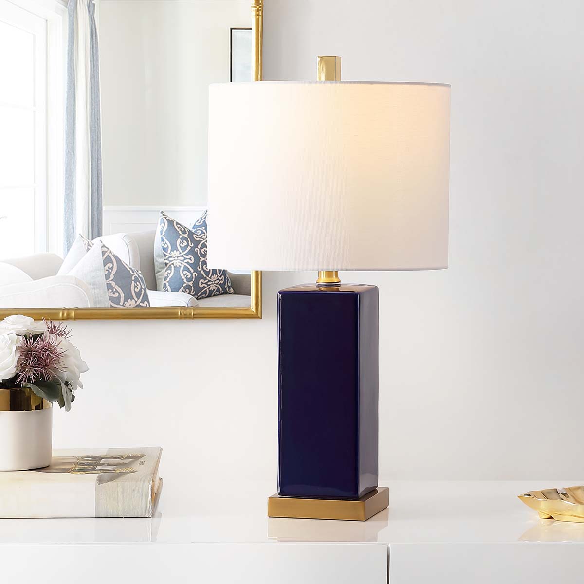 A petite skyscraper for your d?cor, this Wendi Table Lamp is absolutely iconic. Boldly toned navy ceramic pairs beautifully with its shining pedestal base, making for a streamlined look that perfectly balances its soft white drum shade.