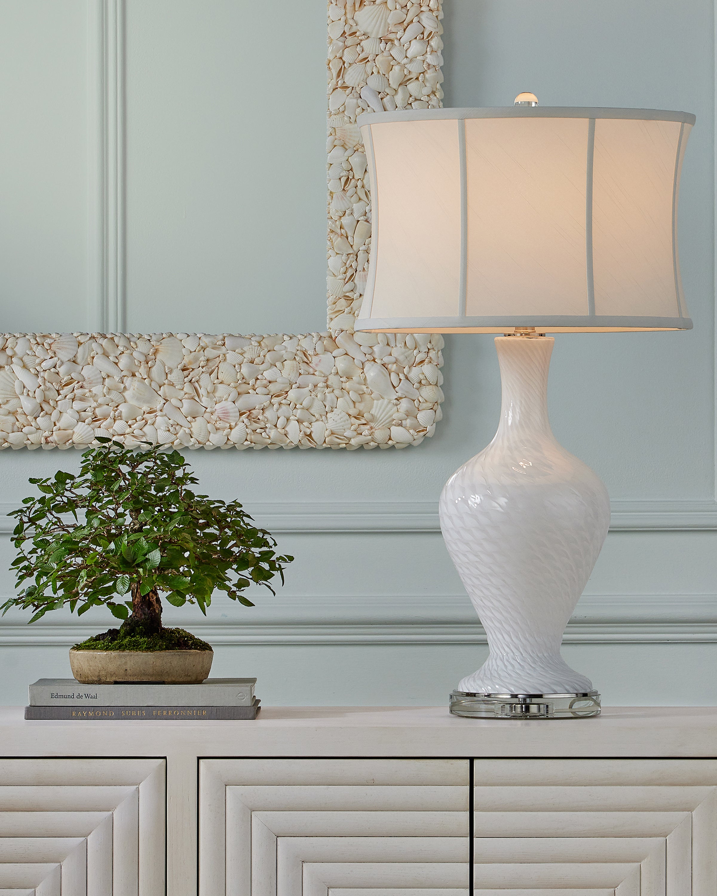 The Zeta White Table Lamp is crafted in the Venetian tradition of Zanfirico, a glassmaking technique perfected by Murano artisans in the nineteenth century. Rods of glass are fused and pulled to create delicate tone-on-tone patterns that ripple across the surface. Its crisp white form rests on an optic crystal base topped with a polished nickel step that adds a subtle metallic accent. A soft-back shade completes the silhouette.