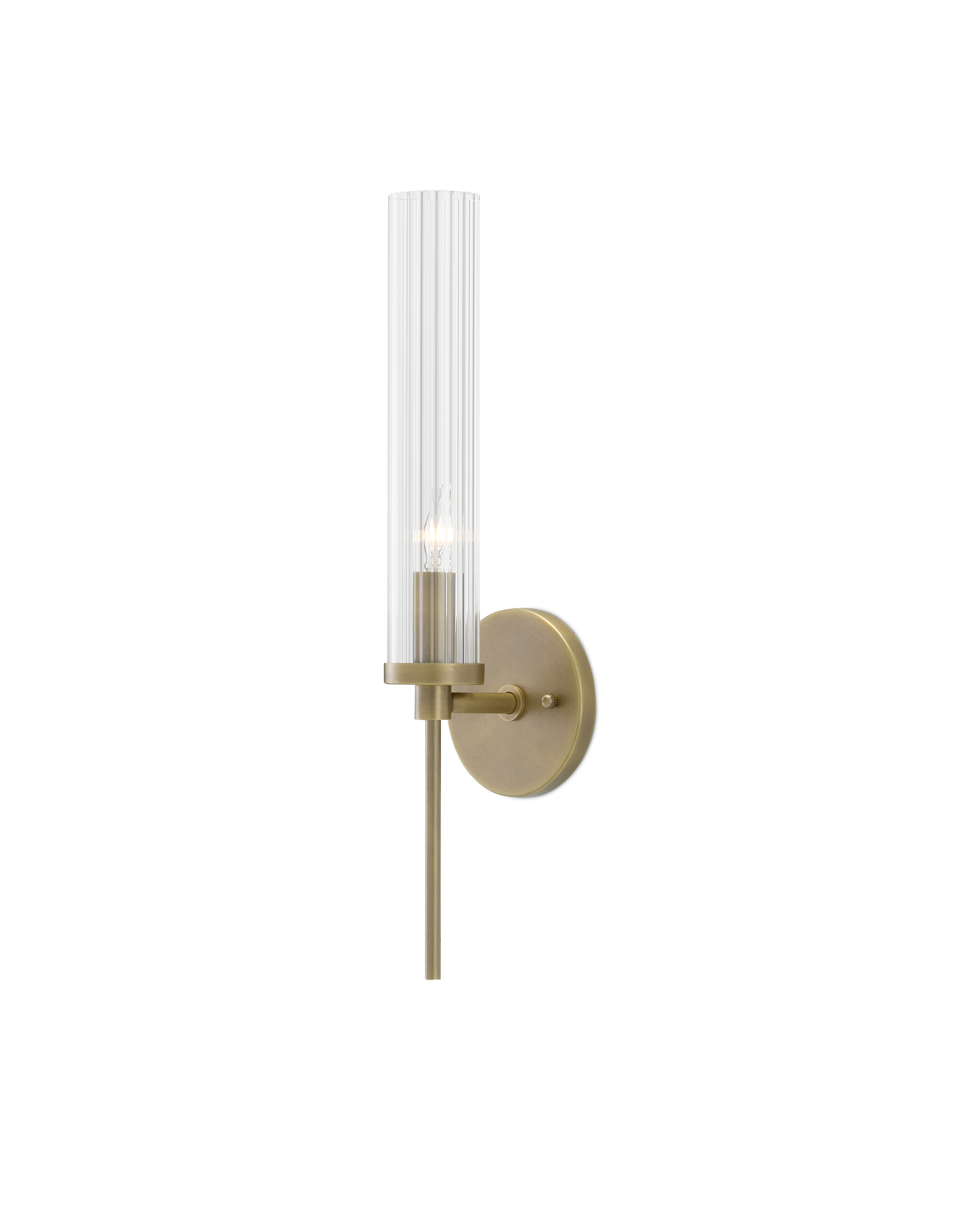 Slender in style, the Bellings Brass Wall Sconce has a pencil thin body and tall striated glass canister shade. Made of metal in an antique brass finish, the gold wall sconce is the very definition of simplicity but with a sophisticated complexity to its design. This wall sconce is certified for damp locations. Part of the Bagno Collection of wall sconces designed for bathroom spaces.