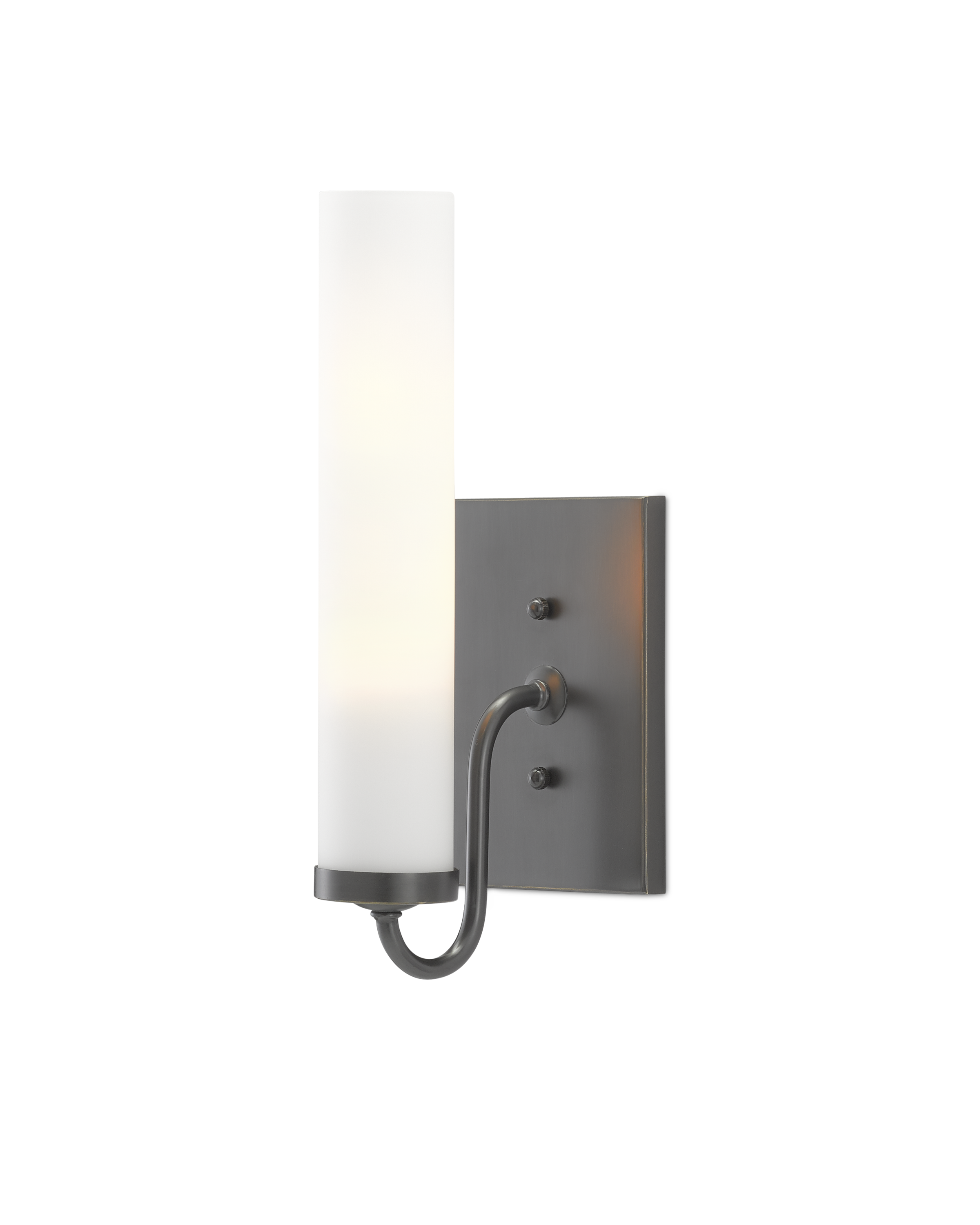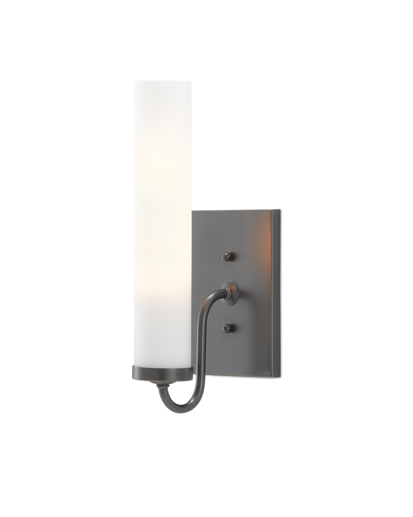 The arcing arm of the Brindisi Bronze Wall Sconce defines the gracefulness of this design, the disc-shaped bobeche atop the tubular support serving as the perch for the tall, thin opaque glass canister shade. Made of metal in an oil-rubbed bronze finish, the cleanly designed black wall sconce with its softly glowing white shade is certified for damp locations. Part of the Bagno Collection of wall sconces designed for bathroom spaces.