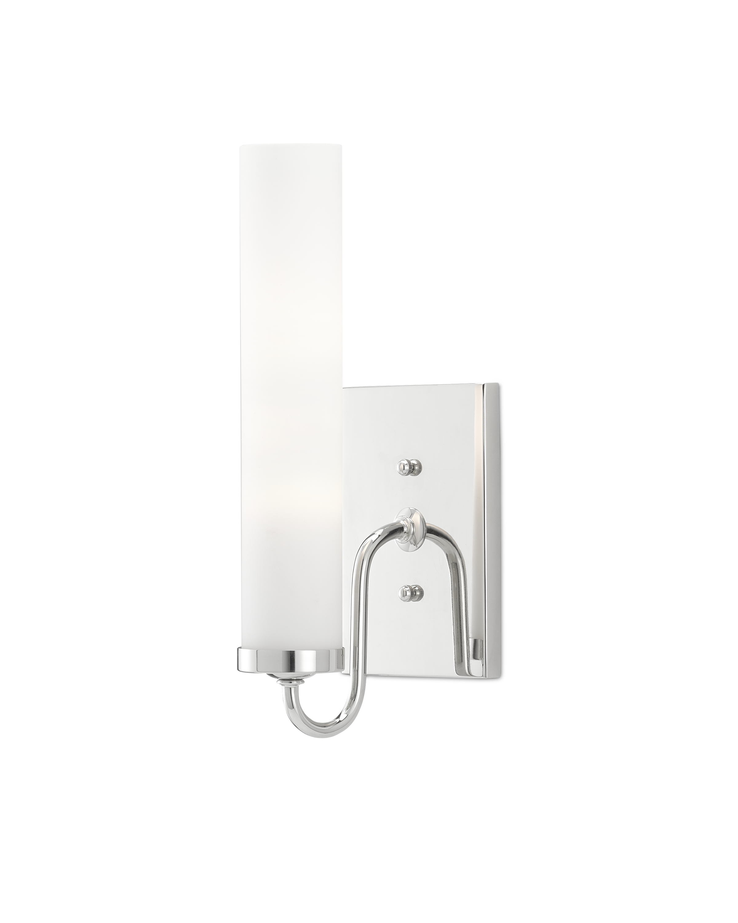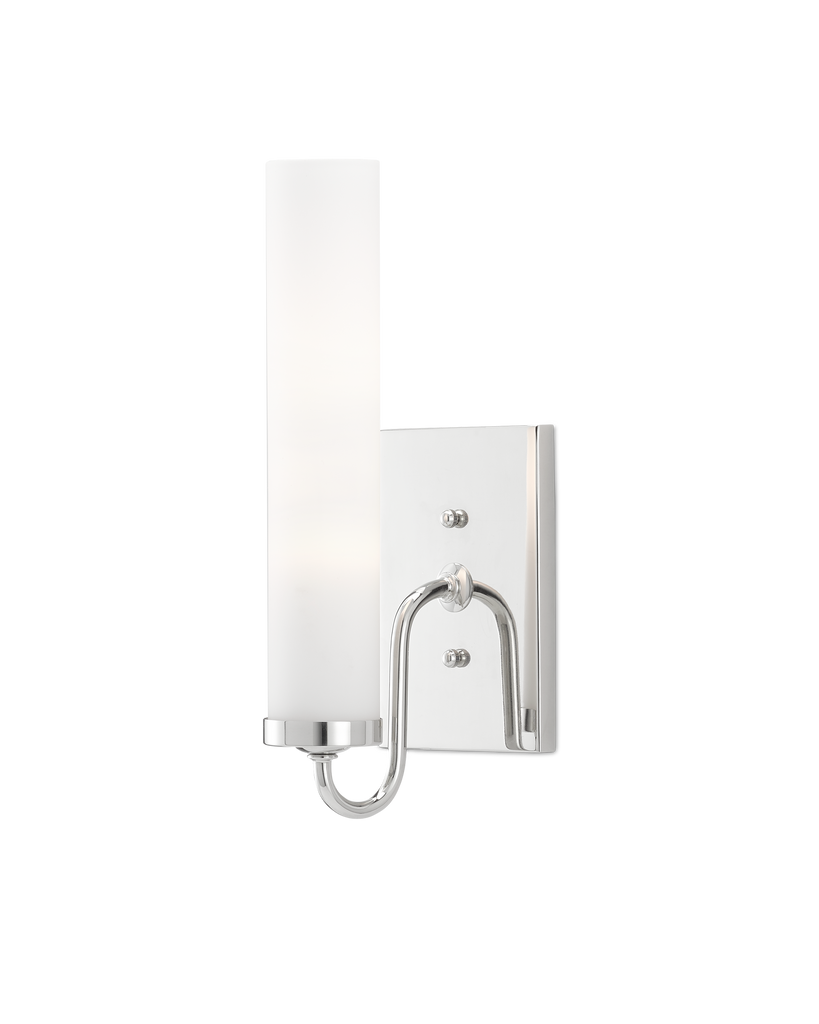 The arcing arm of the Brindisi Nickel Wall Sconce defines the gracefulness of this design, the disc-shaped bobeche atop the tubular support serving as the perch for the tall, thin opaque glass canister shade. Made of metal in a polished nickel finish, the cleanly designed silver wall sconce with its softly glowing white shade is certified for damp locations. Part of the Bagno Collection of wall sconces designed for bathroom spaces.