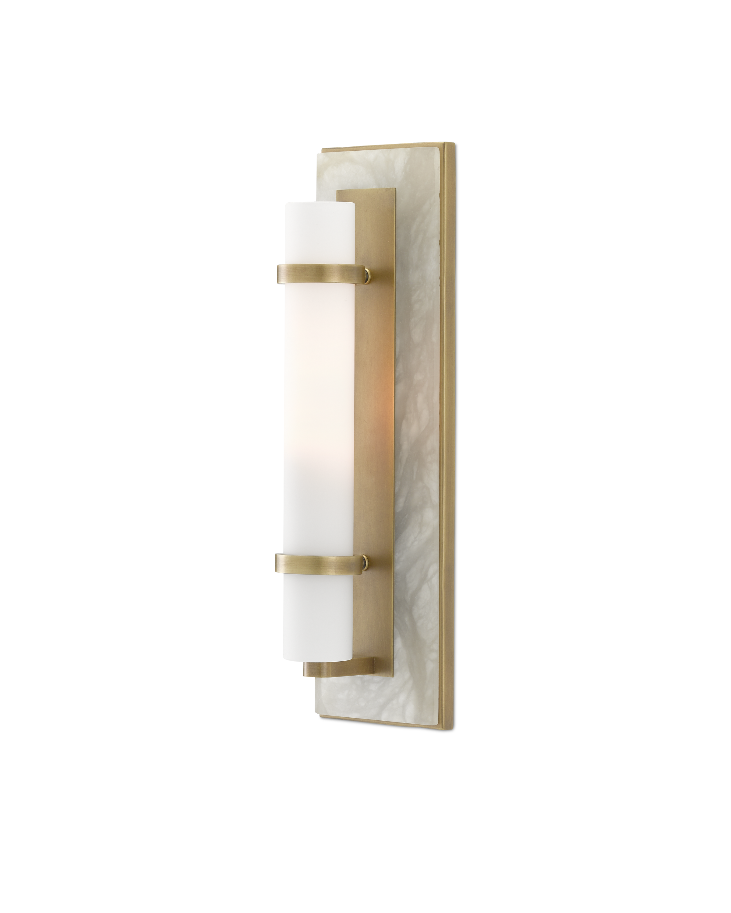A masterful mix of materials describes the Bruneau Brass Wall Sconce. From the cloudy alabaster panel affixed to the wall plate, the metal in a warm antique brass finish, and the soft glow of the opaque glass shade, the layering of this design is sophisticated. The strap-like circlets that fasten the shade to the wall plate on this gold wall sconce is a design detail worth noting. Part of the Bagno Collection of wall sconces designed for bathroom spaces.