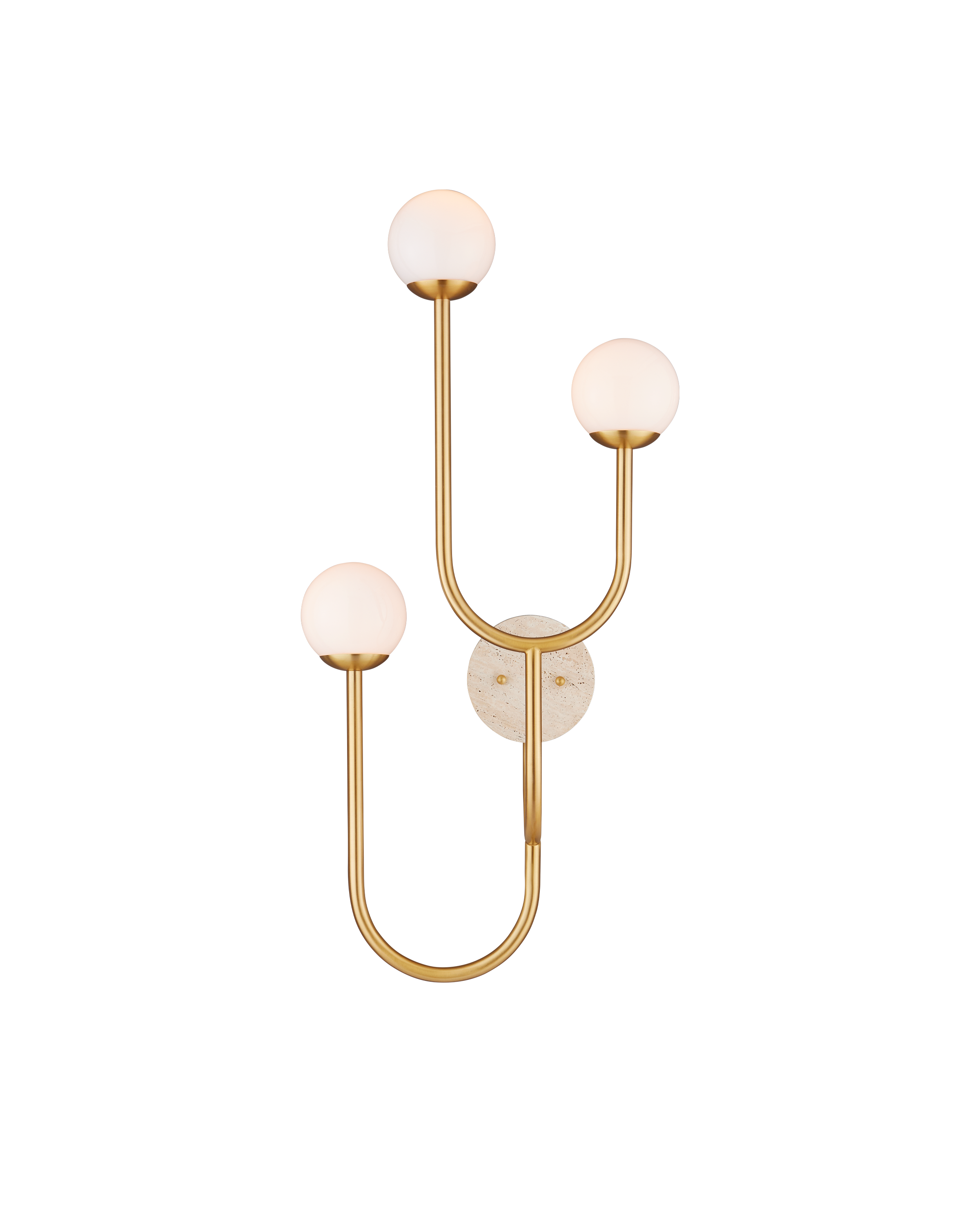 A nostalgic design with milk glass globes that have been popular since Americana was new, the Highsmith Wall Sconce, Left, has an undulant personality. The metal stems that arc up to culminate in three heights on the gold sconce are in a brass finish, as are the brads that fasten the travertine wall-plate in place. The mix of these materials is a refined design detail on this sconce that has a right-facing partner for flanking fireplaces or beds.