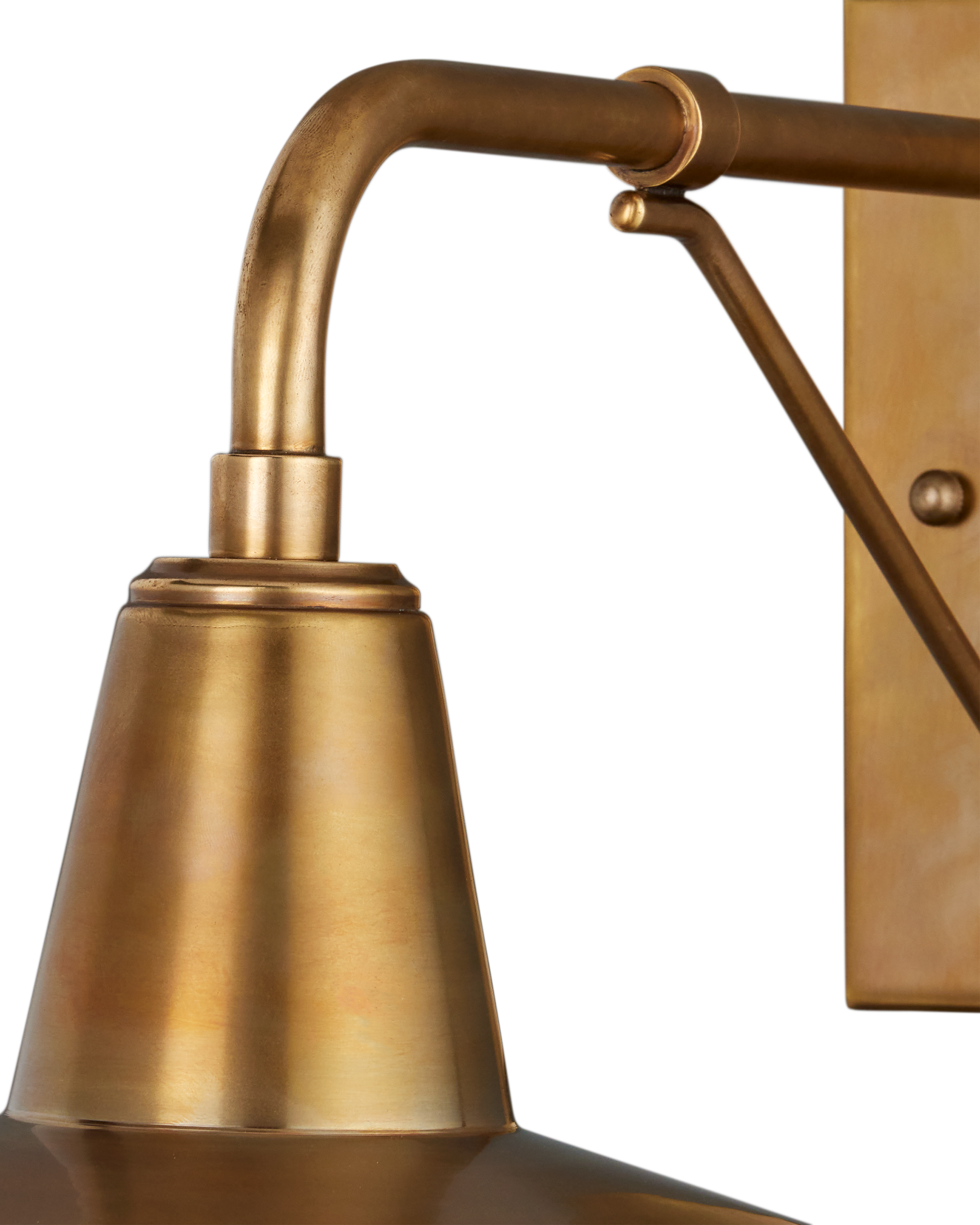 With its modern farmhouse feel, the Mariner Brass Outdoor Wall Sconce is made of brass in an antique brass finish. The warmth of the gold coloring with its textural patina, the shape of the geometric elements, and the simplicity of its form are the aspects that combine to make it a nostalgic design born during the early years of the Americana aesthetic.