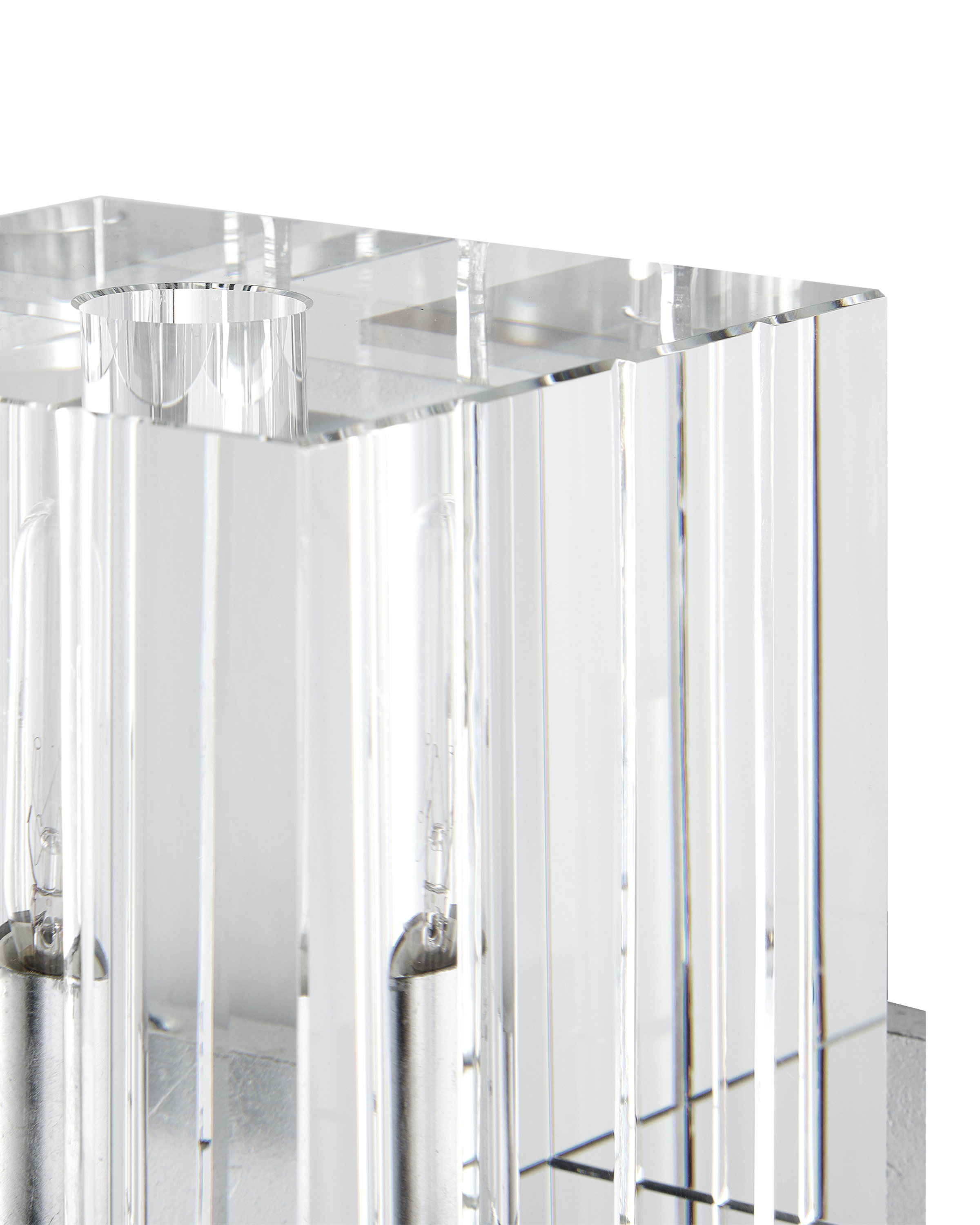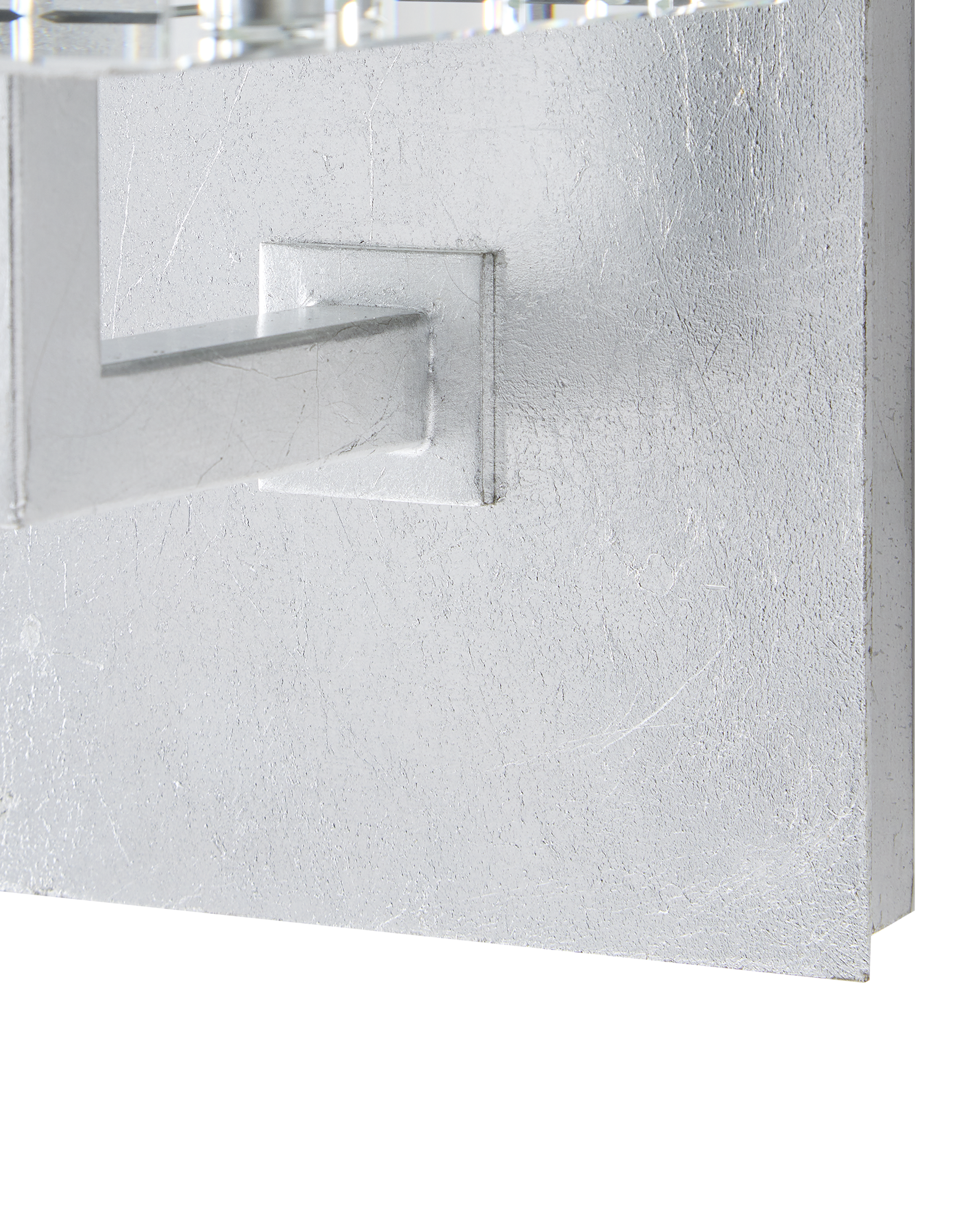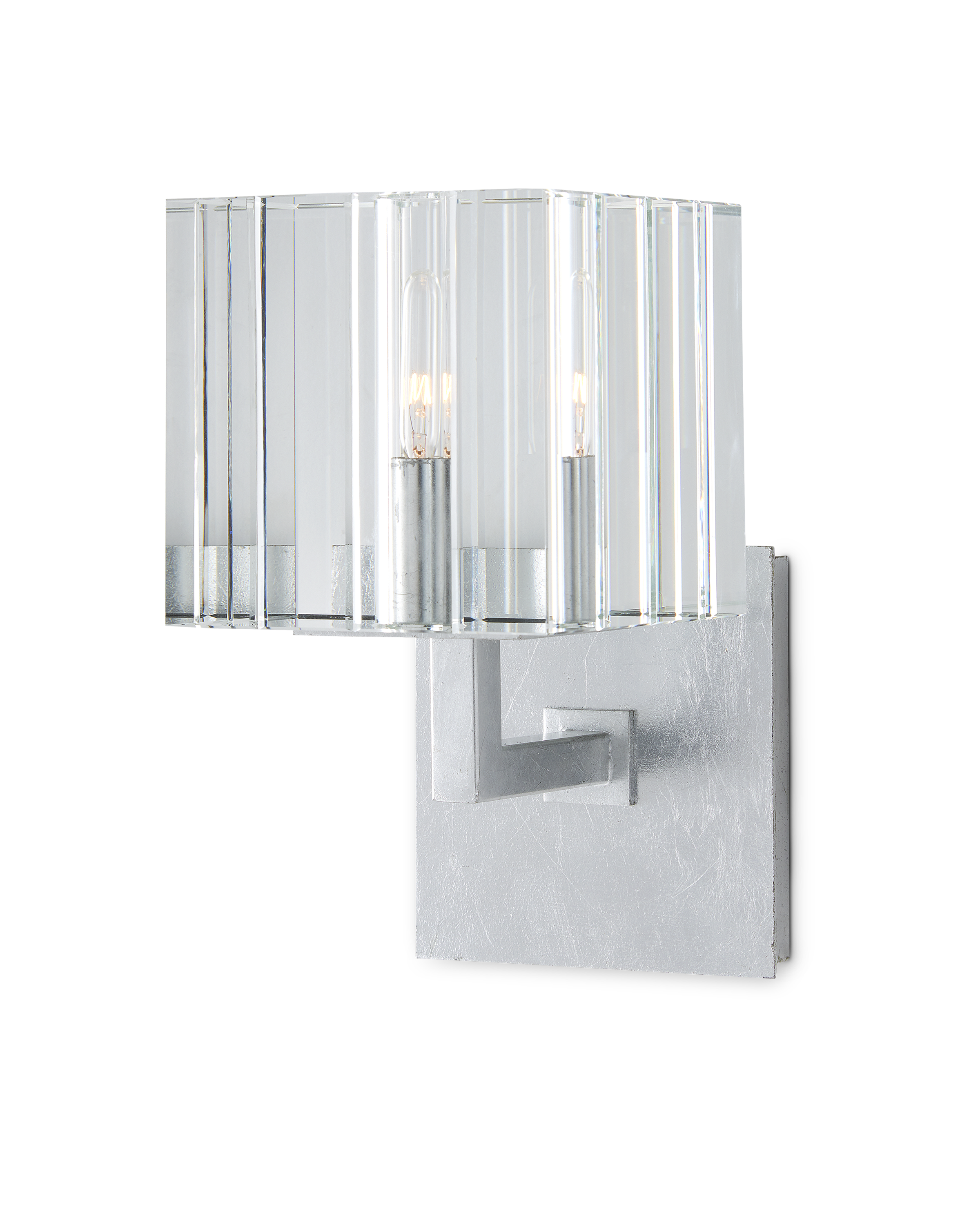 The clean-lined backplate of the Valerio Wall Sconce is set with a solid optic crystal block with small holes drilled in the center into which the bulb is inserted. Ian Thornton, who designed the silver sconce, says, "Lines are carved into the sides of the crystal cube to create more refraction and enhance the sparkle of the fixture." The Valerio has a silver leaf finish that also contributes to the overall brightness of the crystal sconce.