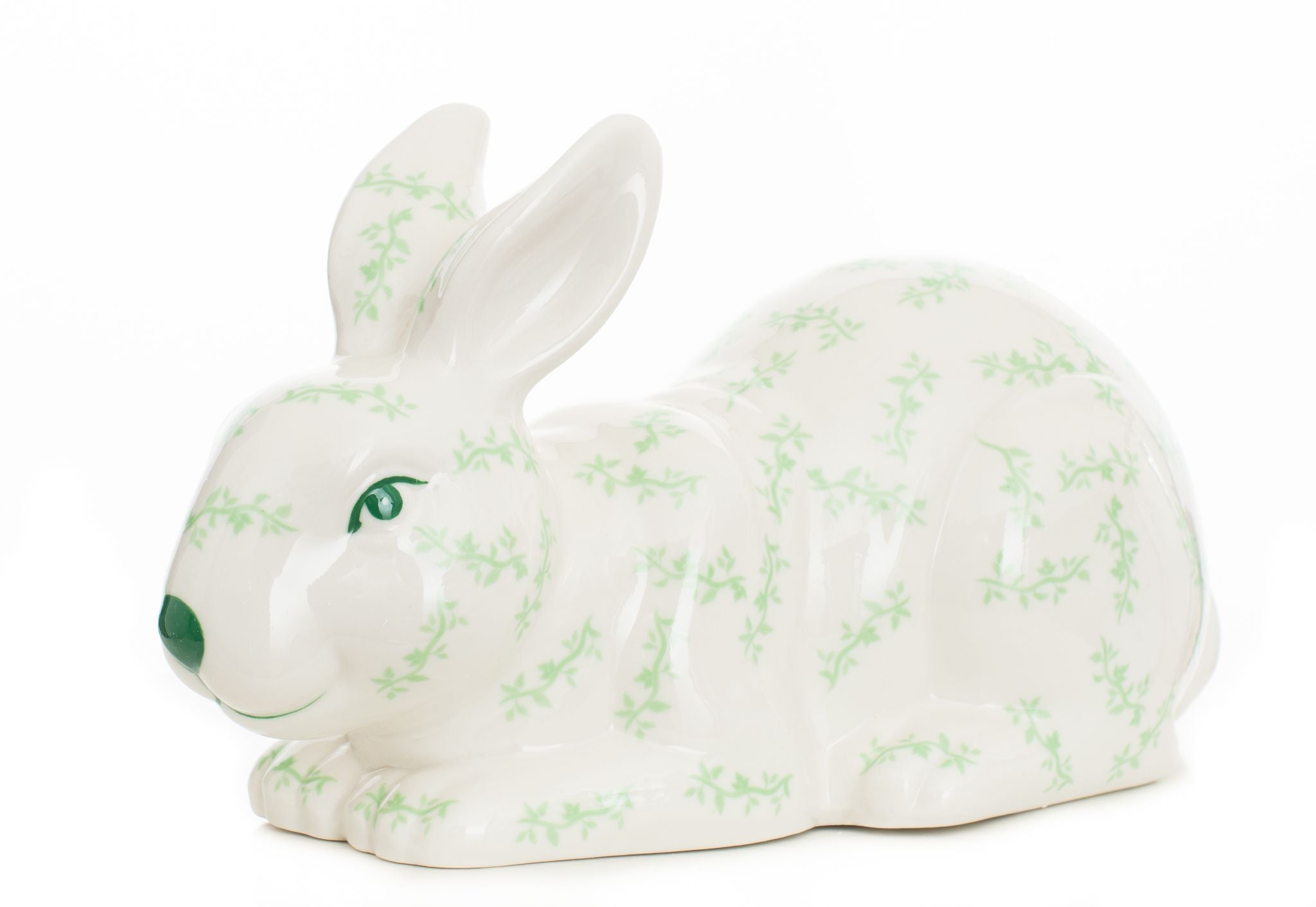 Add a whimsical touch to your décor with this charming green and white porcelain bunny. This bunny is perfect for adding a touch of playful elegance to your home.