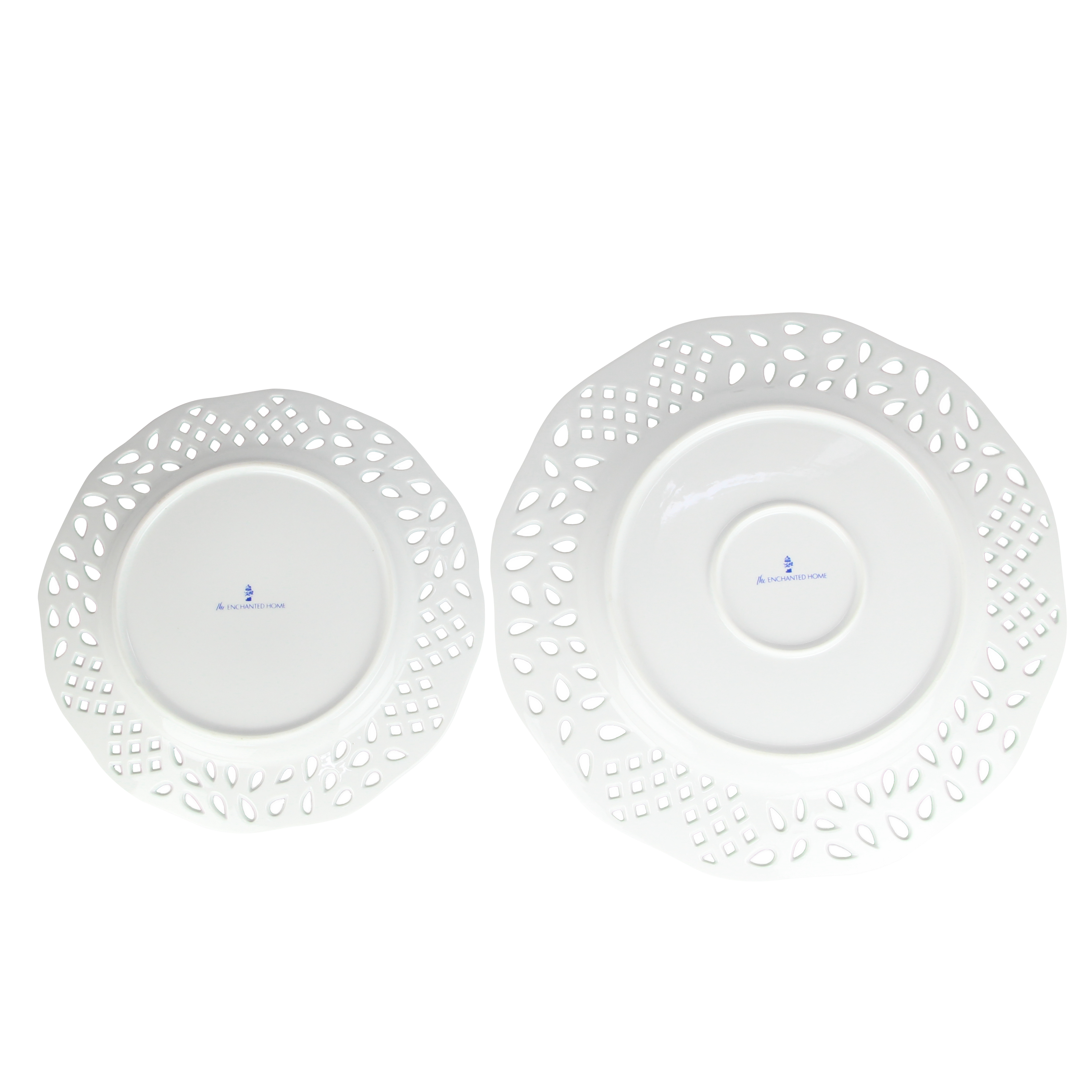 Elevate your dining experience with our Pierced Dinnerware collection. This exquisite set includes a dinner plate, salad plate, and charger. Crafted to perfection in pure white, these pieces exude elegance and charm, capturing the essence of timeless sophistication. Whether used individually or as a complete set, they effortlessly enhance any table setting with their delicate detailing and versatile appeal.