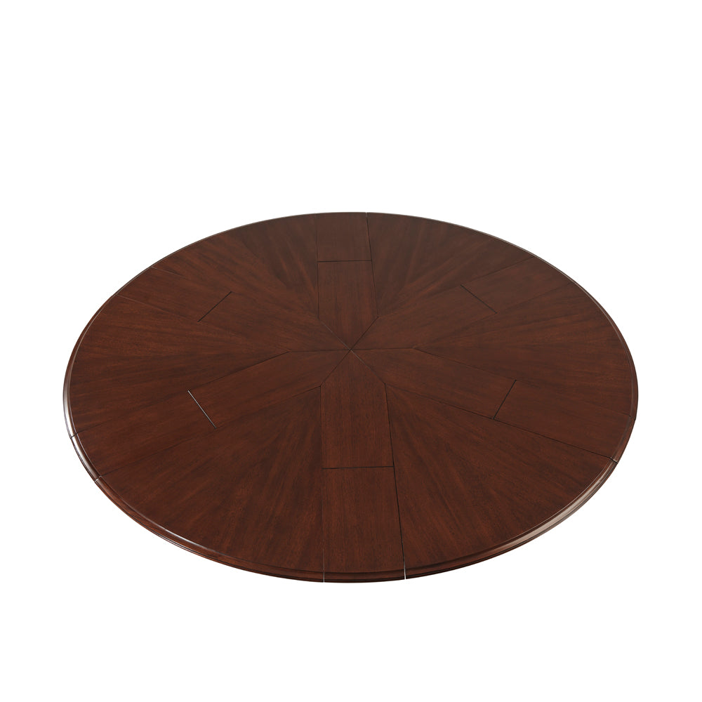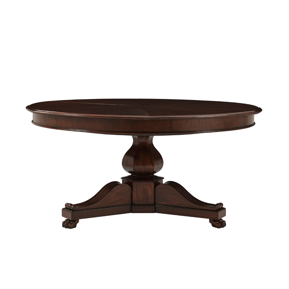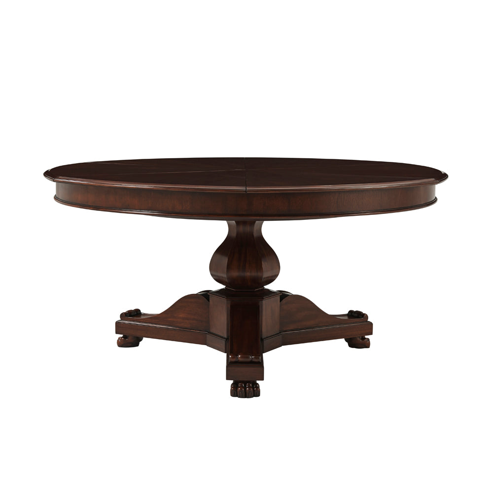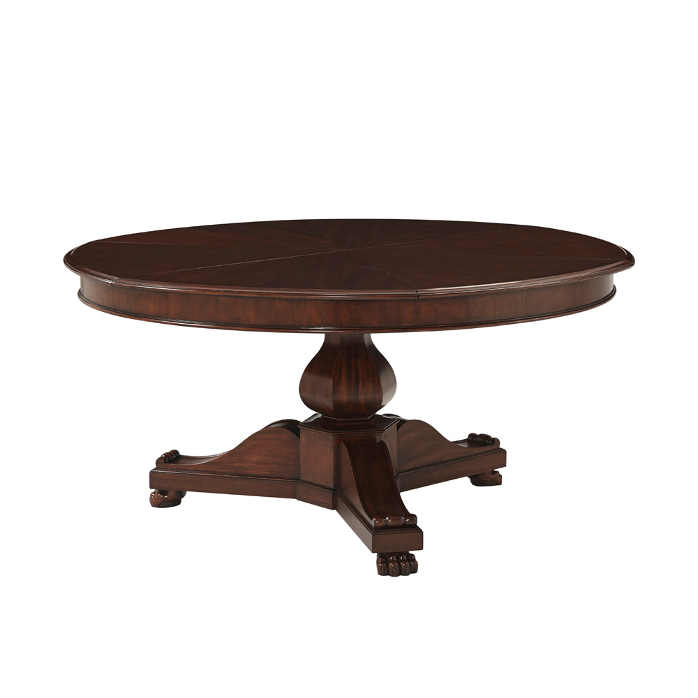 Leo is a Restauration revival table with carved pedestal, inset fold out leaves, scrolled tri-base and claw feet, with radiating veneer top.