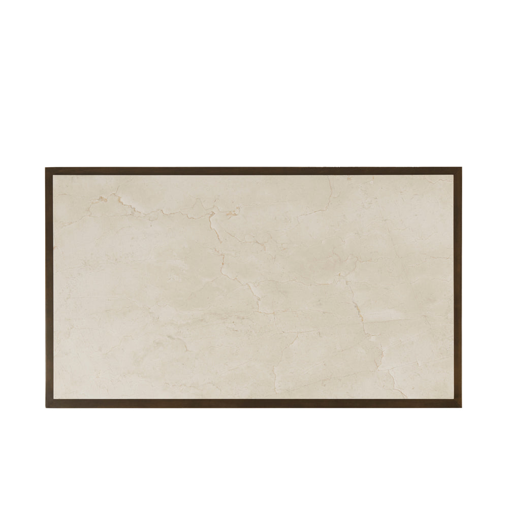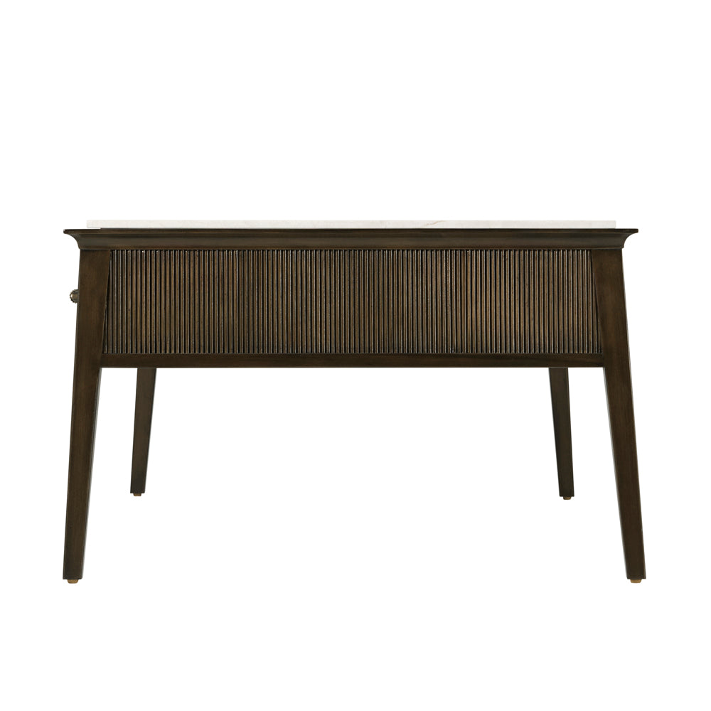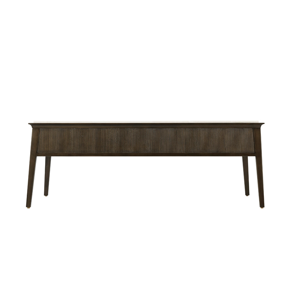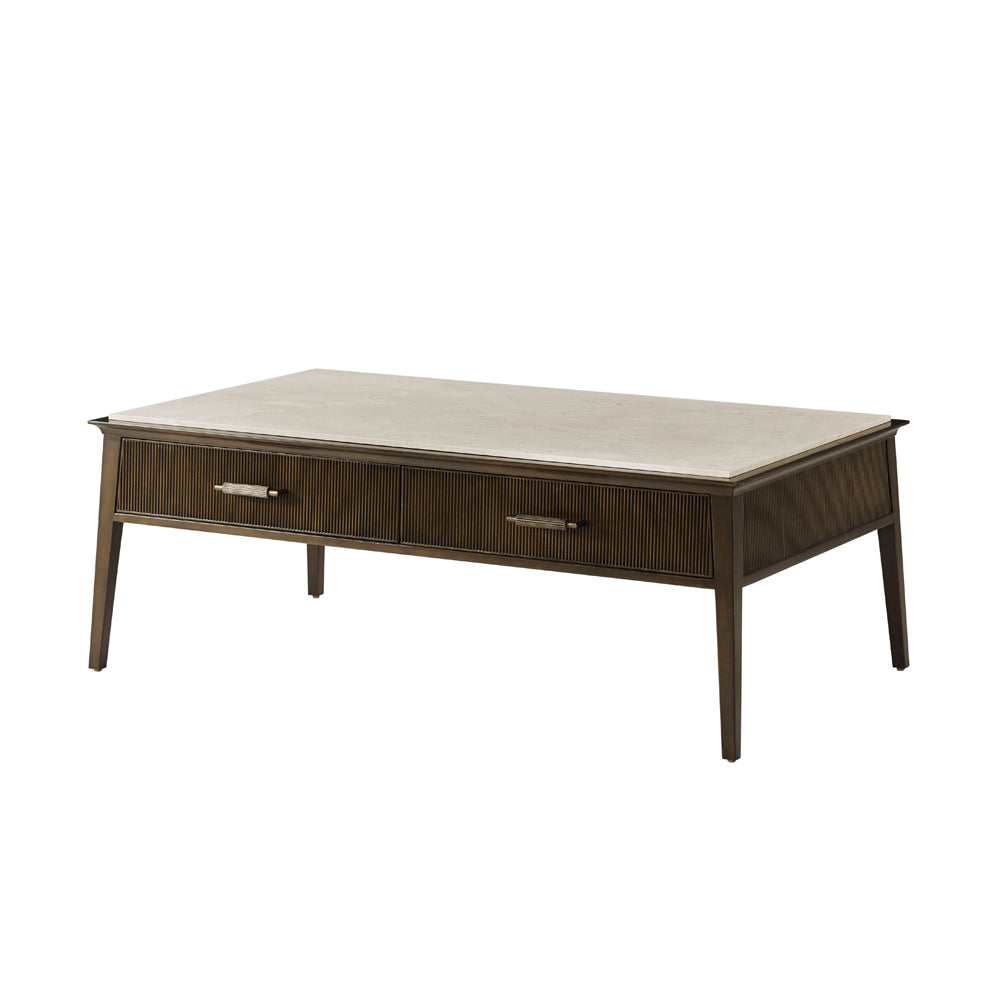 The Lido Cocktail Table, crafted from Prima Vera veneer in our dark Bistre finish and complimented by a beautifully honed inset Crema Marfil marble stone top, features a sophisticated tapered silhouette, reeded detailing and two drawers. The custom forged hardware, finished in a dark rubbed bronze, echoes the reeded details throughout.