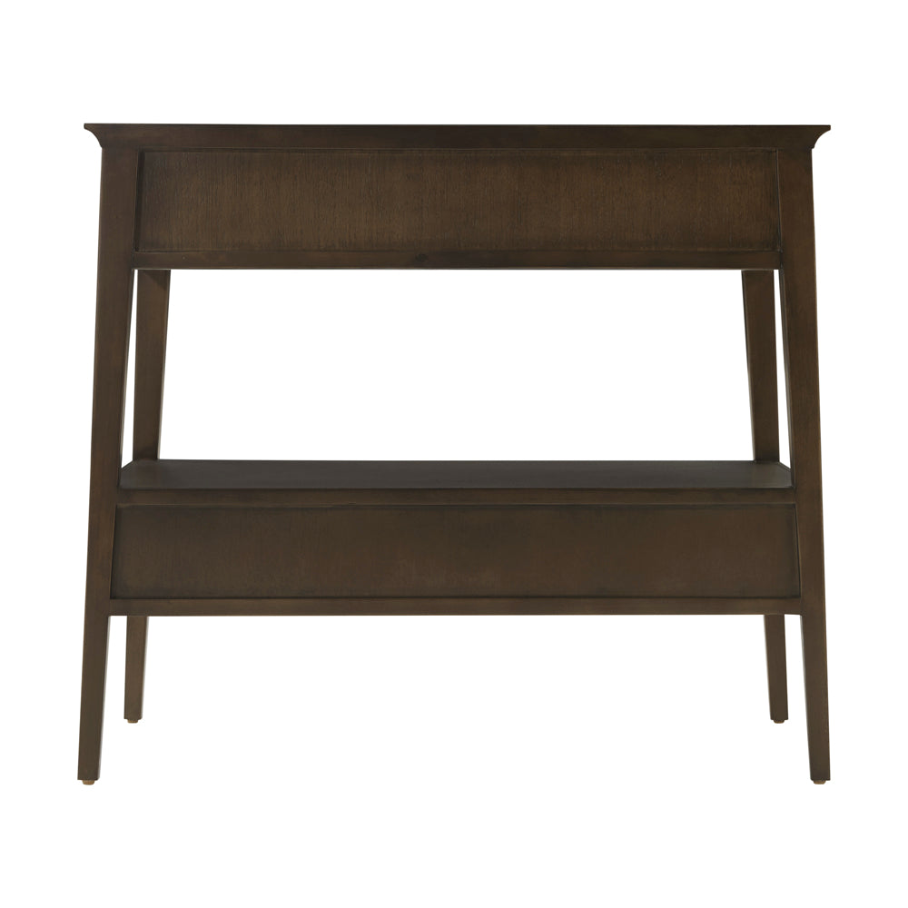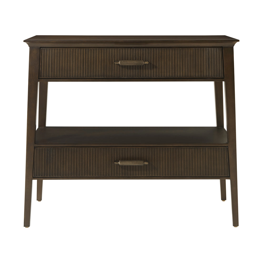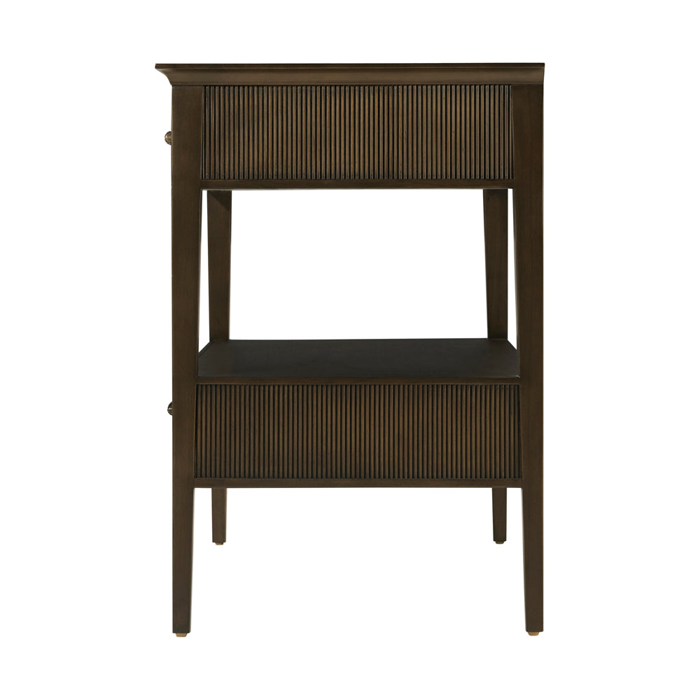 The Lido Nightstand III, crafted from Prima Vera veneer in our dark Bistre finish, features a sophisticated tapered silhouette with 2 reeded drawers for optimal storage. The custom forged hardware, finished in a dark rubbed bronze, echoes the reeded details throughout.